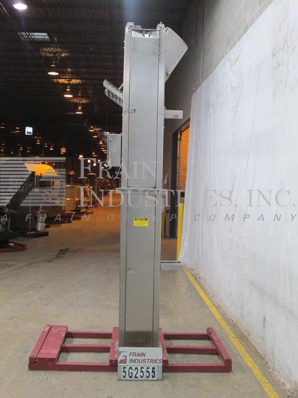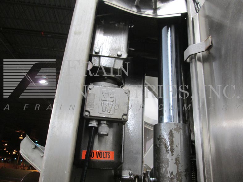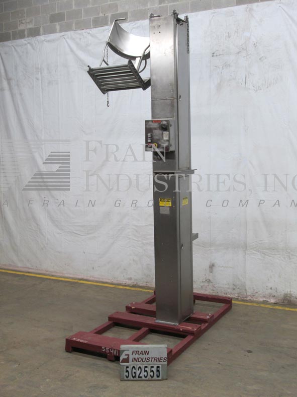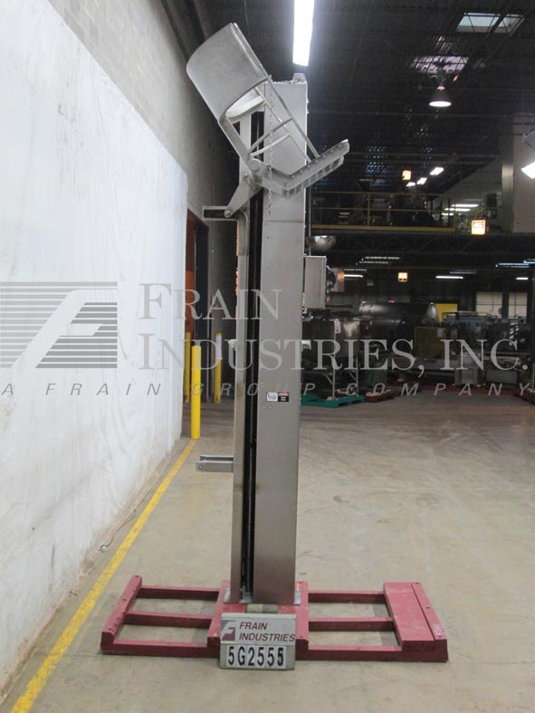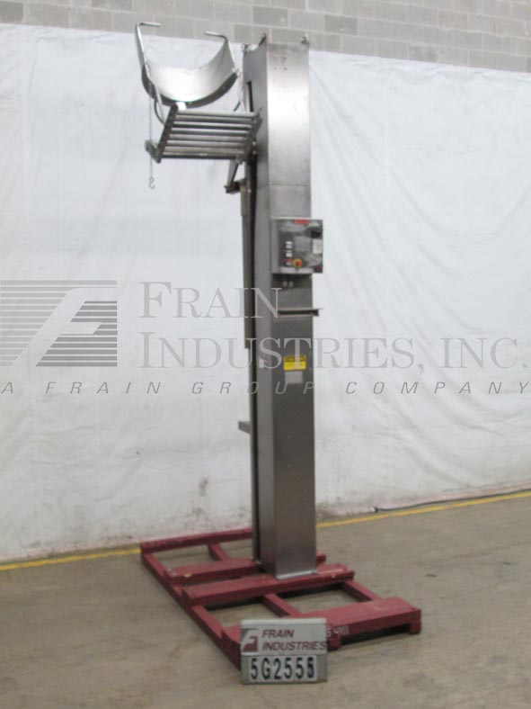 MTC, HLC2HD型,柱式翻车机。额定最大承载量为1000磅。配备有23英寸宽× 2英寸直径的滚轮底部滚筒提升机。升降机由2马力驱动,放电高度为124”。