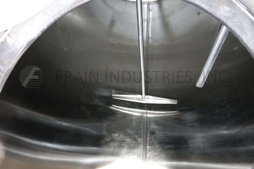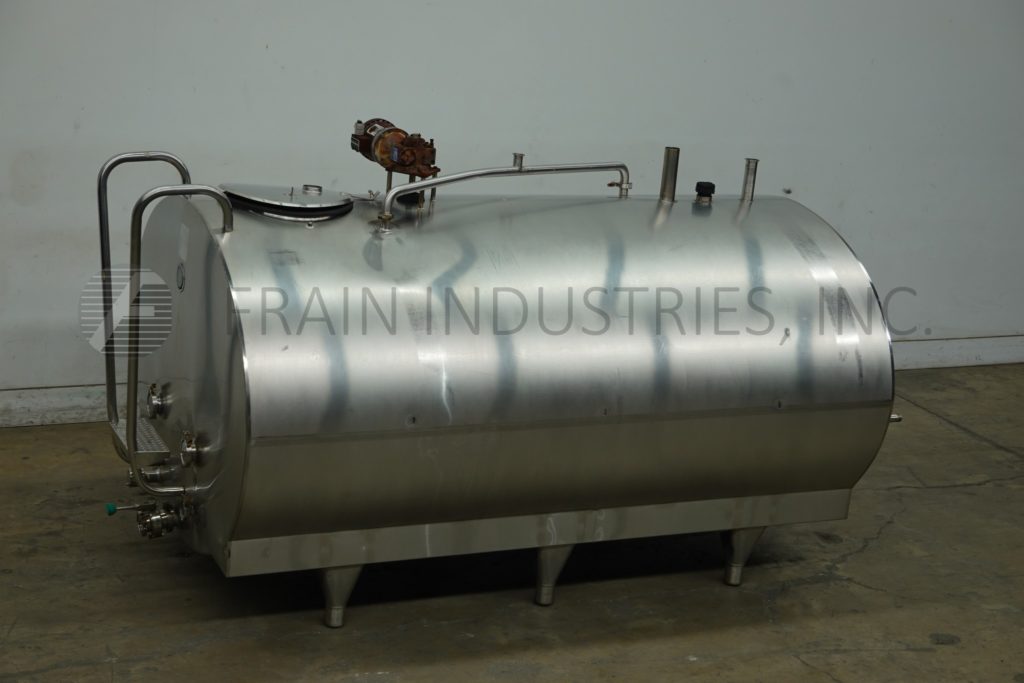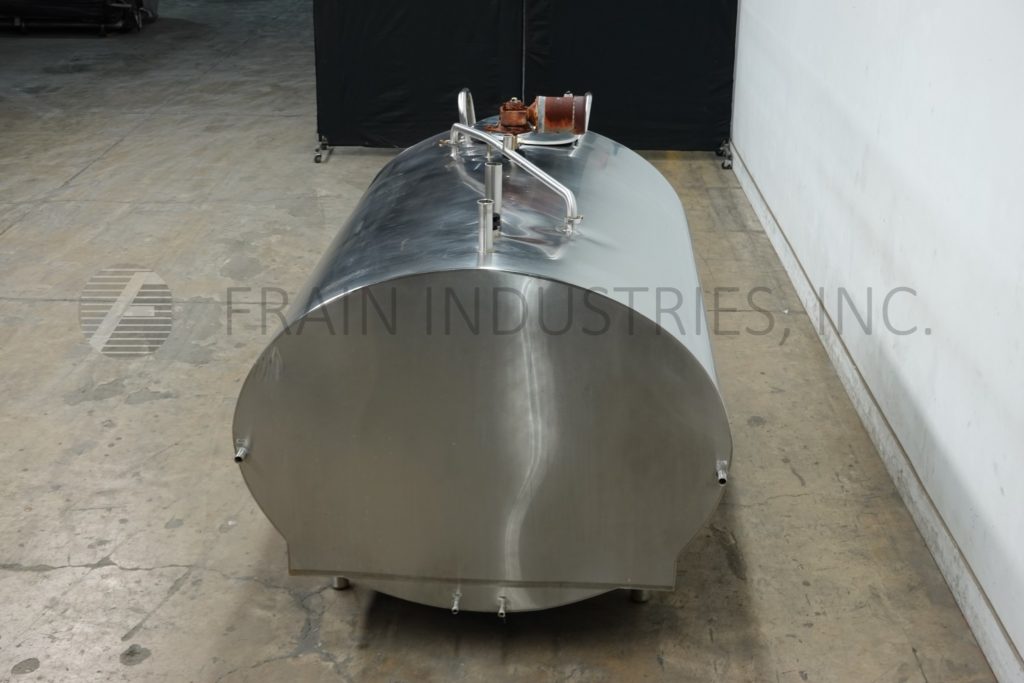 Back to All EquipmentMueller, 850 Gal, 304 stainless steel horizontal tank. Vessel Dimensions: 50" diameter x 100" straight wall. Equipped with a 18" top man way with flip open cover, thermometer, prop agitator mixer and a 3½" OD / 3" ID Tri-clamp style discharge fitting with 7" ground clearance. Mounted on (6) leg tubular legs.