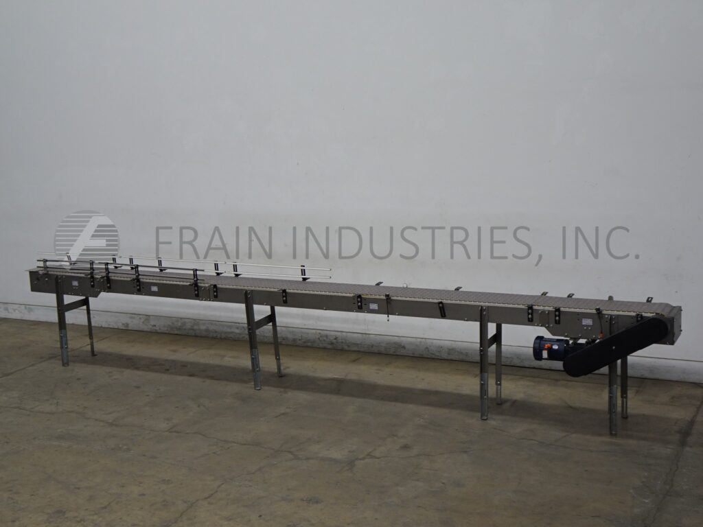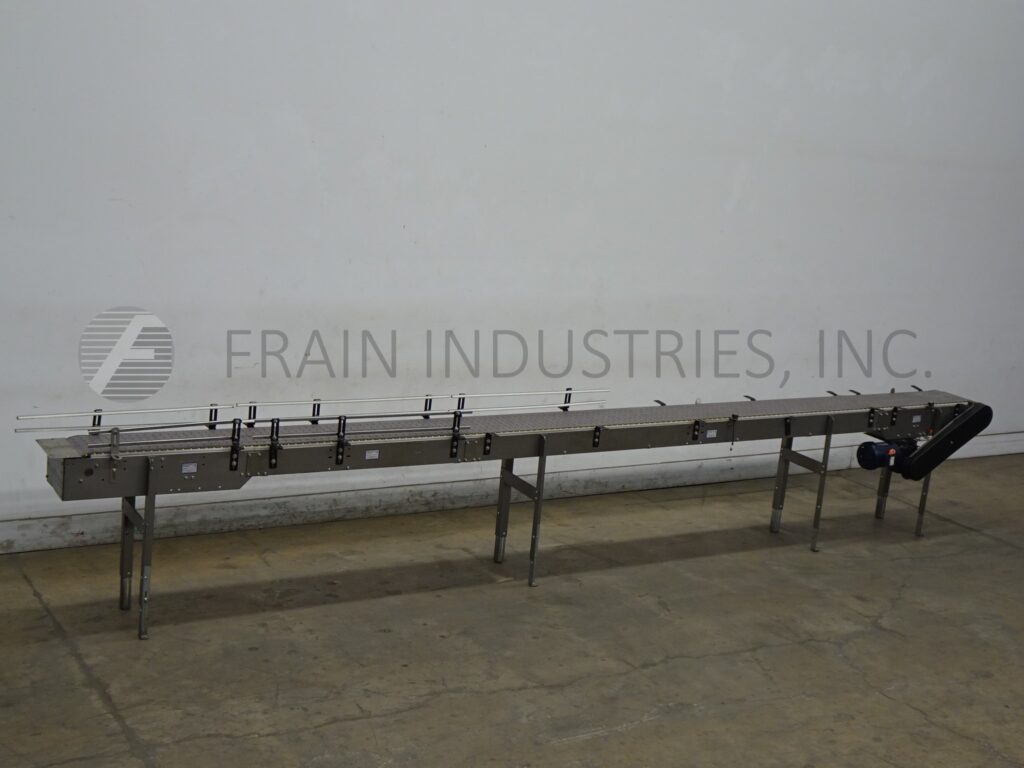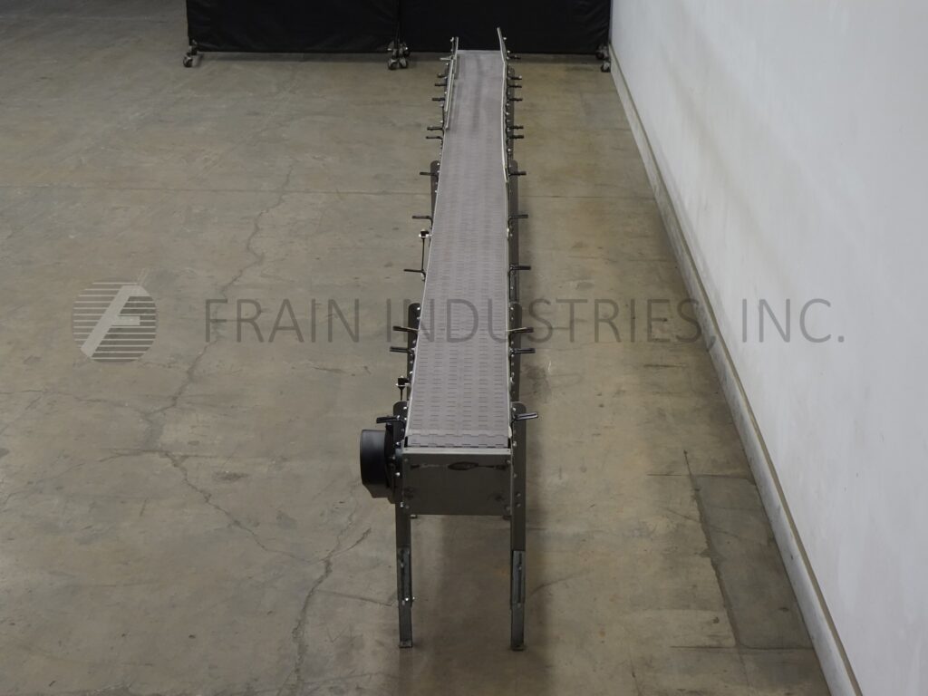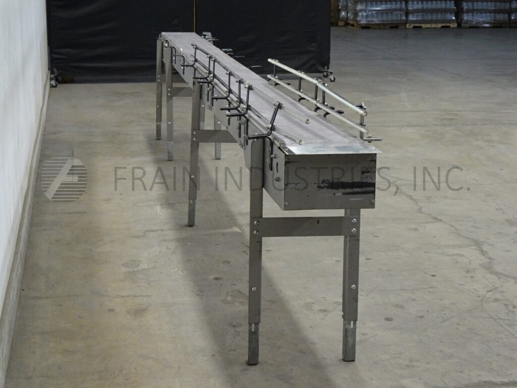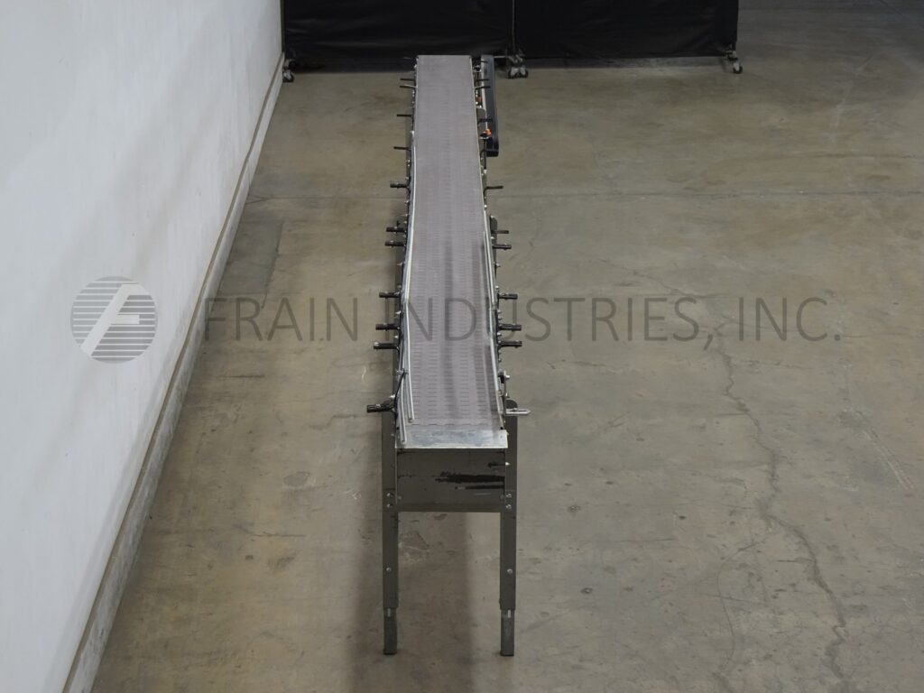 Back to All EquipmentNercon, painted frame conveyor. Equipped with a 12" wide x 233" long belt with a 30" to 38" infeed/discharge height range.