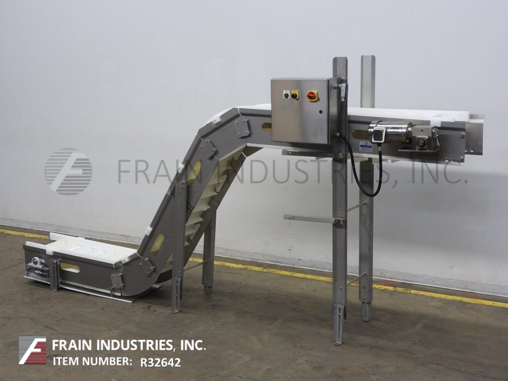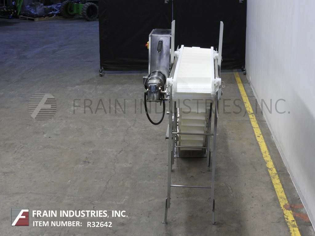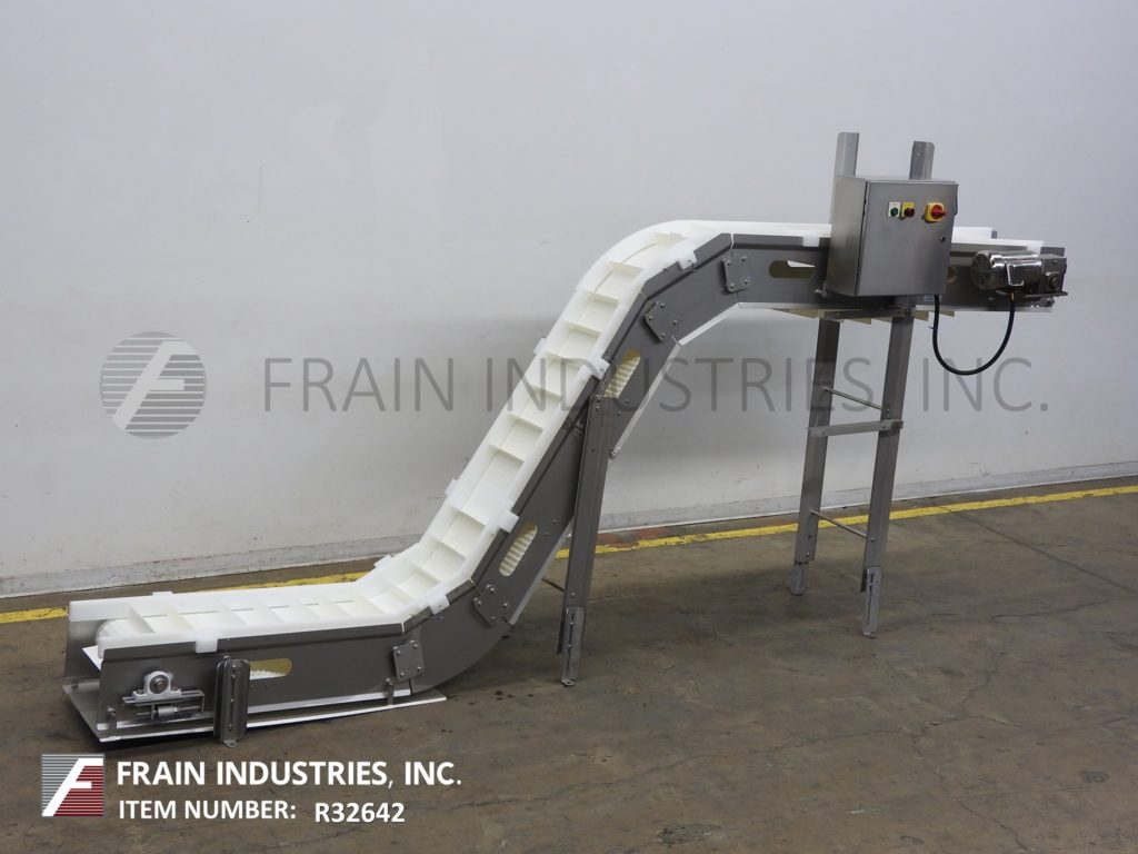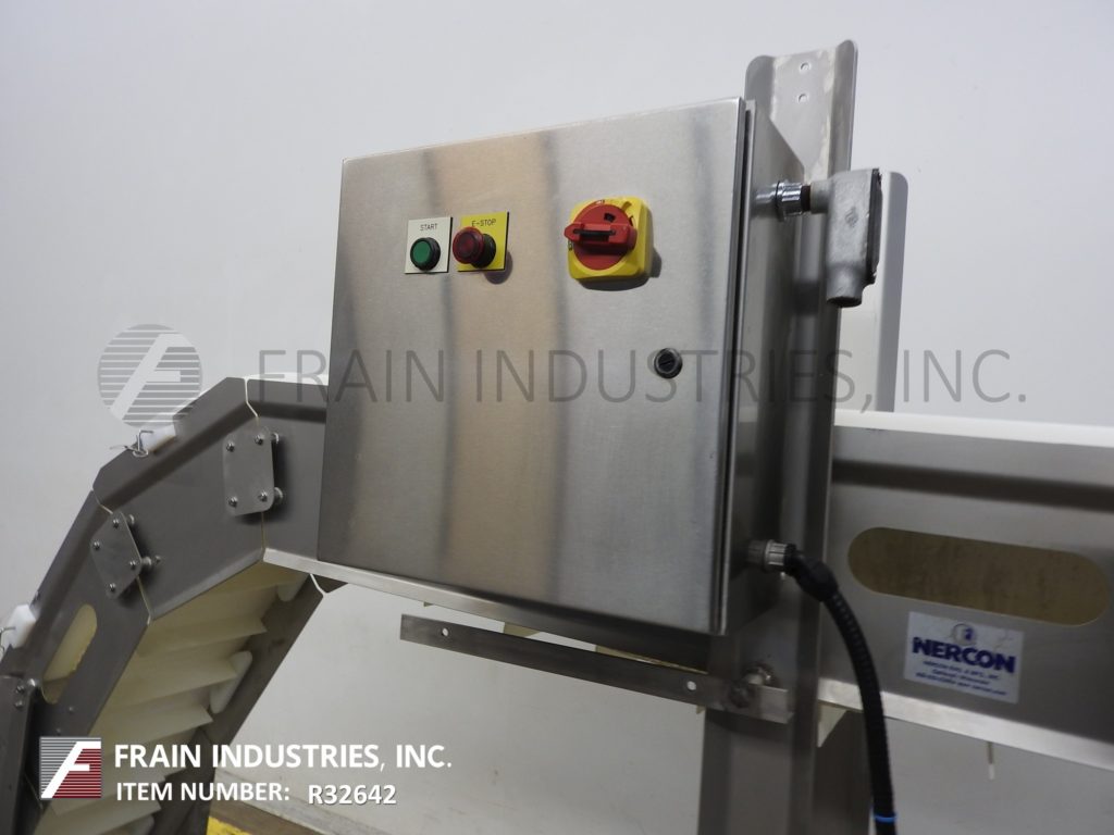 返回所有设备Nercon,不锈钢倾斜的传送带,每小时产品数量 - 取决于材料和应用。配备13英寸宽x 192“长带,在6英寸中心设有2½”高夹板。48“长水平运行有16”到22“在饲料高度。72”长倾斜部分和72“长顶水平部分,63”至68“排放高度。控制面板按钮启动和变速控制器。