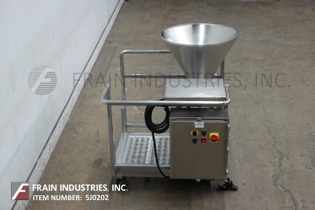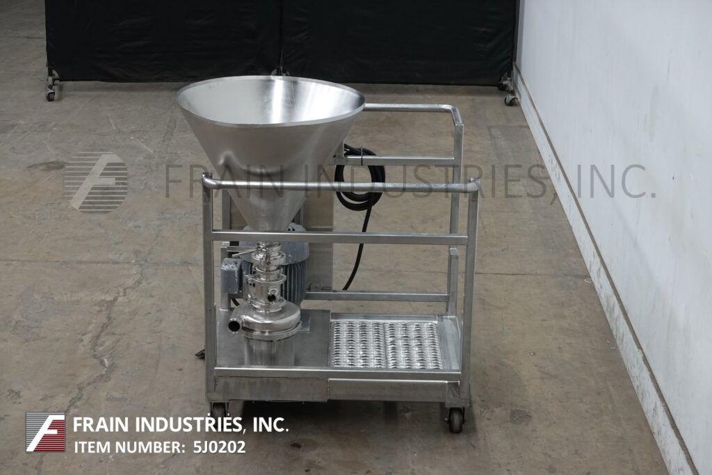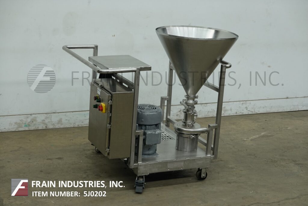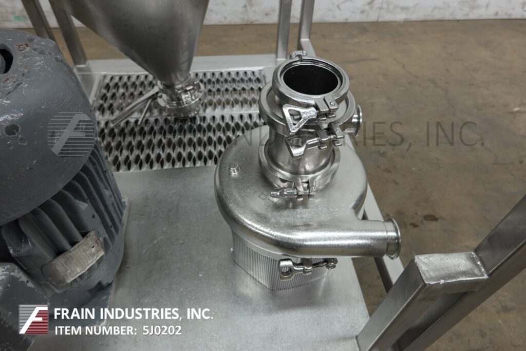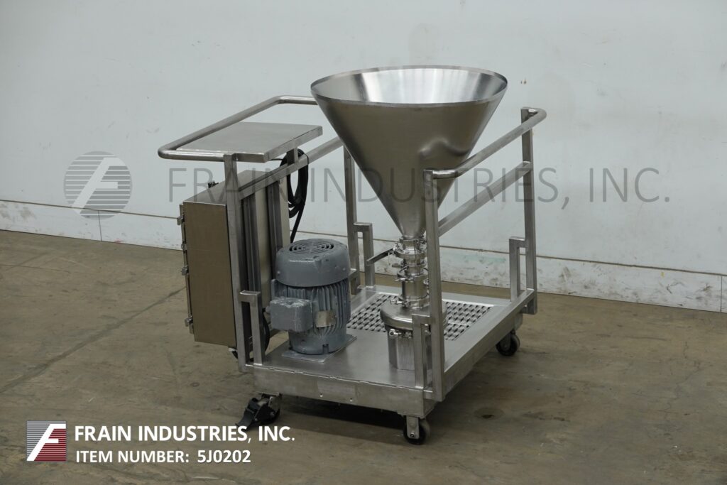 Back to All EquipmentTri-Clover, 316 stainless steel tri-blender with absorption rates from 10 to 120 gallons liquid and 1 to 100 pounds dry product per minute – depending on materials, application and machine configuration. Equipped with 28" diameter x 24" deep hopper, 3½"OD / 3"ID dry product inlet, 2"OD / 1.5"ID liquid feed, 10 Hp mix head and 2½"OD / 2"ID discharge. Control panel has push button start / stop controls. Mounted on stainless steel cart with casters