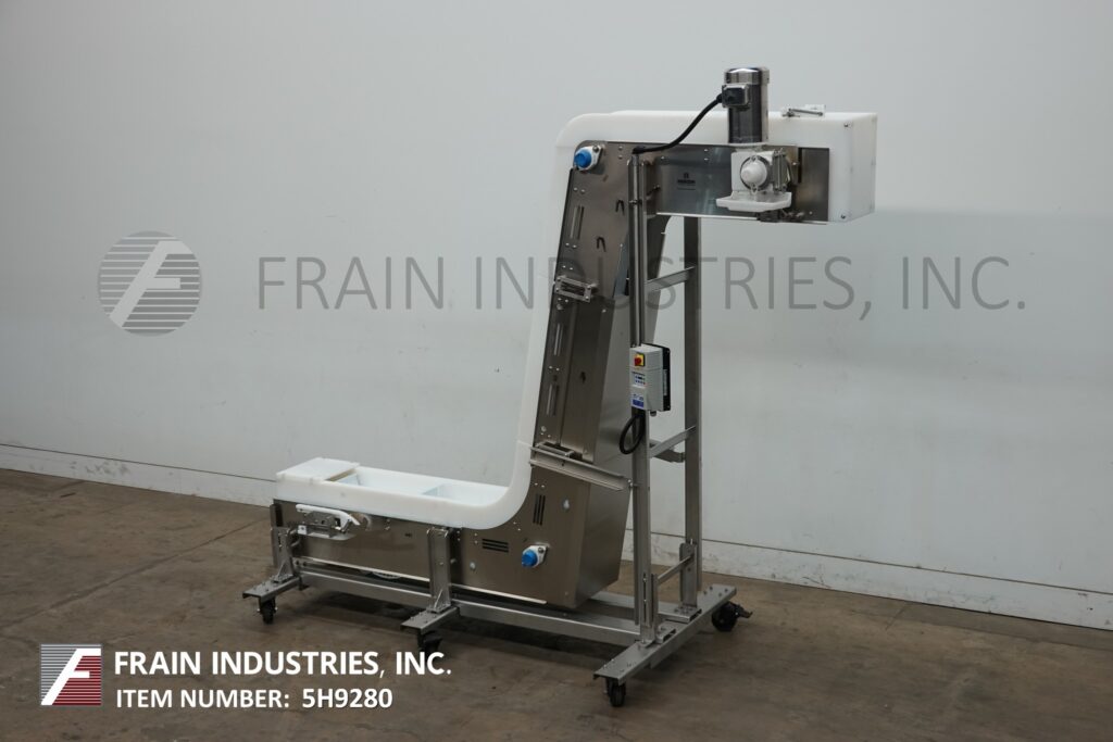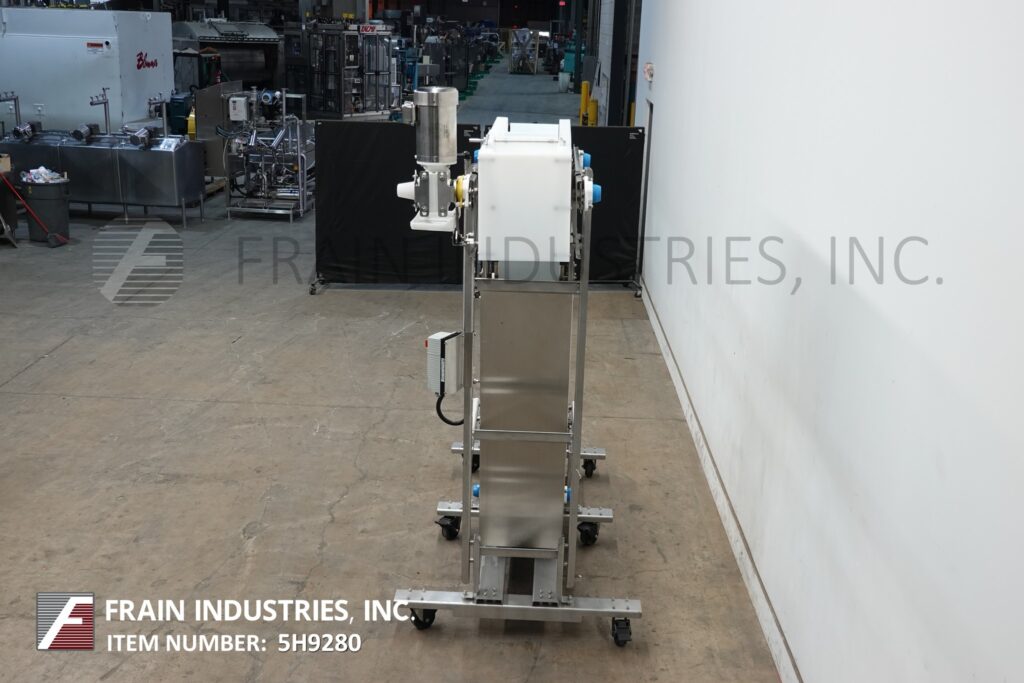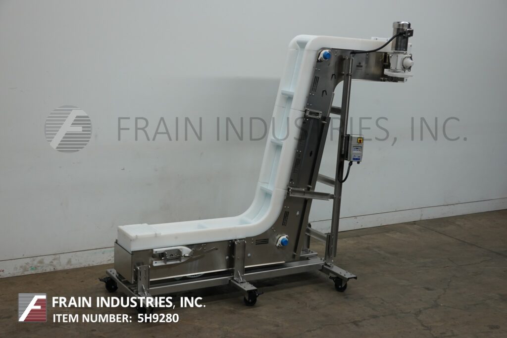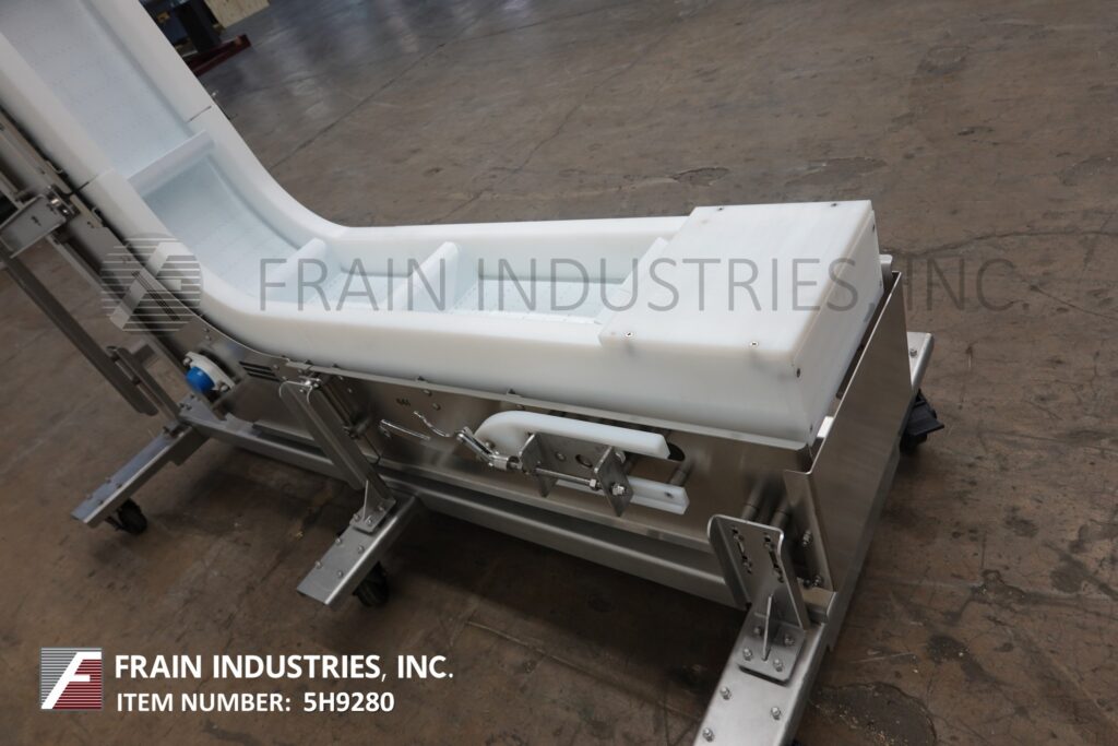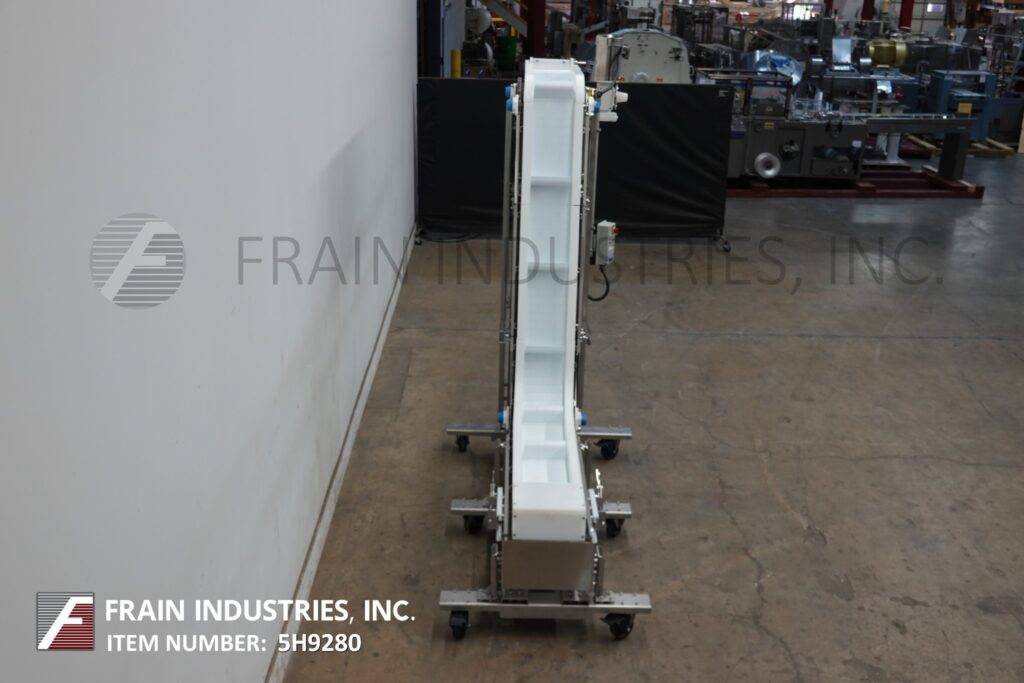 Back to All EquipmentNercon, Z-Style, stainless steel, inclined cleated conveyor with number of product per hour – depending on materials and application. Equipped with 10" wide white neopreme belt and side guards with 4" high cleats set on 20" centers. 45" long horizontal floor run has 30" in feed height. 76" long incline section and 36" long top horizontal section with 98" discharge height and top mounted motor drive with variable speed controller. Mounted on heavy duty stainless steel frame with caster.