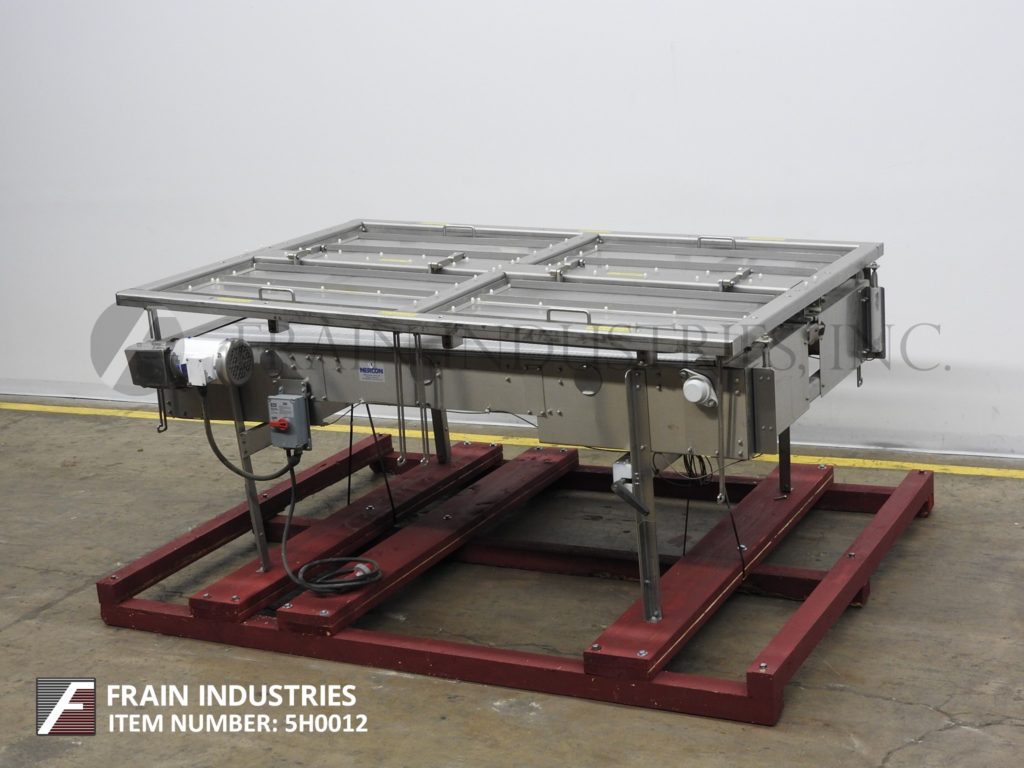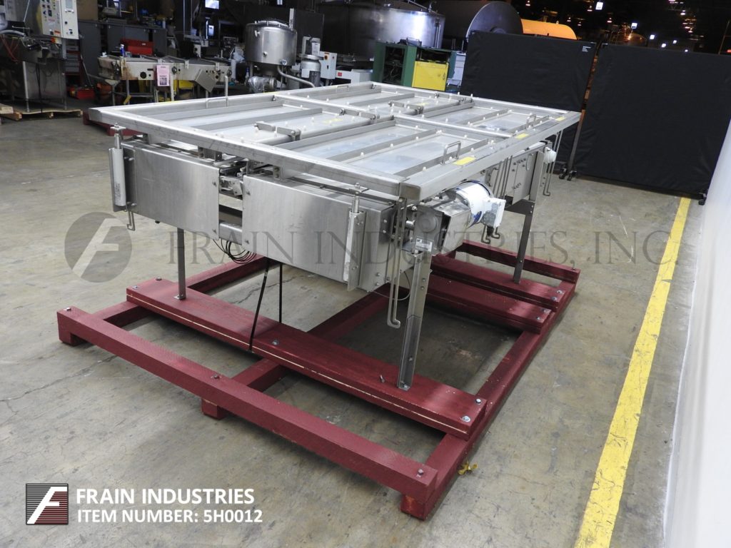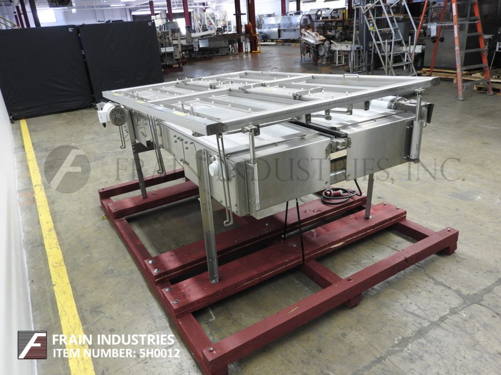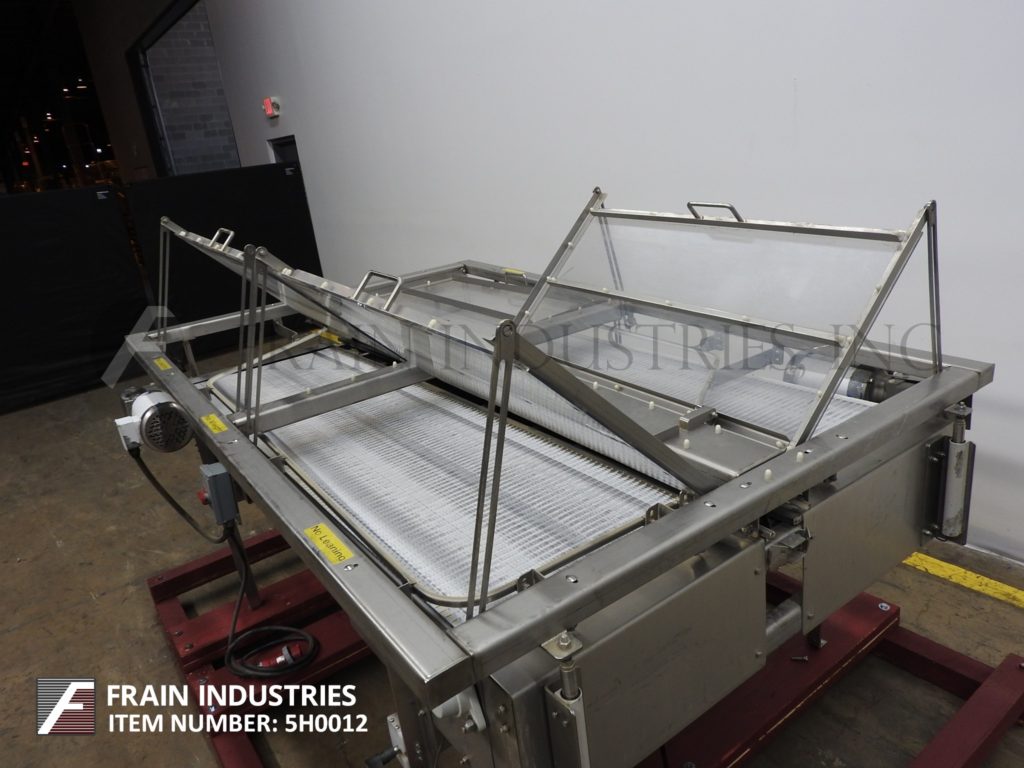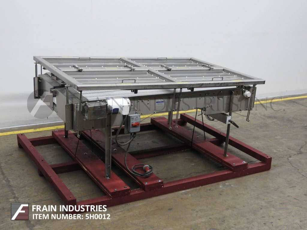 返回所有设备Nercon,不锈钢,双向台顶带累积输送机。配备4½“宽X 100”长达德里林塑料产品进料输送机,(2)24“宽X 83”长双向蓄积带,其进入产品输送机。安装在不锈钢基架上,高度可调节腿和气动高度可调盖,间隙范围为3“至6”和(4)抬起门门。