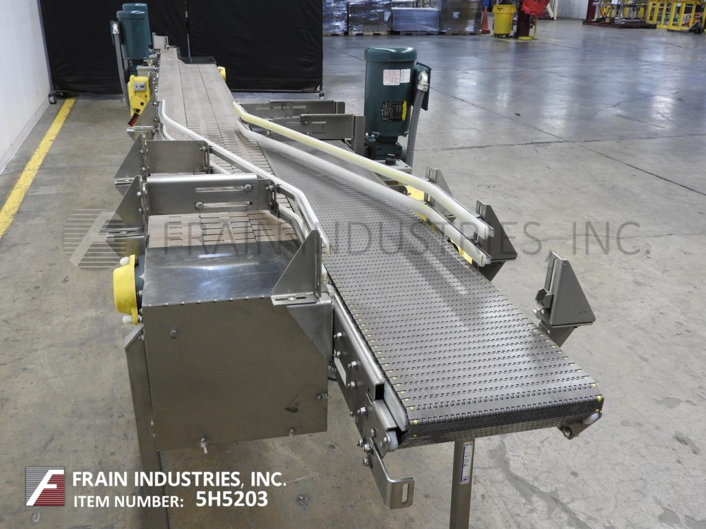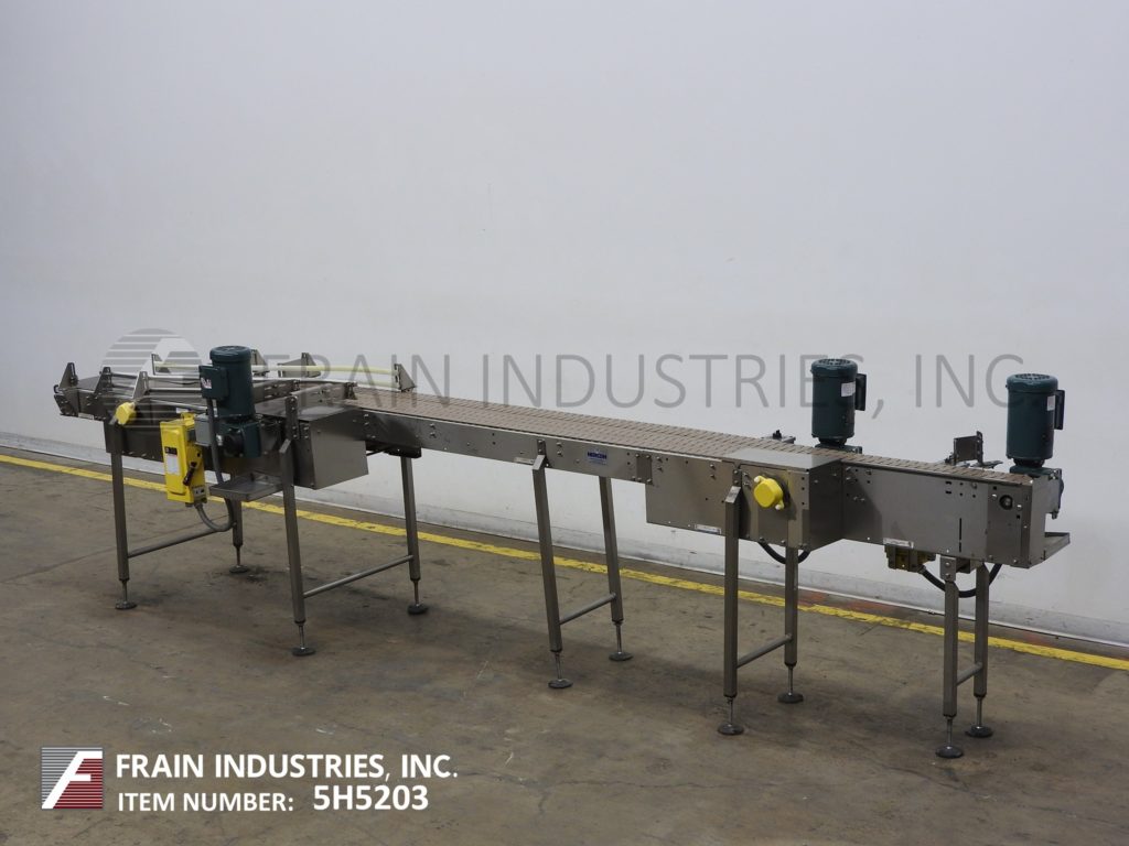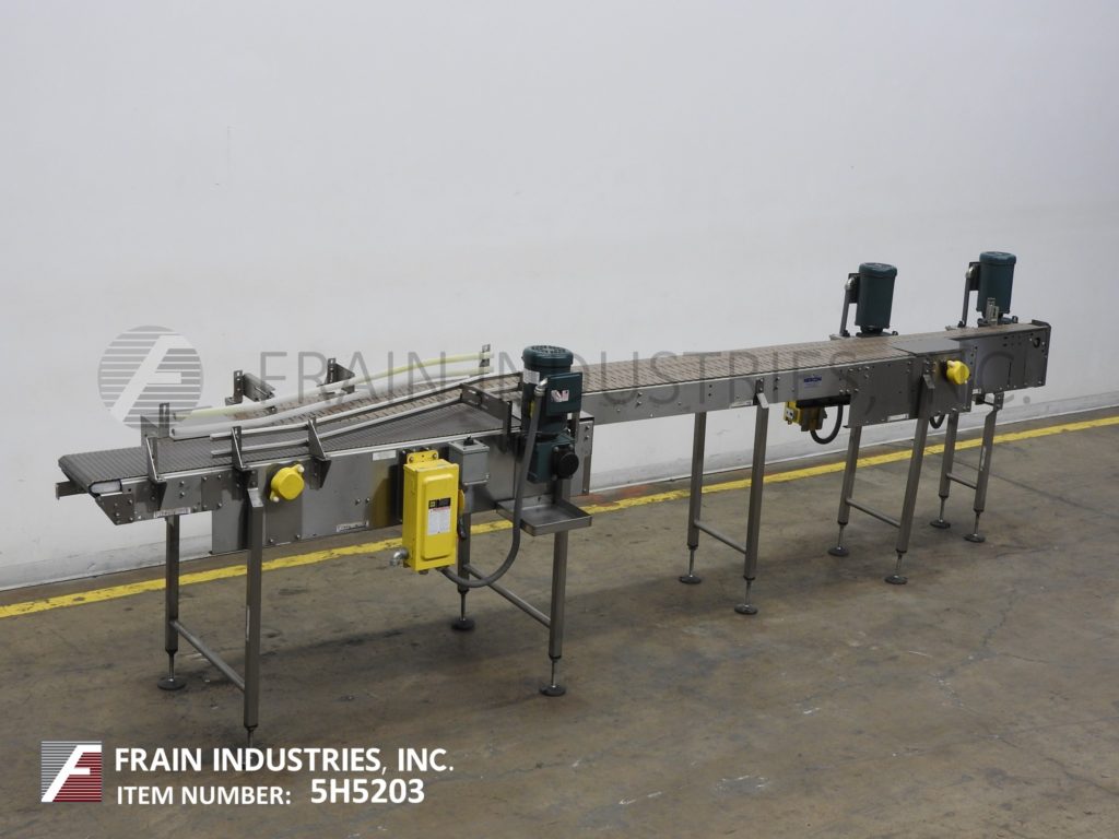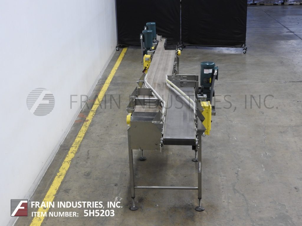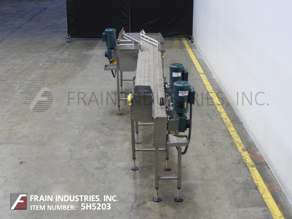 返回所有设备Nercon,无压力合成器/内胆,不锈钢输送机。配备(1)12“宽x 60”长的进料输送机,(2)4½“宽x 125”长的内衬输送机和(1)4½“宽x 170”长的排出输送机。每条车道的运行速度都比前一条车道快,以直线移动产品。