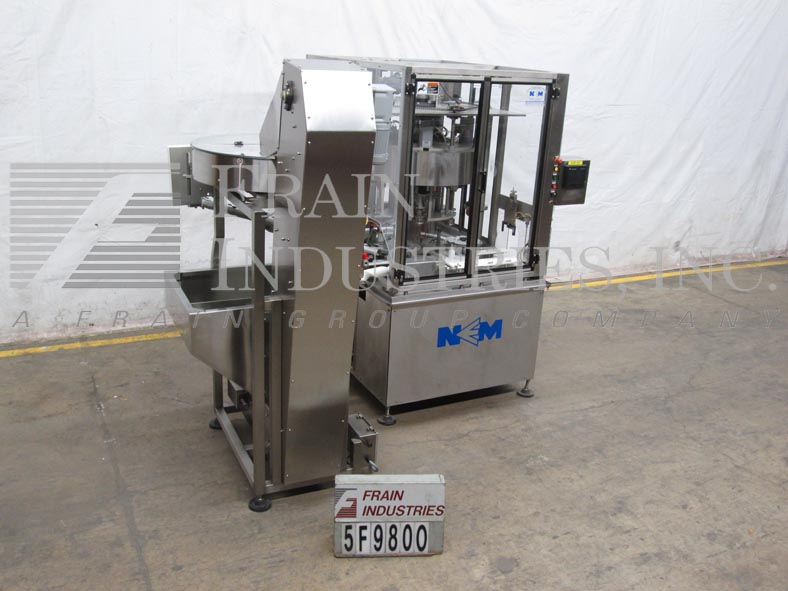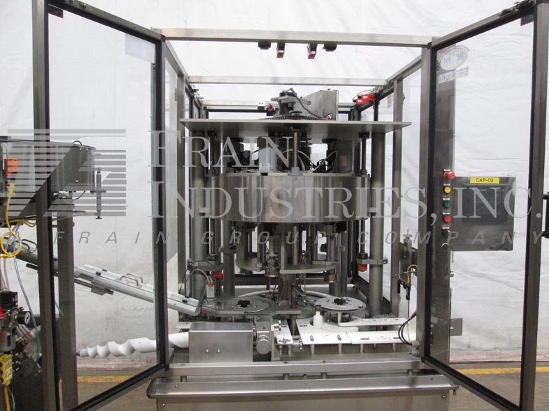 返回所有设备新英格兰型号NERCCE, 4头,不锈钢,旋转卡盘盖机和型号NES 36盖给料机和碗分选机的速度-取决于头的数量,容器大小和配置。瓶盖尺寸范围:15mm至70mm,容器尺寸范围:直径2"至5";4"至14"高度与适当的更换部件。配备44"长x 2-1/4"宽的产品输送机与聚氨酯涂层容器处理表面的温和处理容器,并由非损坏的HDPE(每个应用更改部分)构成。24“旋转炮塔4伺服驱动气动卡盘封口机头设置15日“中心和夹头拉针快速释放/变化适应各种各样的帽子/容器和电子应用一致的转矩的转矩控制在每磅+ / - 1.5。与a / B控制面板与面板视图控制器和速度控制器,联锁安全保护。安装在不锈钢底座上。NES 36不锈钢盖给料机和分选机有30"长x 27"宽x 26"深盖料斗和55"长x 10"宽柔性连接传送带3-1/2 '高的夹板在10"中心和36"外径不锈钢分选碗。