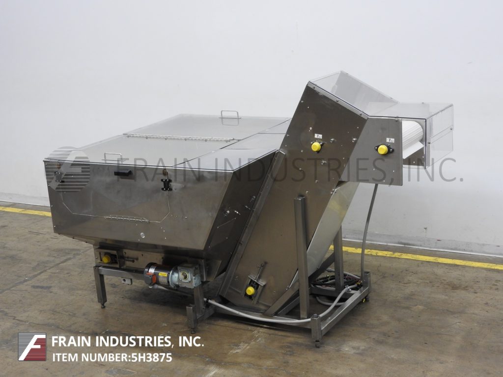 返回所有设备新英格兰,不锈钢,60英尺,散装料斗/倾斜饲养者。配备68英寸宽x 60“长x 30”深型产品料斗,34“宽x 32”长的活底输送机,18英寸“宽白色柔性板输送机,2英寸高夹板上12英寸”垂直运行45““水平运行和58”放电。