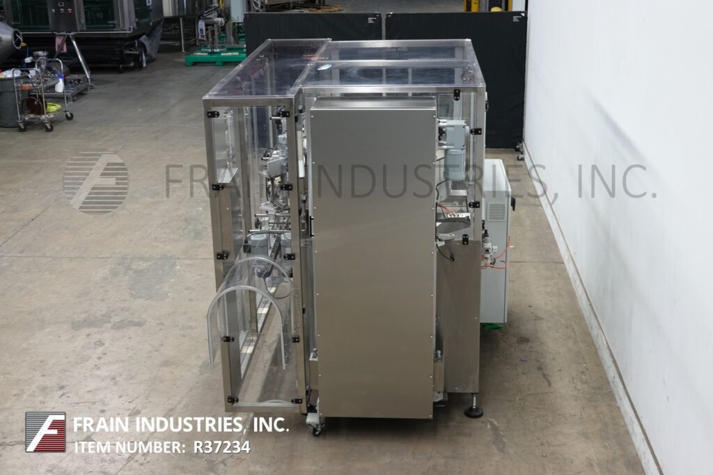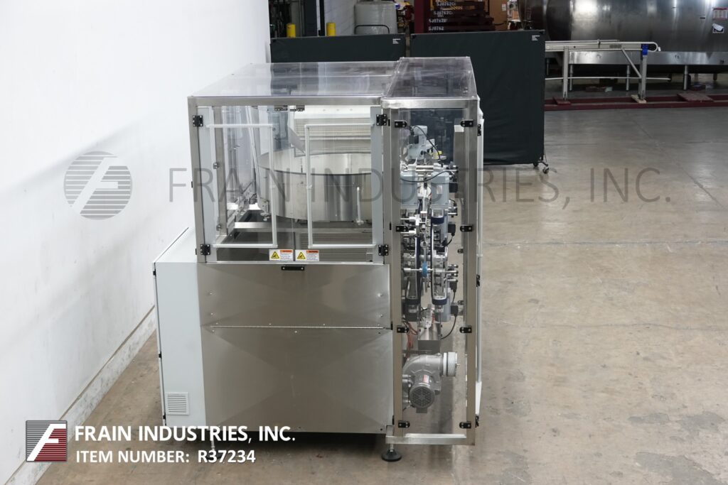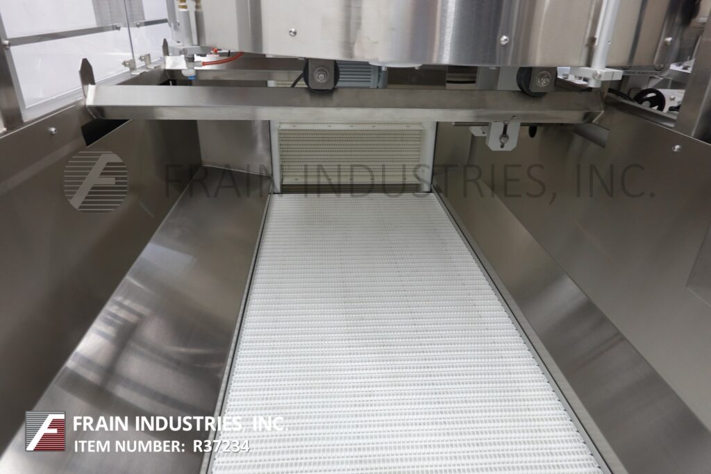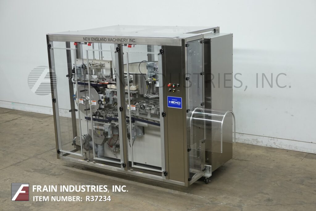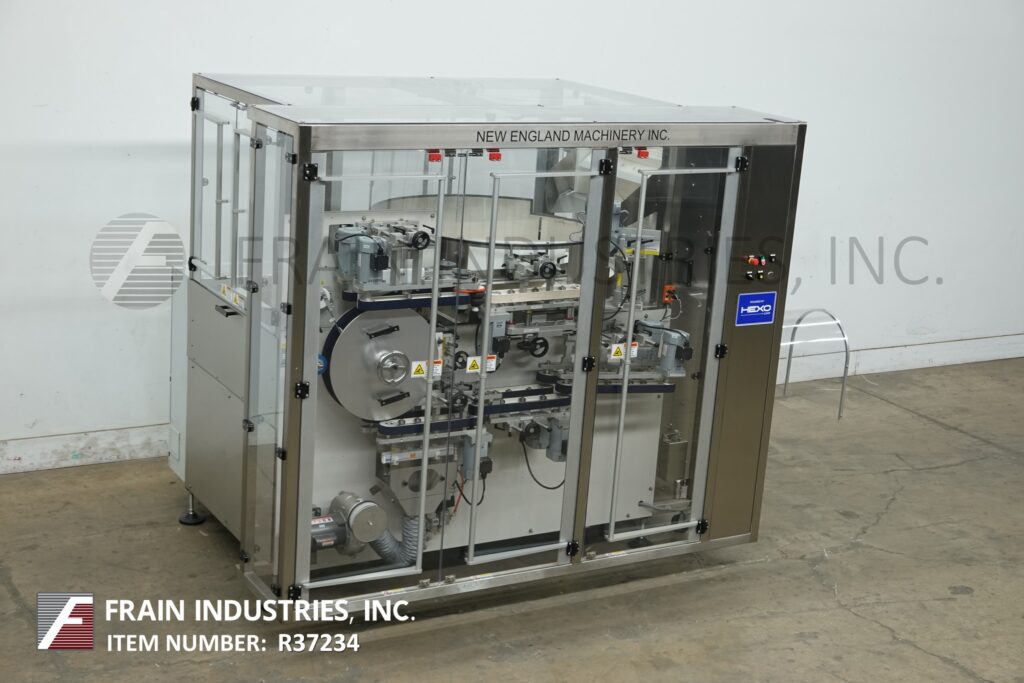 Back to All EquipmentNew England, Model NEHCPCL-48, automatic, stainless steel, compact, bulk plastic bottle feeder and unscrambler, rated from 20 to 120 containers per minute – depending materials and application. Equipped with 42" wide x 78" long x 12" deep (20 ft³) bottle hopper with 28" wide x 64" long live bottom conveyor, 26" wide vertical bottle elevator with 4½" high cleats on 10" centers, 48" OD container sorting bowl, with container size range: (5/8)" to 6½" in Diameter x up to 12" in Height and capable of handling variety of sizes and shapes including round, oval, straight-wall, tapered, and non-tapered containers with proper change parts. 20" OD rotary orientation wheel with single hook arm container upender, ionized air and vacuum container cleaner, (3) sets of dual soft belt container transfer system all 1½" wide with 18" long thru cleaner, 18" long transfer from cleaner to 24" long discharge section. Mounted on stainless steel base frame.