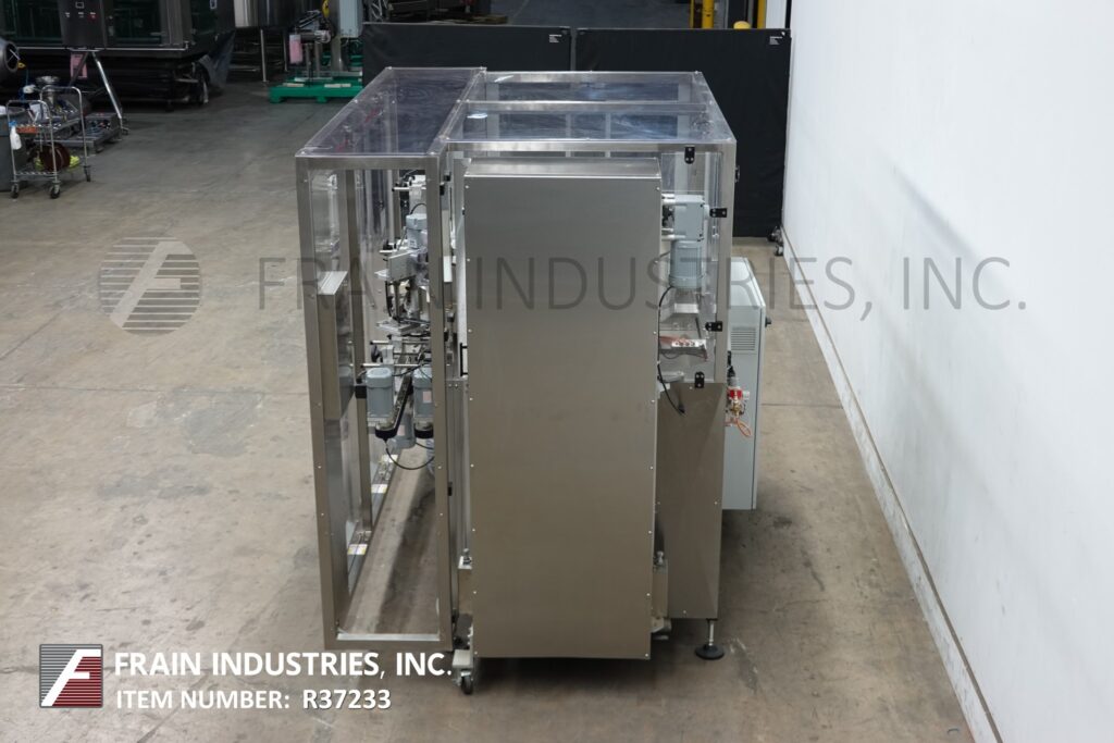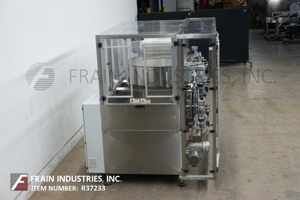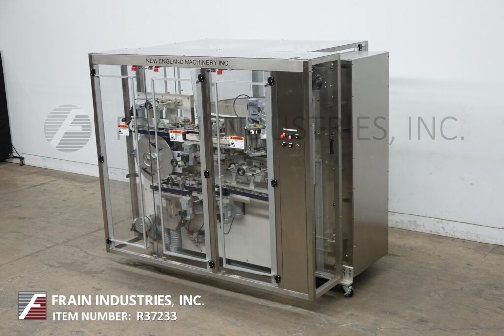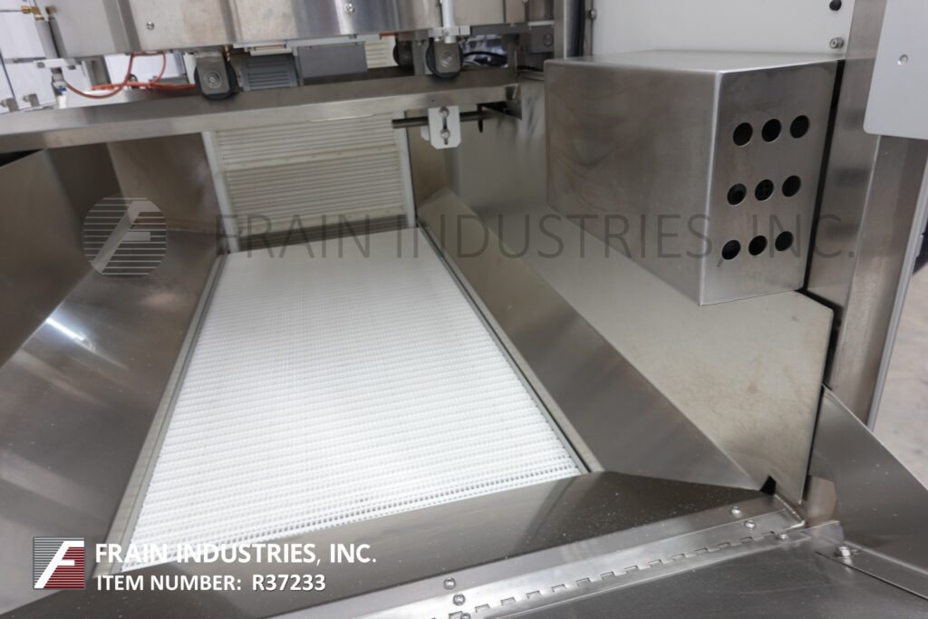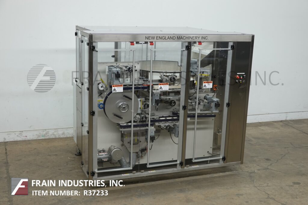 Back to All EquipmentNew England, Model NEHCPCL-48, automatic, stainless steel, compact, bulk plastic bottle feeder and unscrambler, rated from 20 to 120 containers per minute – depending materials and application. Equipped with 42" wide x 78" long x 12" deep (20 ft³) bottle hopper with 28" wide x 64" long live bottom conveyor, 26" wide vertical bottle elevator with 4½" high cleats on 10" centers, 48" OD container sorting bowl, with container size range: (5/8)" to 6½" in Diameter x up to 12" in Height and capable of handling variety of sizes and shapes including round, oval, straight-wall, tapered, and non-tapered containers with proper change parts. 20" OD rotary orientation wheel with single hook arm container upender, ionized air and vacuum container cleaner, (3) sets of dual soft belt container transfer system all 1½" wide with 18" long thru cleaner, 18" long transfer from cleaner to 24" long discharge section. Mounted on stainless steel base frame.