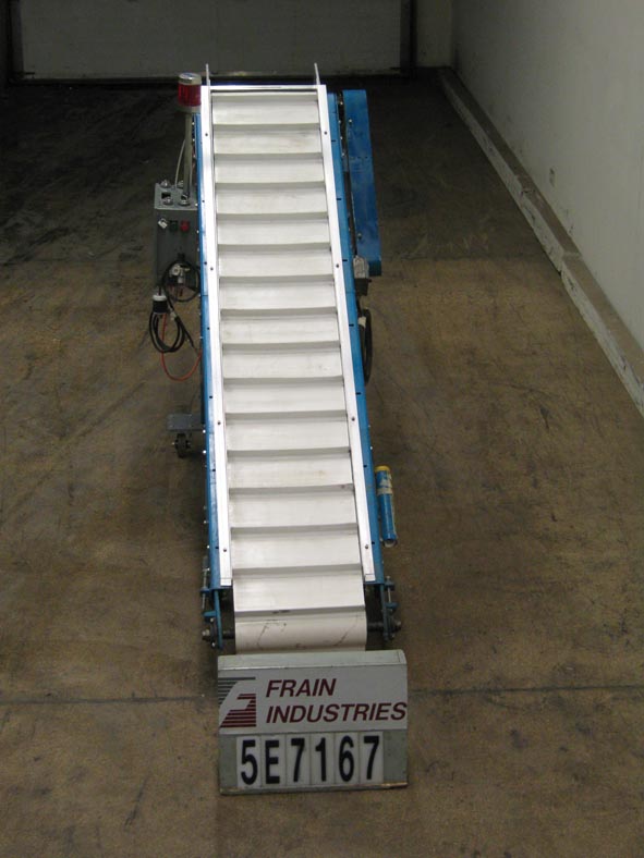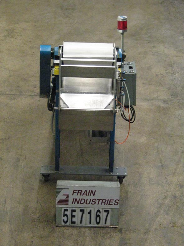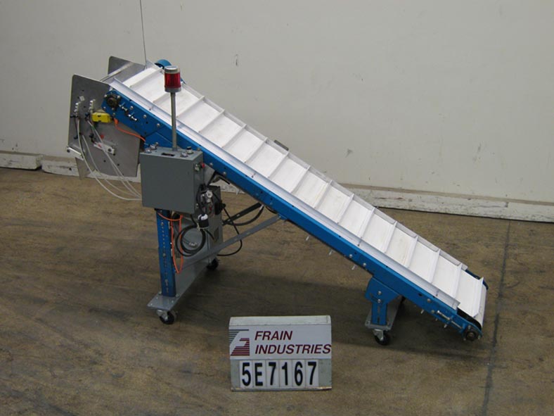 返回所有设备96“L X 18”W倾斜的皮带馈线和产品计数器额定标准速度为60 fpm。有一个96“l x 18”w白色pvc皮带,在6英寸的6英寸中心和排放高度为36“的1 1/2”h。(2)产品柜台眼睛用A / B控制器和数字读数,1/2 HP电机驱动器,在底框架上,带有锁定脚轮的底座,用于移动性。
