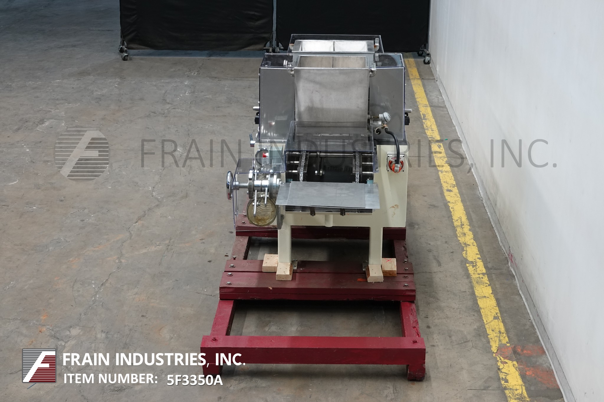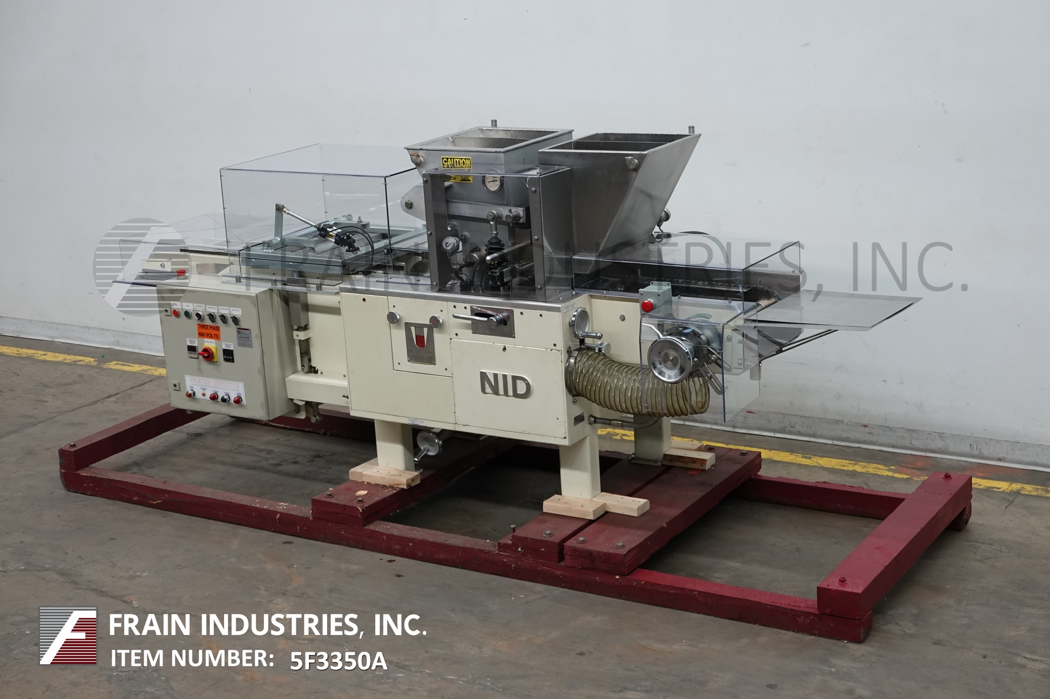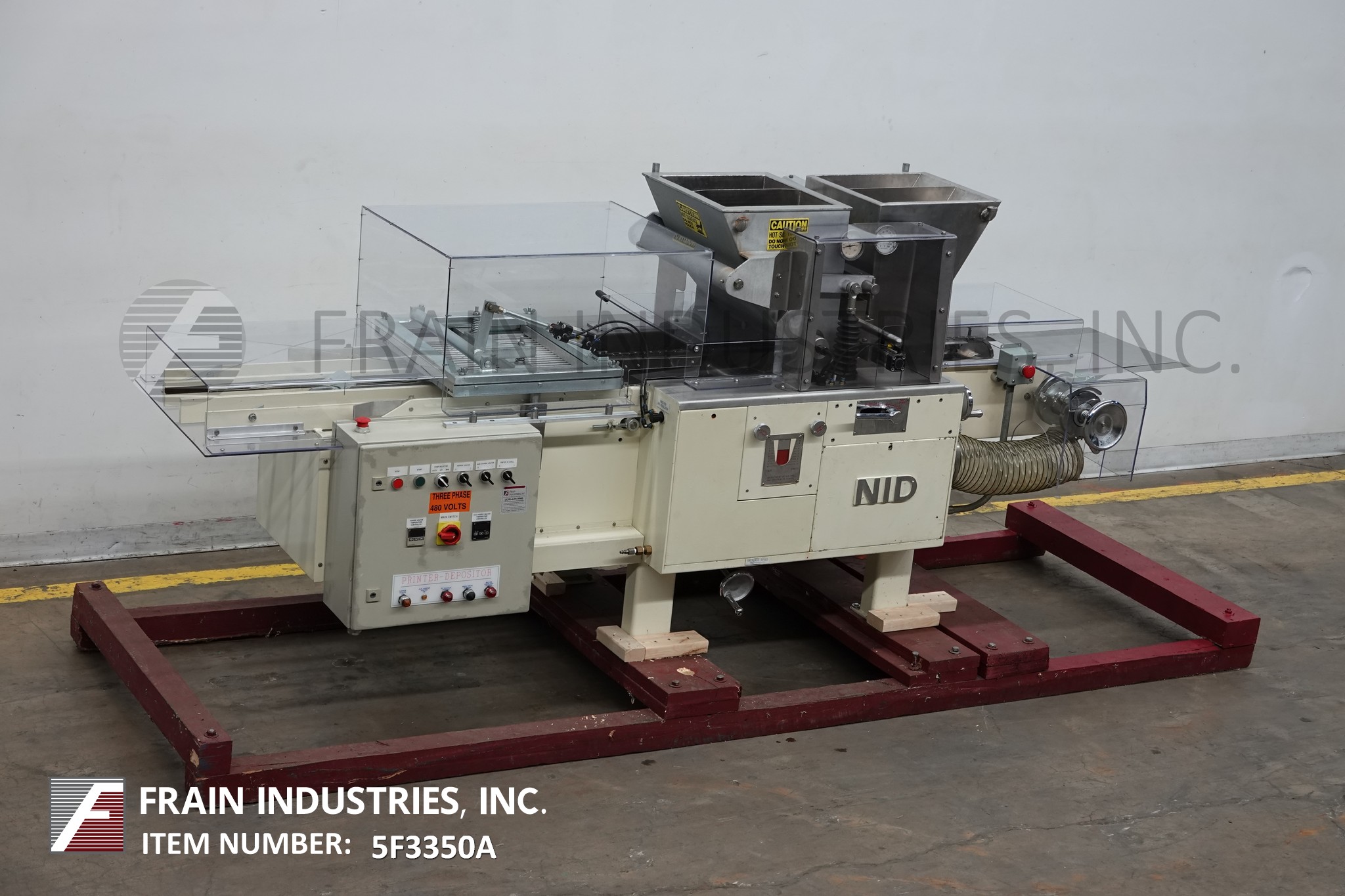 返回所有设备每小时NID自动,糖果存款/打印机每小时额定50至400磅 - 取决于材料和应用。配备往复式推挤臂进入,16“x 16”打印面积,(2)不锈钢夹套料斗,12英寸宽(2)链销产品输送机,(2)排(10)沉积喷嘴,手工曲柄变速控制,可变温度控制和lexan安全防护。安装在(4)腿上。
