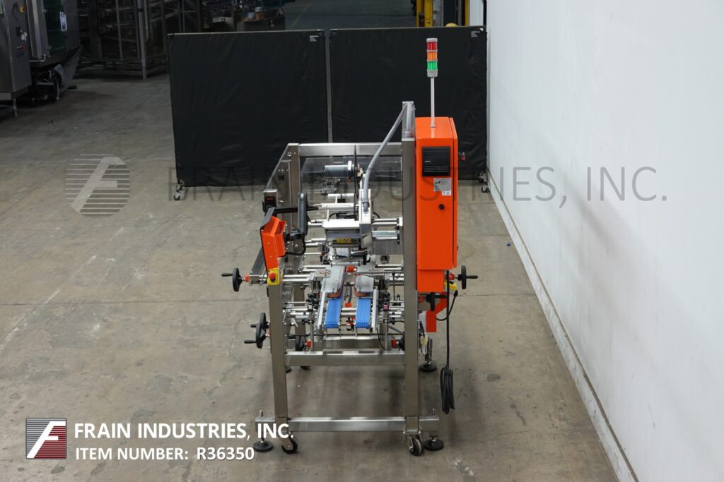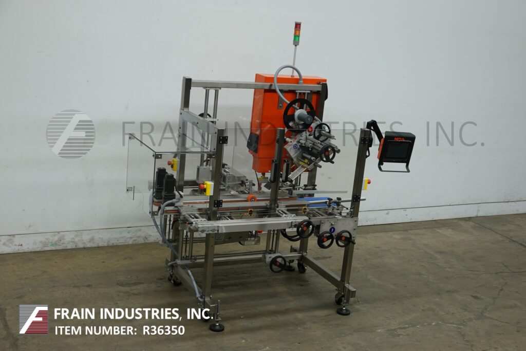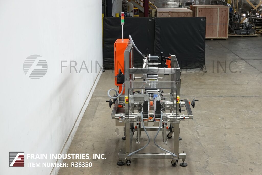 Back to All EquipmentNita, Model Joust SSK 360, Pressure sensitive, 360 degree label applicator with number of containers – depending on container height, length and label length, materials, application machine configuration. Container size range: to 15.5" in Width; to 14" in Height. Label size range: ½" to 6" in Width. Equipped with servo dual side belt product conveying system, adjustable guide rails, servo pressure sensitive label applicator (rated to 1570" per minute), brush wipe system, synchronized servo rear application swing arm and touch screen controller. Label accuracy to 1/32". Label specifications: 12" diameter on 3" core. Mounted on (4) leg frame with casters, leveling legs and statis light bar.