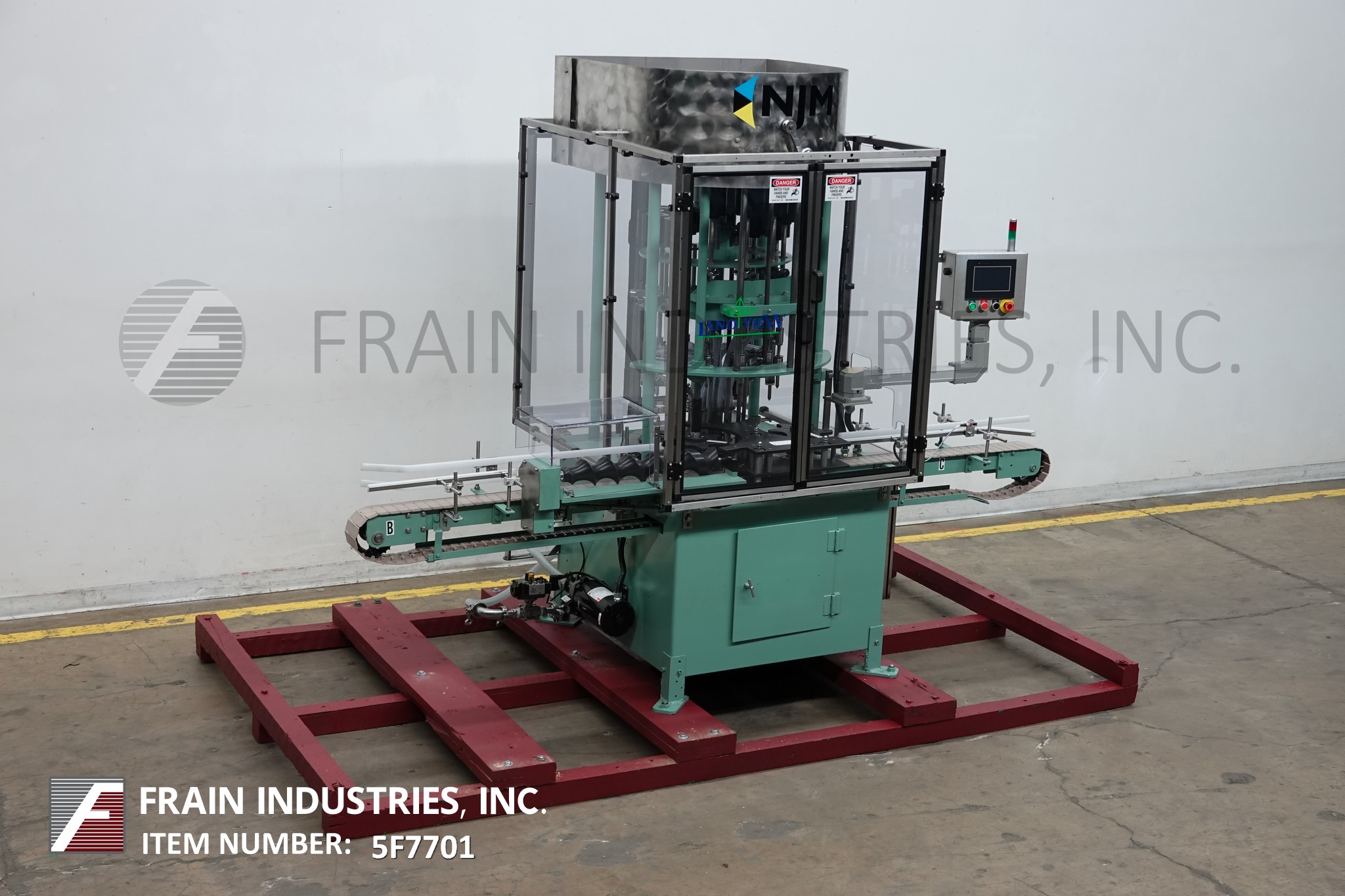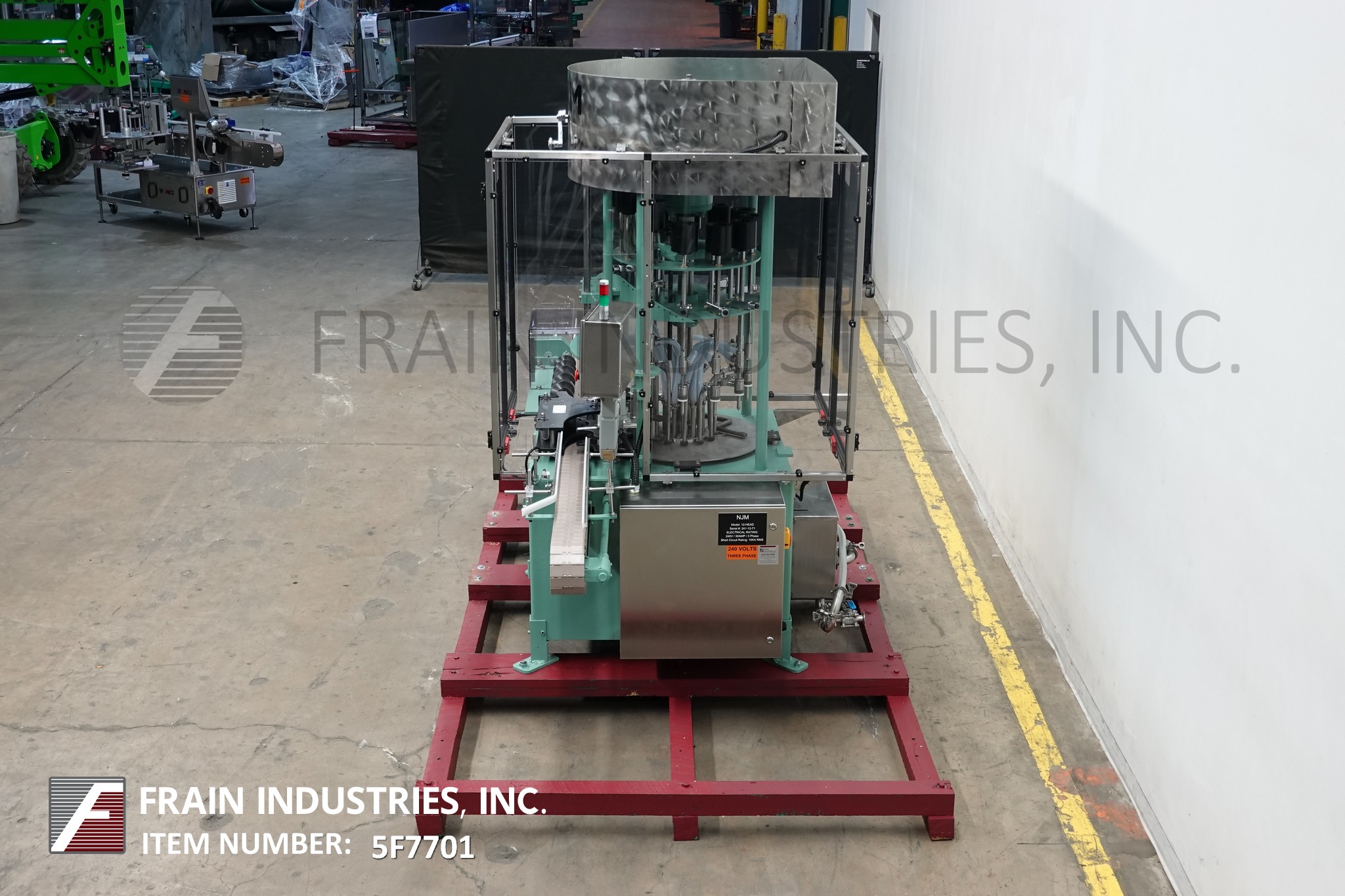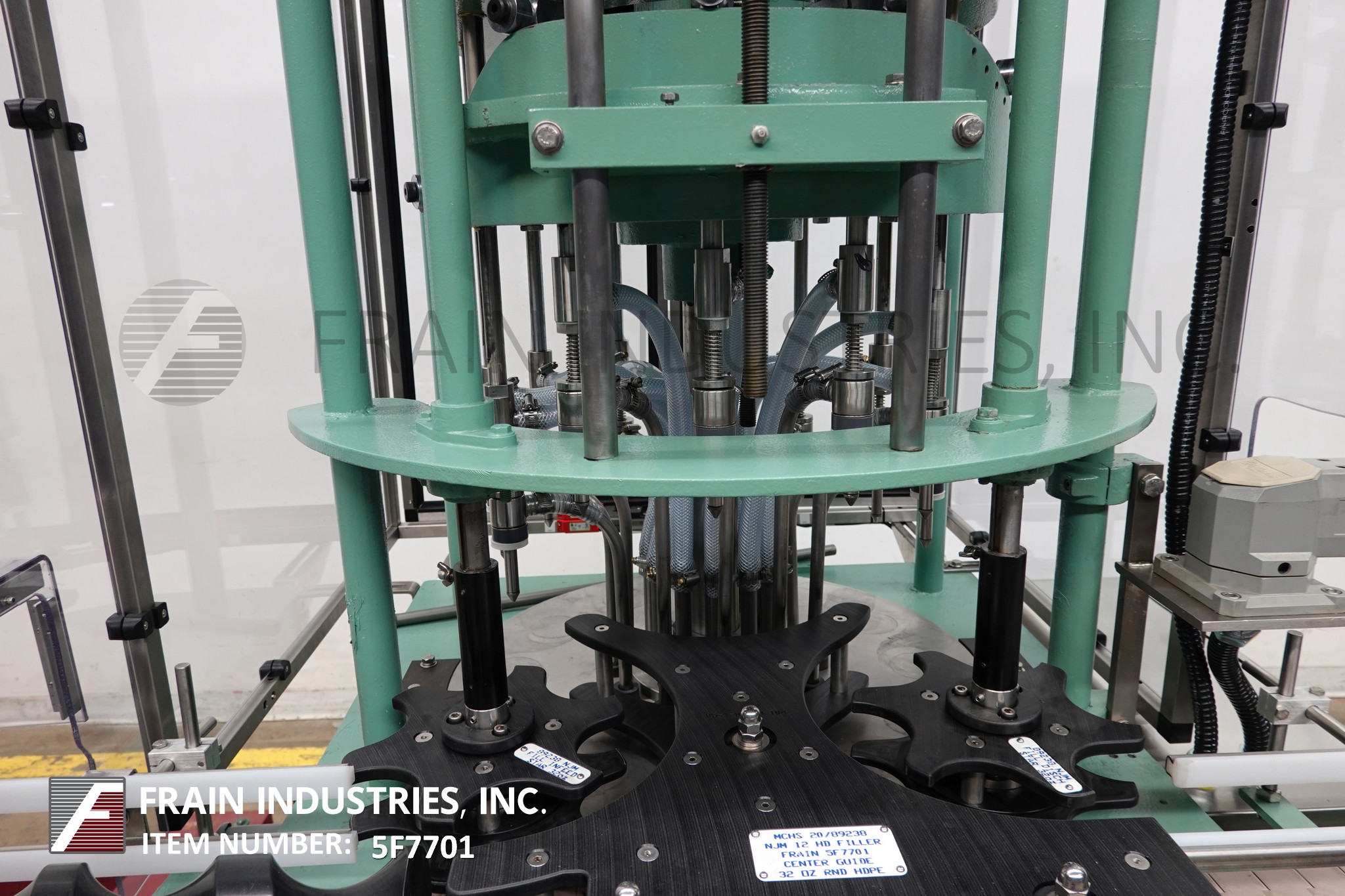 返回所有设备Njm型12头旋转,重力/溢流灌装机额定每分钟40至90个容器-取决于材料和应用。容器尺寸:1"至5-1/16"直径;2"到14"的高度,能够处理塑料和玻璃容器的圆形和其他形状,可以通过蜗杆控制。配备112”长x 2 - 1/2“宽输送机、蜗杆螺钉在饲料和放电星形轮,没有容器/没有填补,28“OD turrett开销驱动器和(12)5/8“OD喷嘴组5-1/4”中心与不锈钢产品料斗浮阀、启动/停止和紧急停止按钮控制。