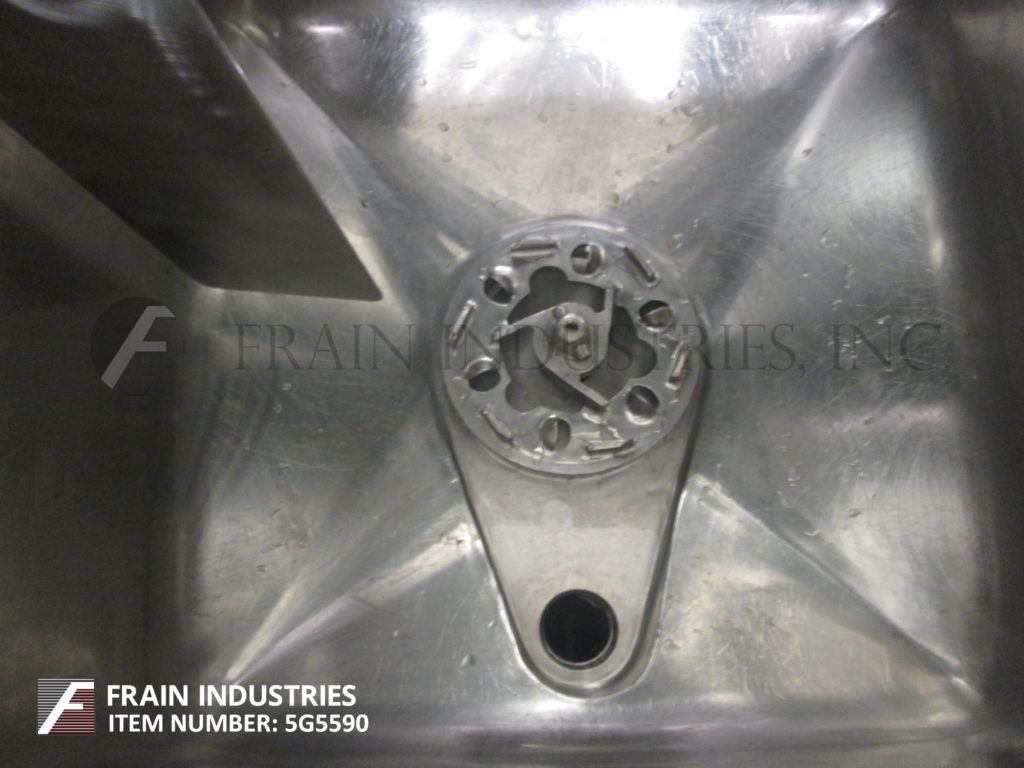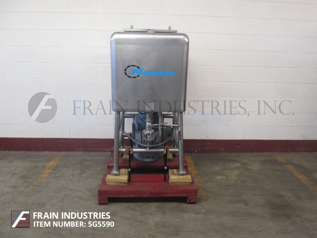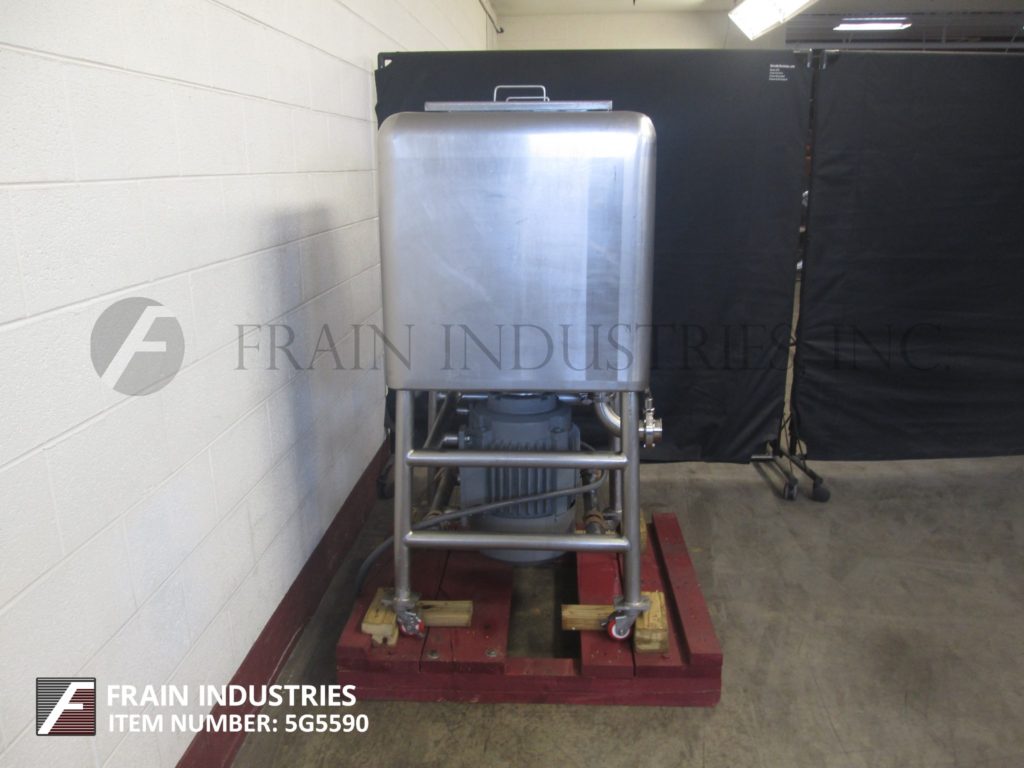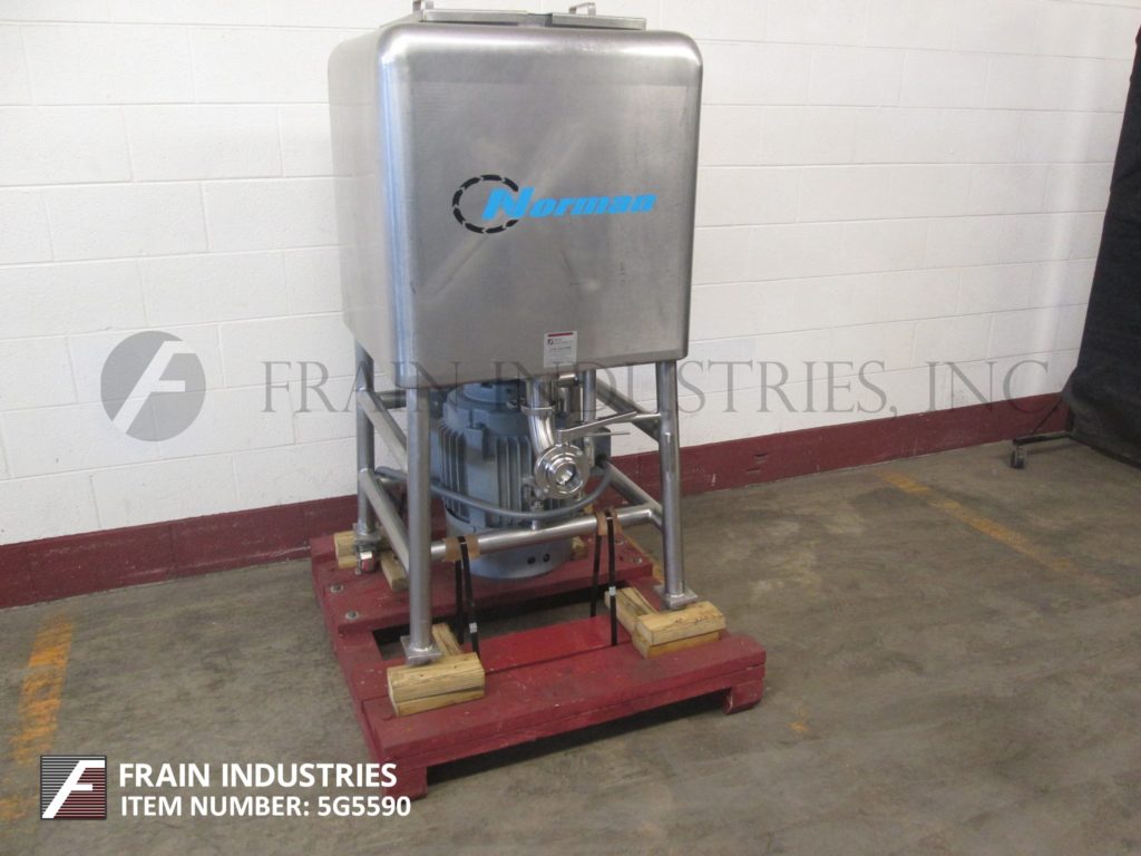 返回所有设备诺曼型号YS50,304不锈钢,50加仑,高剪切,低压套,矩形液化仪。腔室调光:26“长度; 26”宽;29“深度。配备17”X 14“ID高速公路,带抬起盖。锥形底部有6个孔/ 3翼高剪切叶轮,3”OD / 2-1 / 2“螺纹底部排放口,22”底部清洁,15 HP底部安装的直接电机驱动。安装在(4)腿不锈钢管状底座与脚轮。