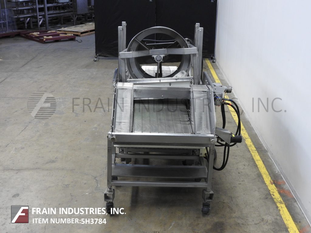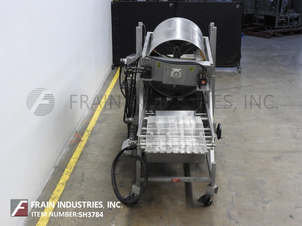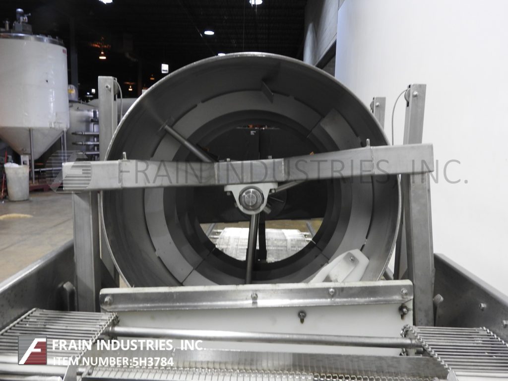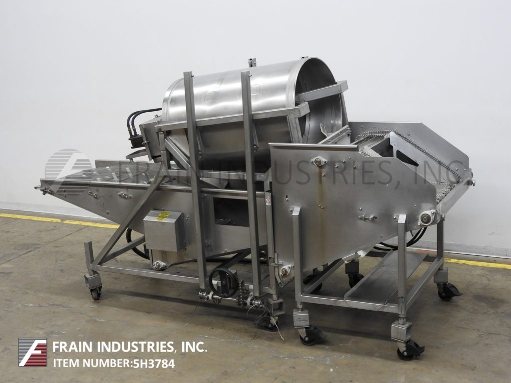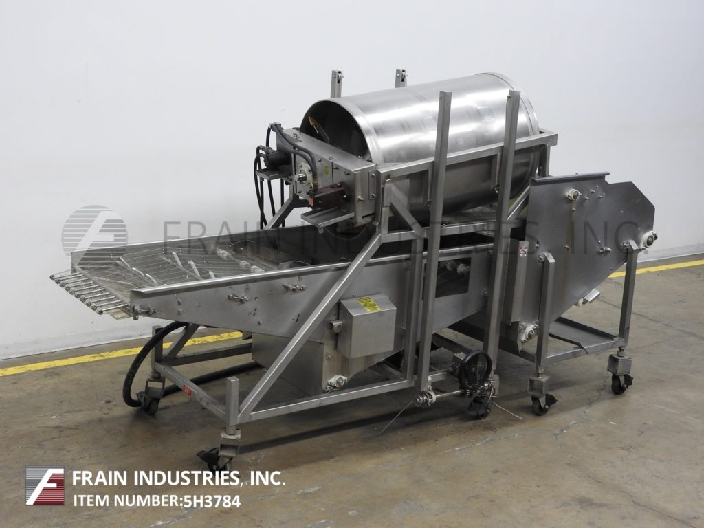 返回所有设备Nothum, FD-24型,不锈钢,旋转筒式面包机,每小时产品的数量和磅数-取决于材料和应用。配备一个26“宽x 45”长的电线馈送带瀑布面包应用器,32“直径x 48”长的滚筒,26“宽x 64”长的振动筛排出输送机和12“宽块筛输送。与供应侧液压集箱的快速连接软管一起完成,并从电厂动力pac接收液压,并分配到各种液压马达。安装在不锈钢底座上。