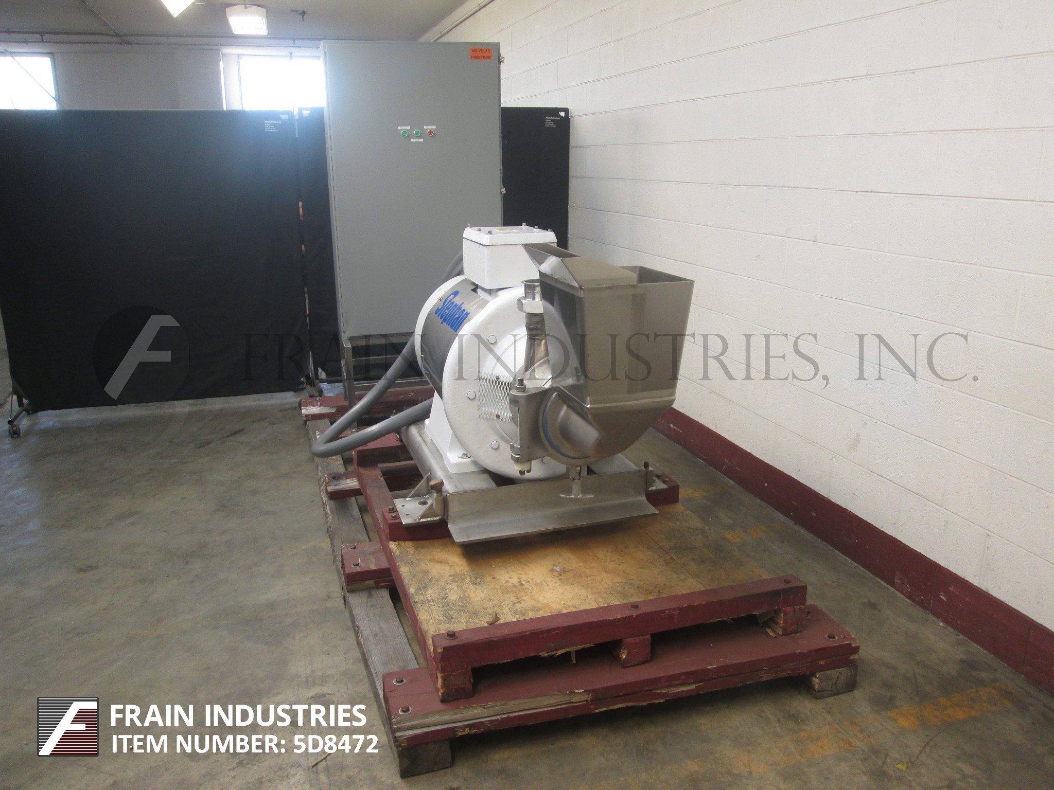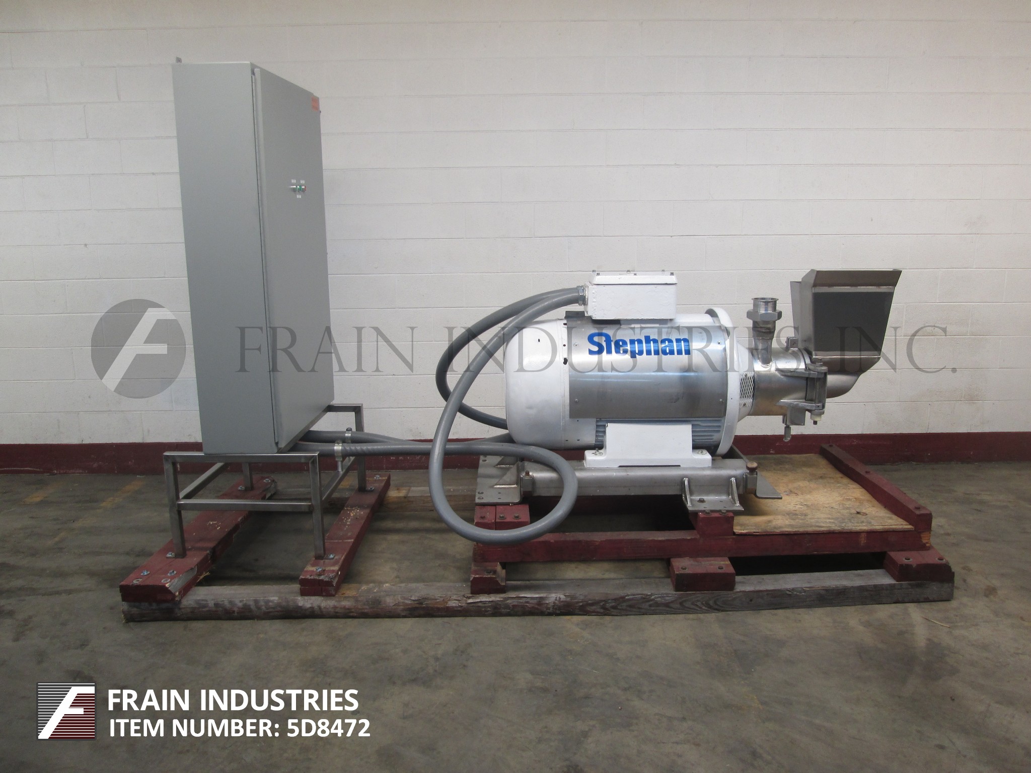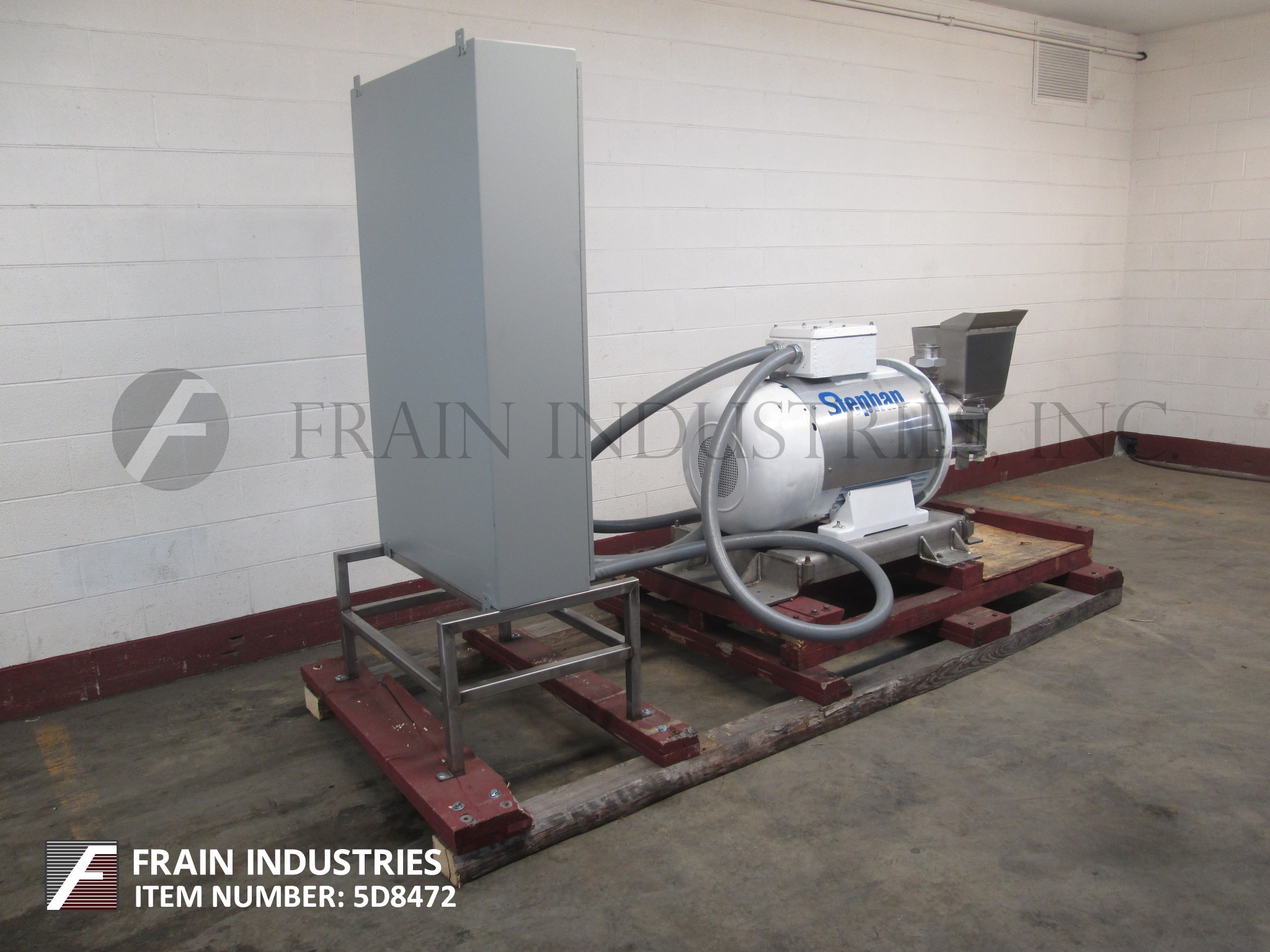 返回所有设备Stephan机械型号CHD10011CS不锈钢,微切割,双切割乳化剂额定从0到8000磅每小时-取决于材料和应用。配备14-1/2"长x 12-1/2"宽x 17"深不锈钢产品料斗,10"直径2片切割头包括进料螺杆,进料盘,钨钢齿和4-1/2"外径卫生排放和200马力电机驱动。安装在不锈钢底座上。适用于生产腊肠、腊肠、婴儿食品或其他煮熟的稳定乳剂。