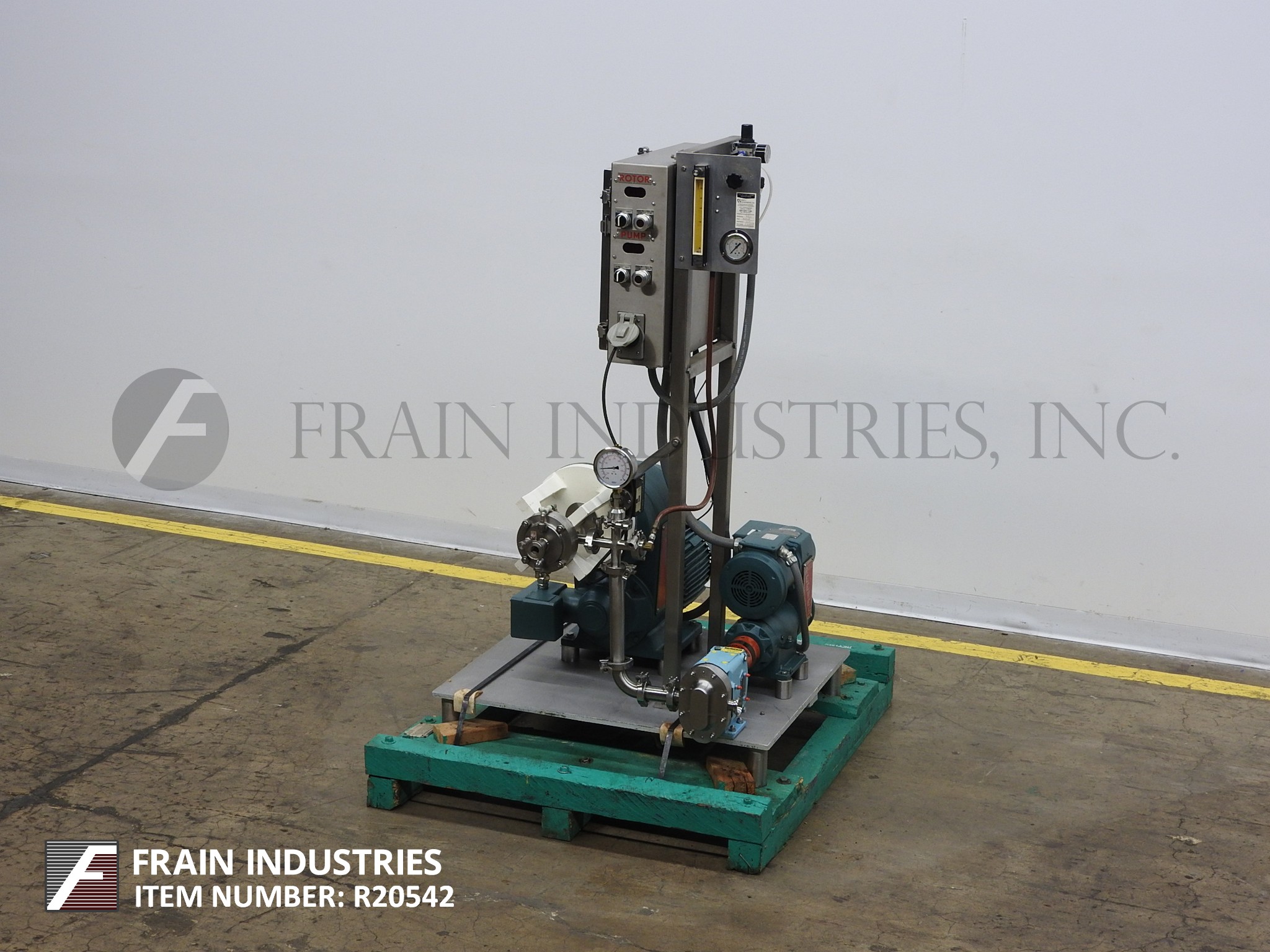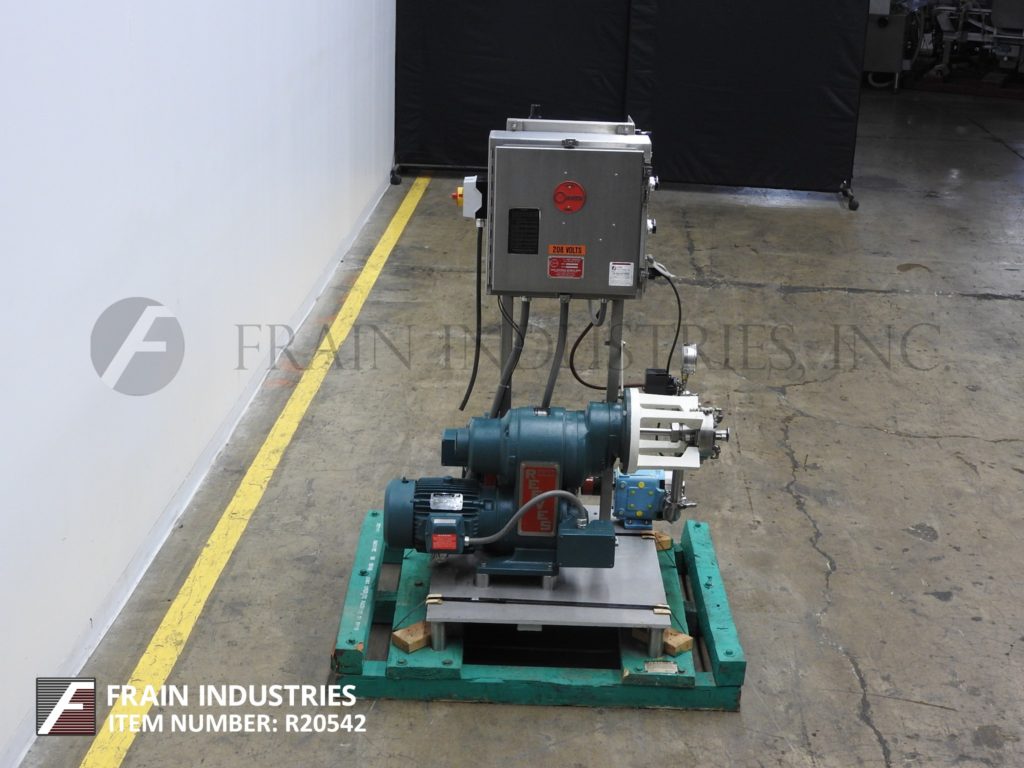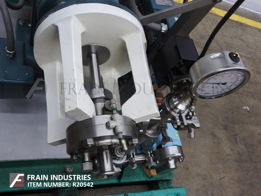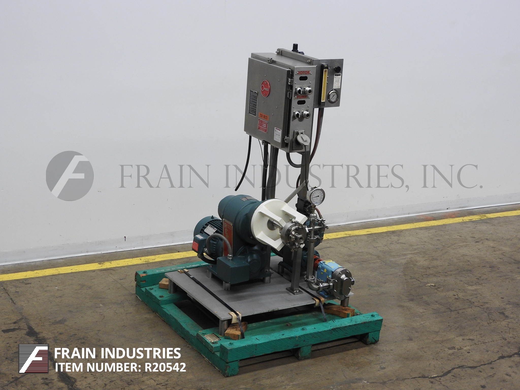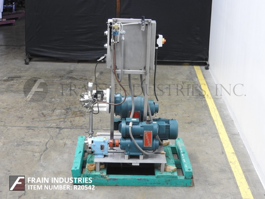 Back to All EquipmentOakers Model 4MB3A, lab model, continuous mixer, aerator rated from 150 lbs to 500 lbs per hour – depending on materials and application. Equipped with mixing head of two stators and a rotor, and is assembled with the stators surrounding the rotor. The rows of blades on the rotor are located between those on the stators, with no contact between moving and stationary elements. The mixing takes place between the teeth of the rotor and each of the two stators. Ingredients enter the head through the center of the rear stator, flow in a swirling path between the blades of the rotor and rear stator to the outer circumference of the stator cavity, then between the teeth of the front stator and rotor and out the center of the front stator. Product is discharged under pressure, it may be piped directly to the point of use thus eliminating any manual handling of the finished material. Air or other gas may be incorporated in the mixture and evenly distributed throughout the whole mass. The stator members are jacketed through which coolants may be circulated, thereby removing heat energy added as a result of the mixing action.