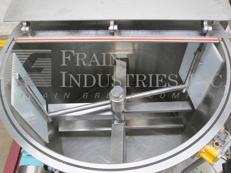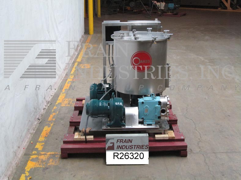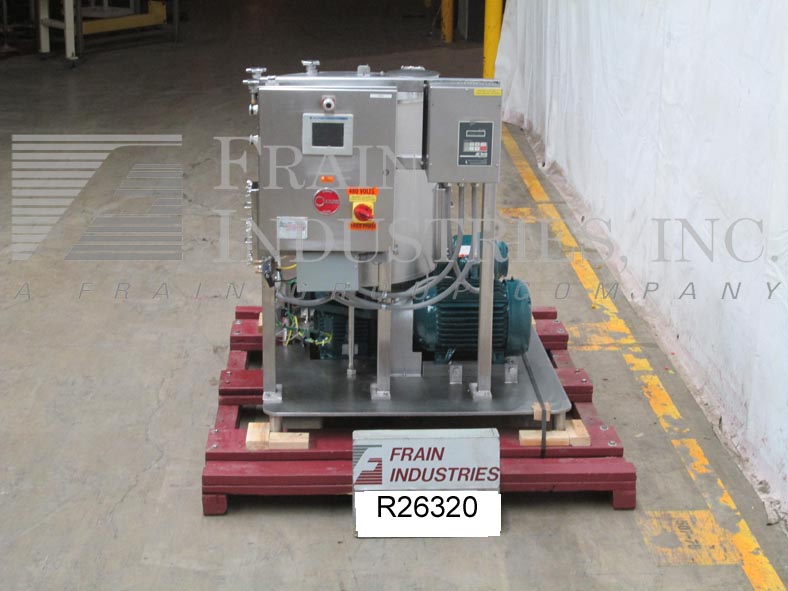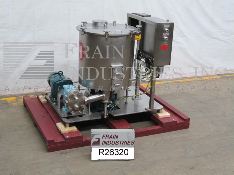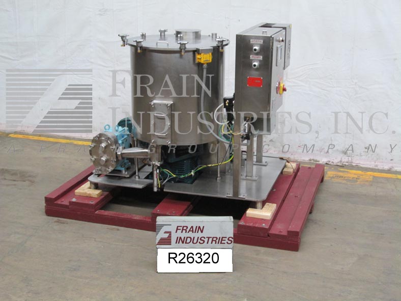 返回所有设备ET Oakes 30SMV151型批,不锈钢,泥浆搅拌机和传输系统额定500磅批,每批4至9分钟的混合次数-取决于材料,应用和机器配置。28“ID x 30”直壁不锈钢搅拌罐与半翻转螺栓下盖与磁性安全开关,两个静止拉出定子组件每一边和内部旋转混合叶片底部平台安装15马力电机驱动器。Waukesha 60型正排量转移泵3-1/2“外径螺纹侧进口/出口端口双翼转子,o形密封圈和2马力电机驱动,确保快速和全面的产品转移,现在搅拌机准备接受另一批。A/B控制器与按钮控制,数字读数和A/C启动包,安装在68"长x 48"宽不锈钢平台与腿。