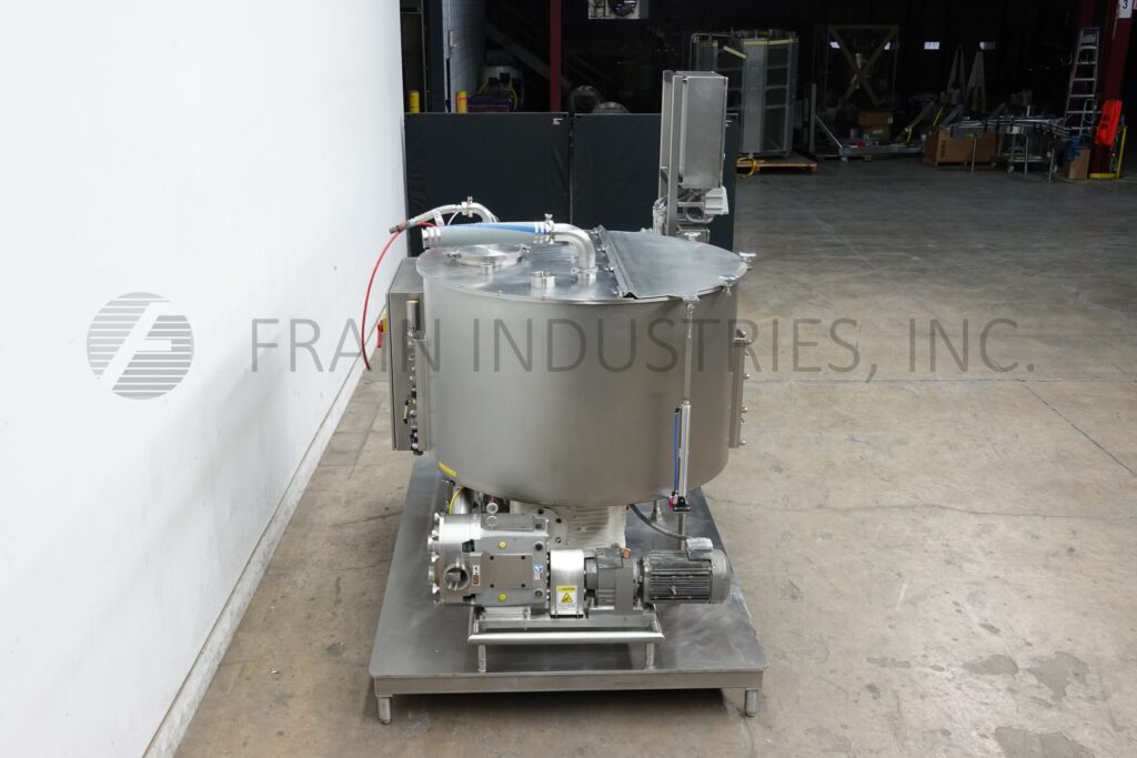 Back to All EquipmentOakes Model 60SMV751, Stainless steel, continous motion, slurry mixer and transfer system rated up to 440 gallons or 2,000 lbs of product per load with 15 minutes or less mix times – depending on materials, application and machine configuration. Equipped with 60" ID x 36" straight wall stainless steel product mix tank with pnuematic flip up cover and magnetic safety switch with (2) stationary pull out stator assemblies one each side and inner rotating mixing blades with bottom platform mounted motor drive. Waukesha Model 200U1PD transfer pump has 4½" OD / 4" ID inlet / outlets ports with twin wing rotors, O-Ring seals, 10 Hp motor drive to ensure quick and total transfer of product and now mixer is ready to receive another batch. Control panel has A/B controller and panel view with digital readout, rotor, pump and e-stop push button controls. A/C starter package and A/B poweflex VFD. Mounted on 102" long x 79" wide stainless steel platform with legs.