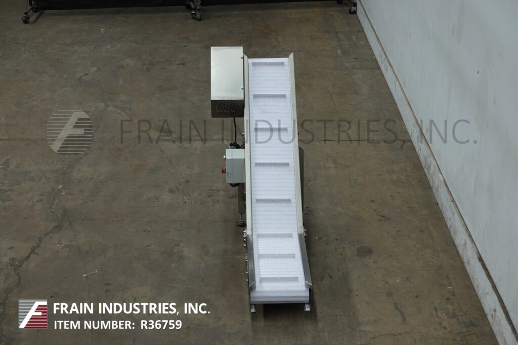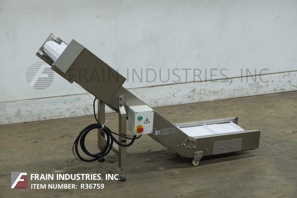Back to All EquipmentOhlson, Model VFFX-35, stainless steel inclined cleated conveyor with amount of product per hour – depending on materials and application. Equipped with 10" wide x 69" long belt with 1¼" high cleats set on 9" centers. 21" long horizontal run has 7" in feed height. 48" long incline section with 37" discharge height and variable speed controller. Mounted on stainless steel frame with casters.