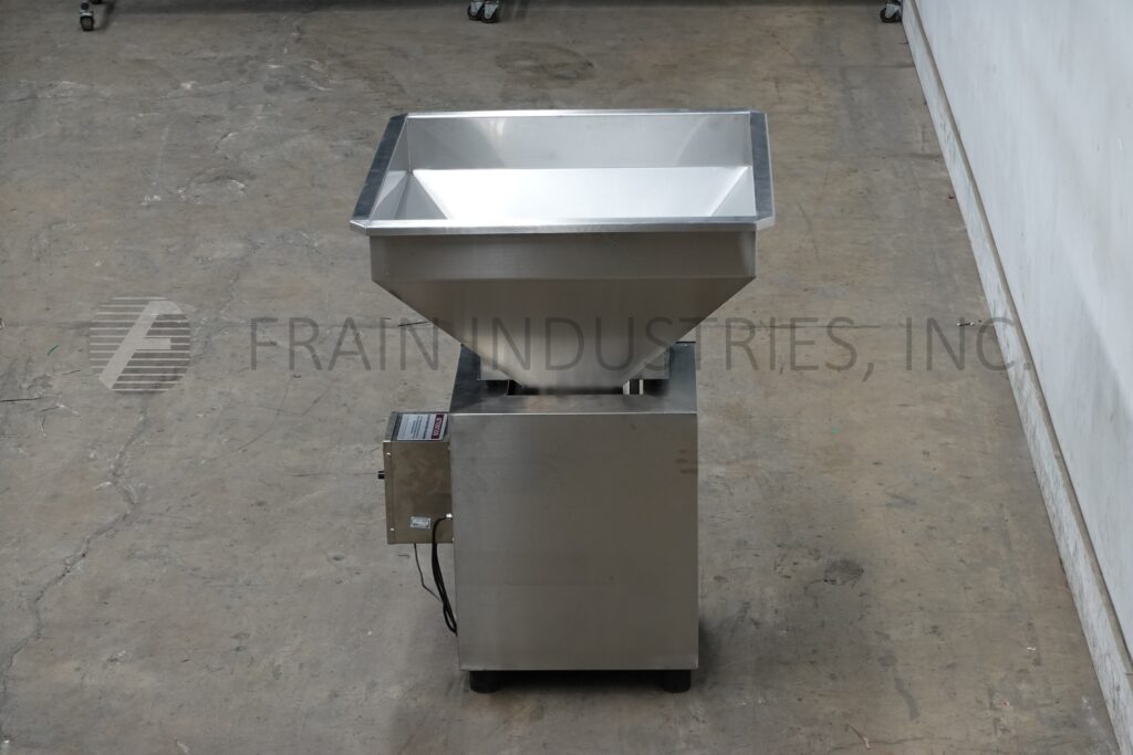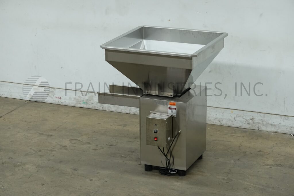 Back to All EquipmentOhlson, 9" wide x 28" long, vibratory feeder. Equipped with 31"L x 31"W x 24"D hopper, stainless steel bed with 5" high side walls and 22" discharge height. Mounted on stainless steel legs and leveling pads.