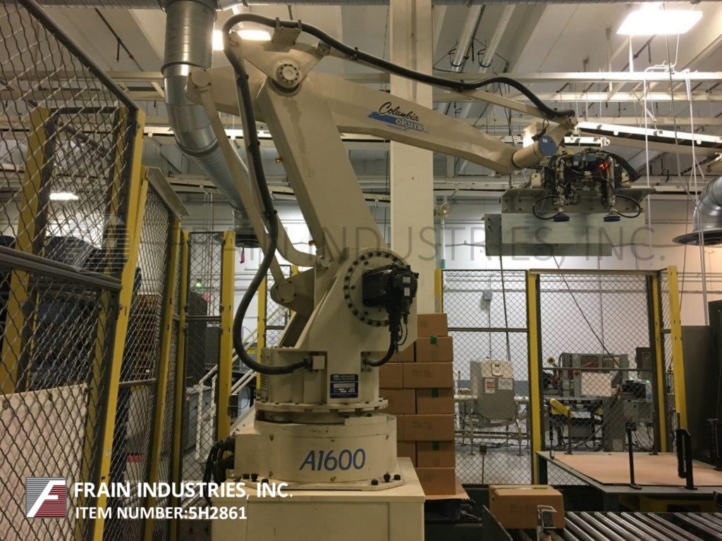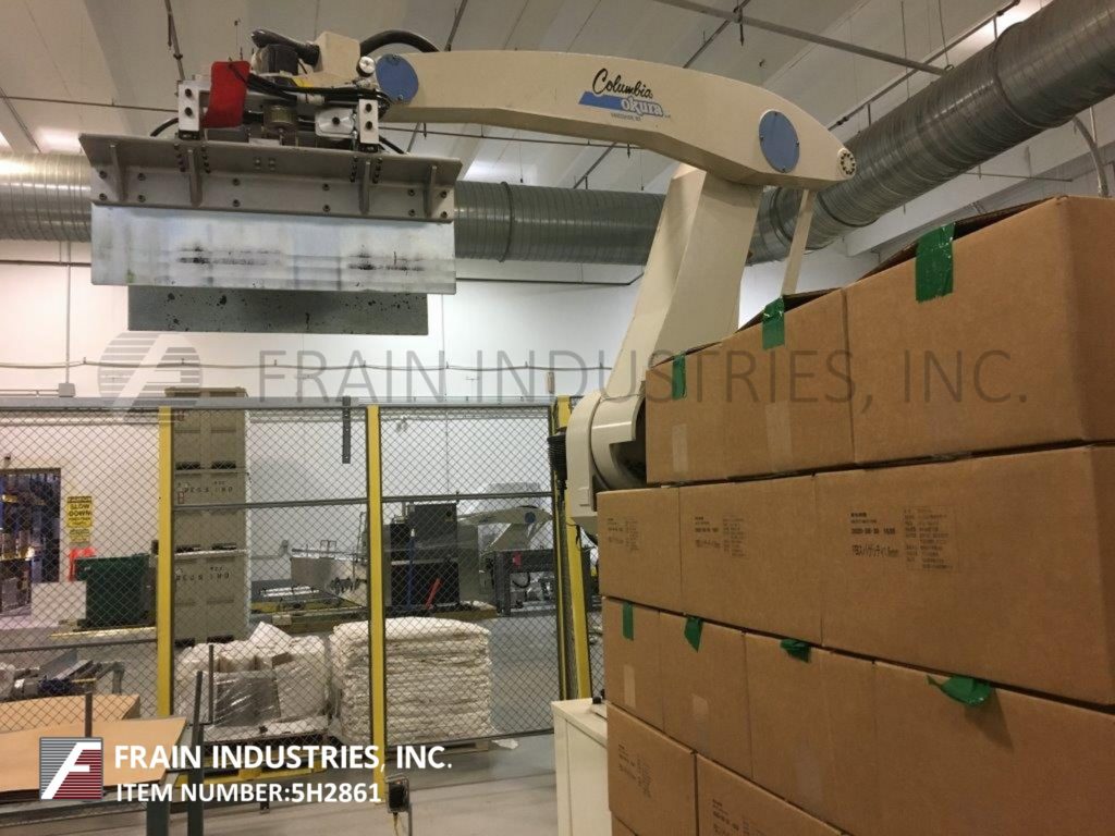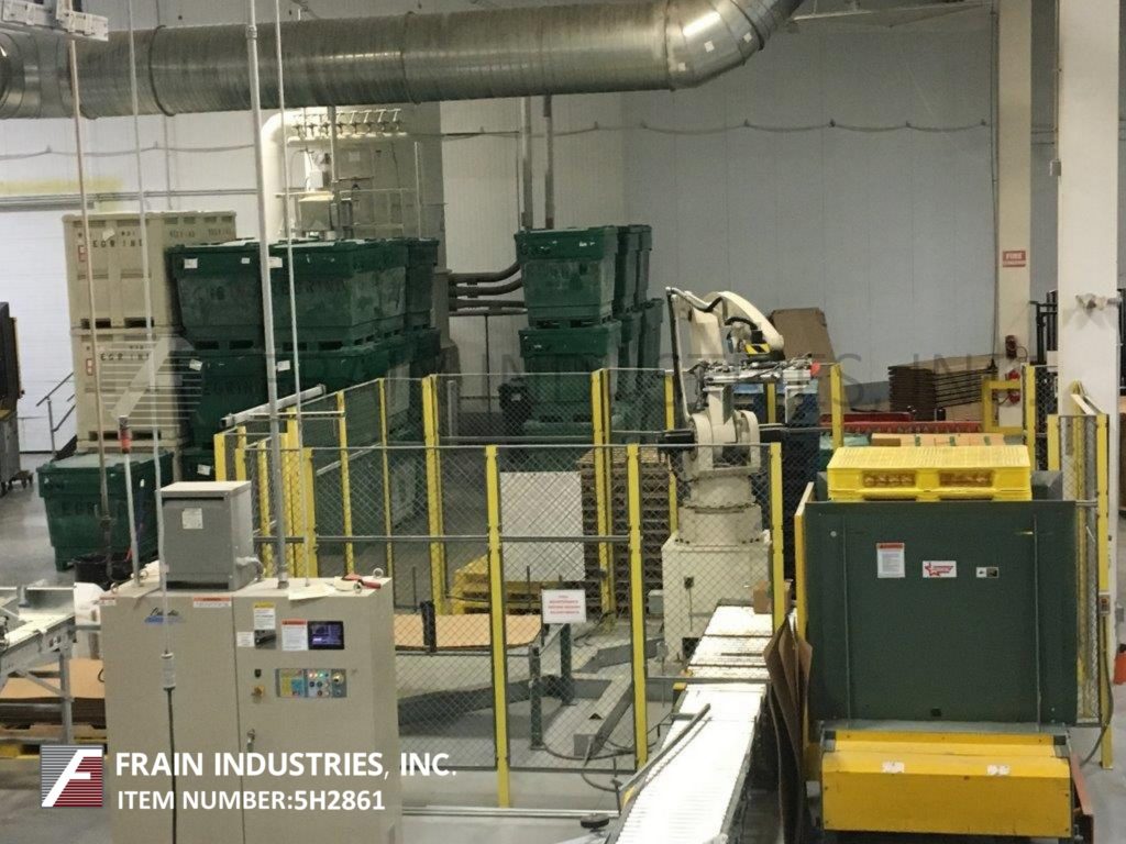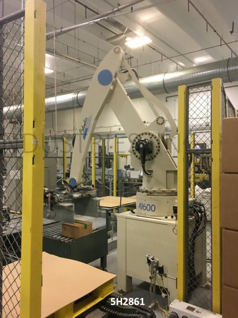 返回所有设备OKURA型号A1600,单机械手,(4)轴,挑选码垛机臂均高达1,600袋或每小时1,100例 - 取决于材料和应用。配备垂直多关节,极性荷兰丁系统。最大负载容量:140千克。工作范围:R轴(旋转)320°,D-AXIX(上/下)60.7“,O轴(正向/返回)92”,T轴(手腕)440°。最大高度:2,474mm,单壳式夹具效应器端。带A / B PLC控制器和触摸板的遥控器具有主电源和电机电源开/关,开始,停止,电子停止控制。安装在重型(4)腿基架上。