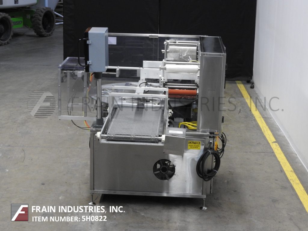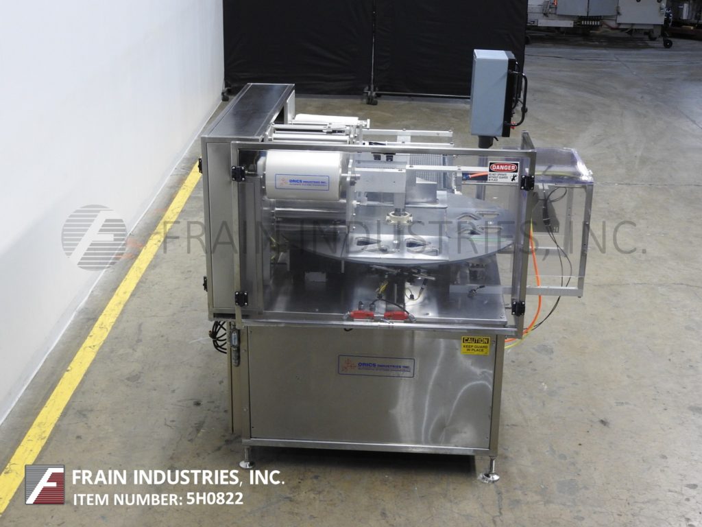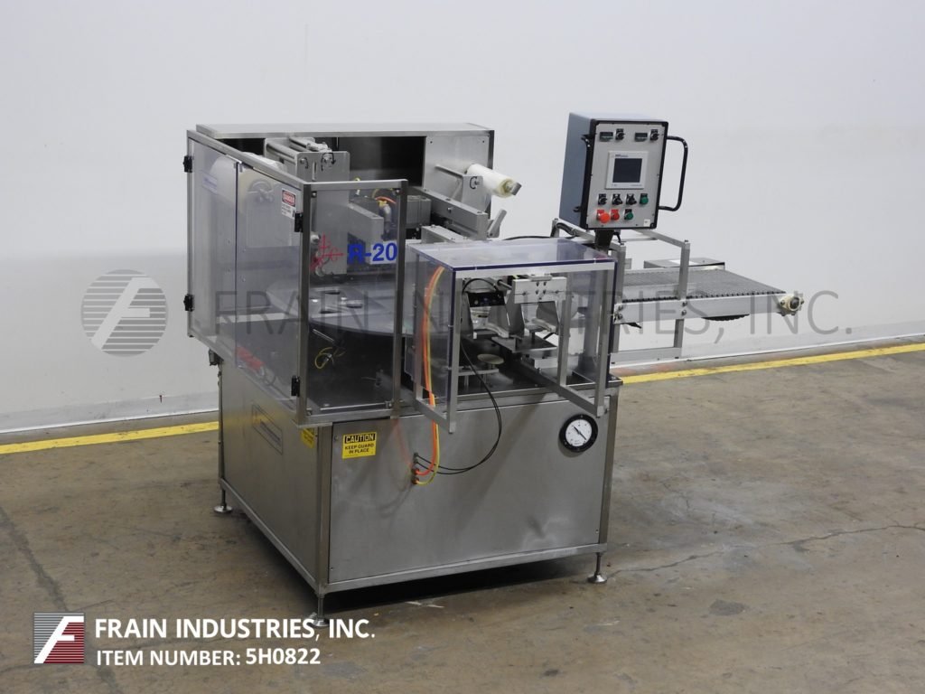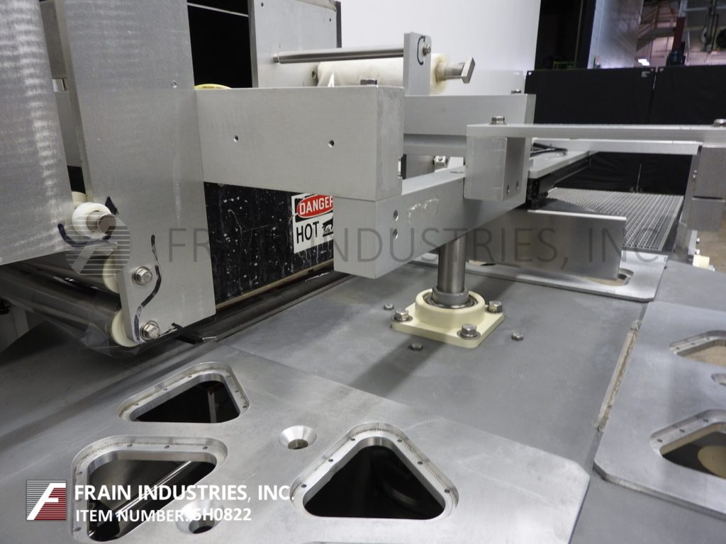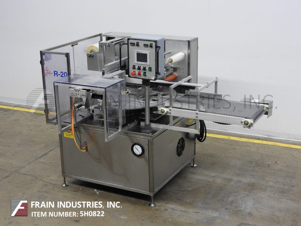 返回所有设备Orics, R-20型,MAP, 4工位,旋转托盘封口机。额定每分钟10到13次-产品数量-取决于材料,应用和机器配置。配备一个48"直径的产品转台与一个空气操作,夹持托盘进料,(4)站,18"长x 12"宽密封头,真空室组件与气体冲洗,可调密封温度和压力与Busch 5 hp真空泵,12"薄膜网幅宽度,自动卷膜和空气操作的ram放电到36英寸长x 18英寸宽的塑料flexlink放电输送机。控制面板采用GE Panuc控制器,Orics OI-1060 PLC触摸板显示,按钮停止/启动,输送机和转台速度控制,jog/run开关,e-stop。有机玻璃防护罩,联锁关闭。