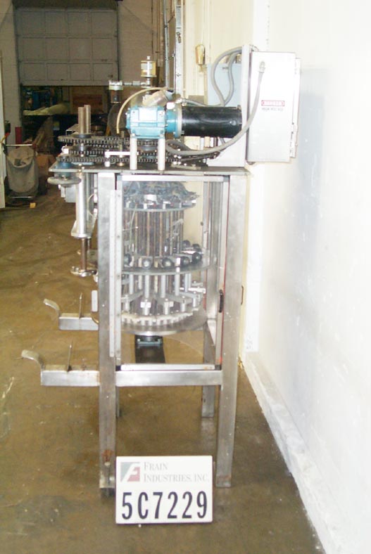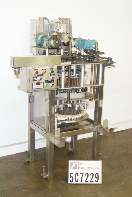 自动16头旋转孔减速机式盖插入器,速度从50到200瓶每分钟-速度取决于材料和应用。最后一次用于美容手术,用于防晒油类型容器的20毫米直径限制帽。配有链条式进料输送机。