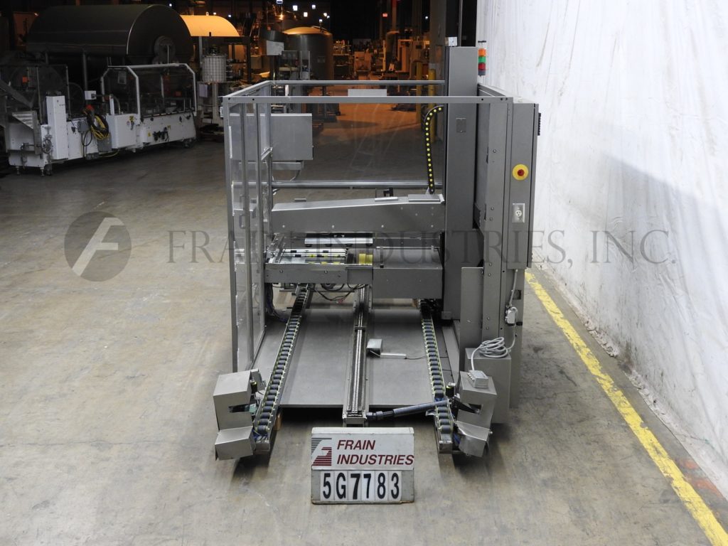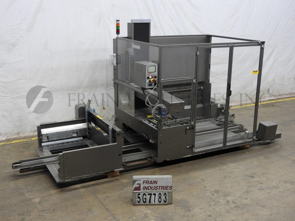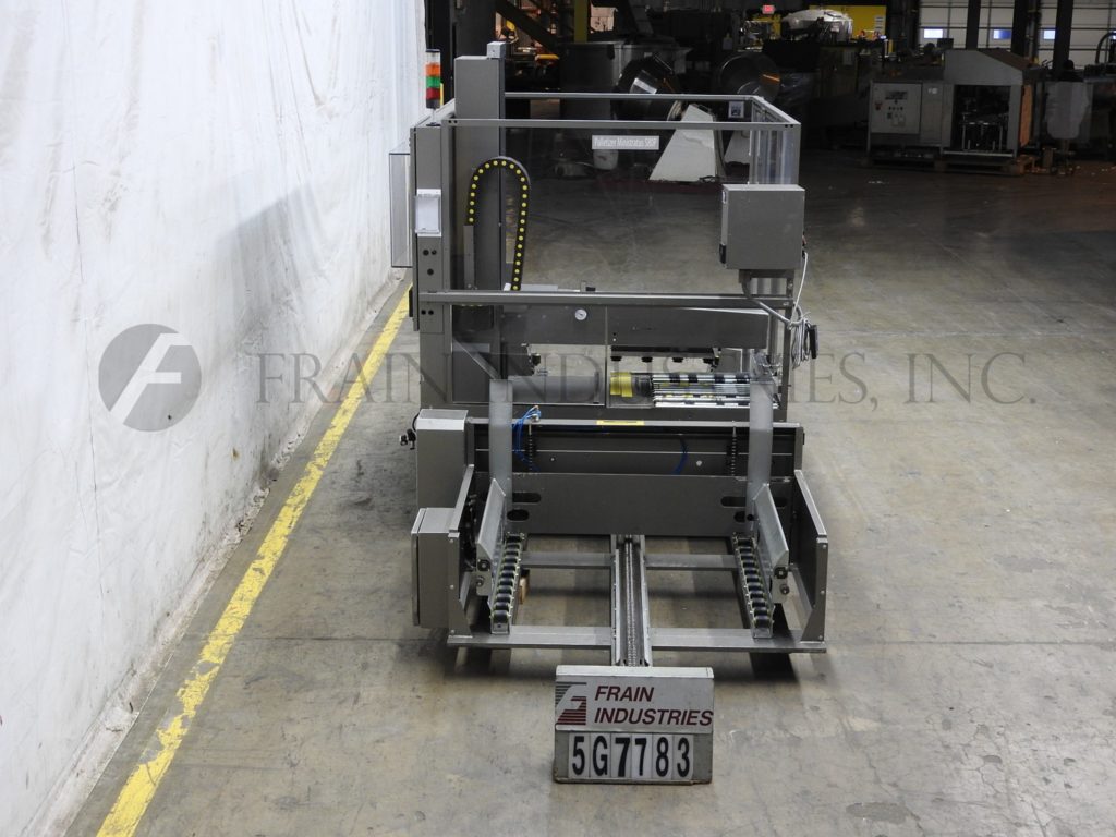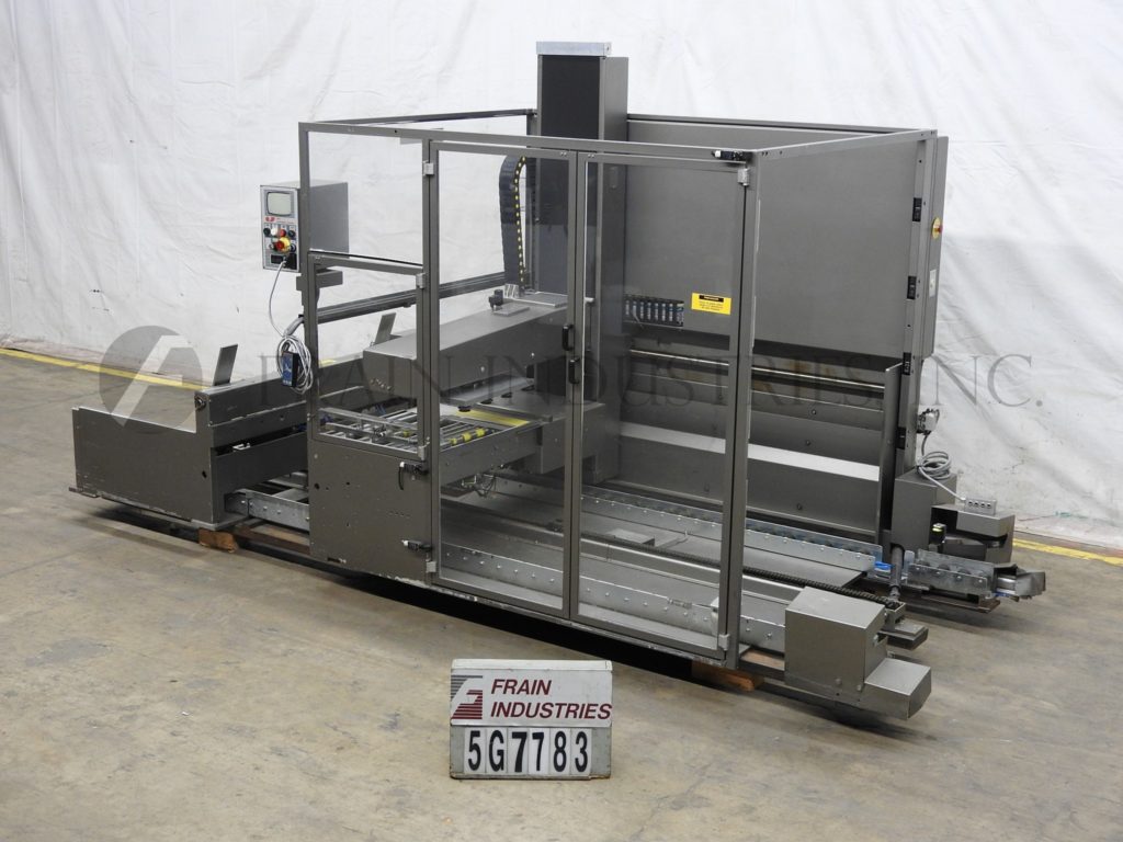 Back to All EquipmentPRB Packaging Systems, Model ministratus, 4 axis, robotic arm, vaccum pic-n-place palletizer. Rated from 2 to 6 cycles per minute – depending on materials, application and pack pattern. Pallet size: 37½" long x 42½" wide x 60" high. Case Size range: 6" to 23½" long x 4" to 15¾" wide x 3¼" to 23½" high. Equipped with 32" long x 43" wide x 24" high empty pallet dispenser, 178" long x 1½" wide center chain conveyor (2) 164" long x 2" wide side roller conveyors 23" long x 23" wide in feed product roller conveyor, 20" x 10½" (8) suction cup vaccum head mounted on 48" long robotic arm, display screen and hand held programming controller. Robotic arm controlled by AB PLC and capable of moving in (3) dimensions plus case rotation and has ststis light bar. Mounted on heavy duty frame.