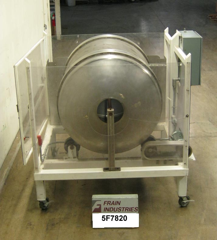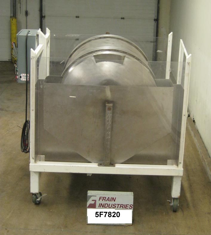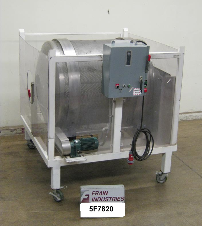 不锈钢,连续运动,圆柱形抛光滚筒。滚筒尺寸:直径42";54”的长度。配备一个24" x 24"铰链门负载区域,三个1"高挡板,不锈钢排放溜槽与8" x 8"出口,a /B变速控制,和联锁Lexan安全防护。安装在施法者。