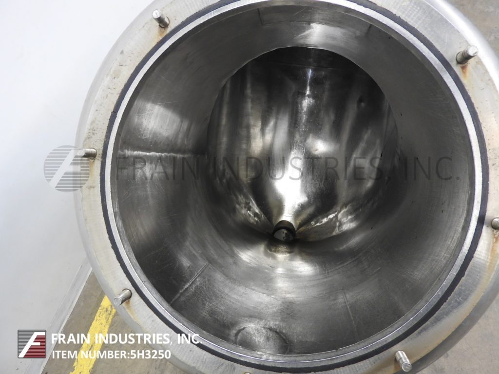返回所有设备帕特森凯利,10英尺³,304不锈钢,双壳混合器。额定75磅/英尺³和每小时Ibs -取决于材料,应用和机器配置。配备(2)18“ID产品端口螺栓下盖,(2)44”长的侧v墙和(2)15”长的内v墙。4"ID蝶阀排气口,12"地间隙,2马力驱动。要求80"的吊顶间隙,34"的摆动半径/ 68"的摆动直径。安装在油漆基础框架。