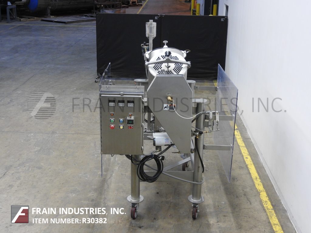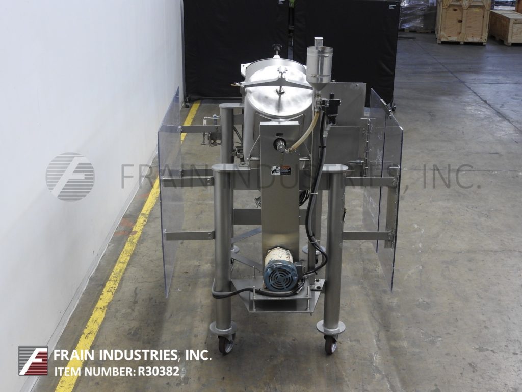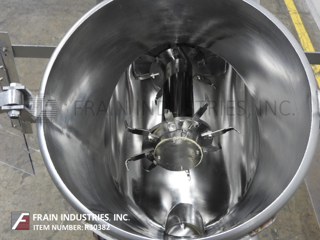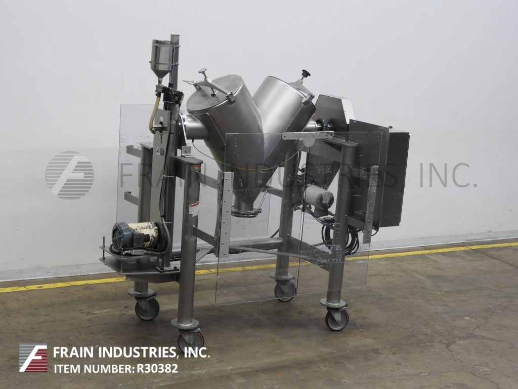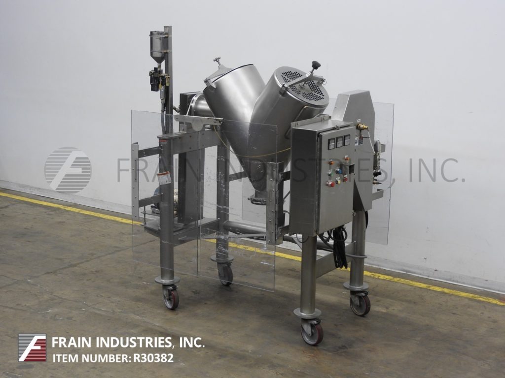 Back to All EquipmentPatterson Kelly, 5 ft³, 316 stainless steel, twin shell mixer. Rated to 70 lbs per ft³ with Ibs of product per hour – depending on materials and application. Equipped with (2) 18" ID product ports with bolt down covers, (2) 34" long side V-Walls and (2) 10" long inner V-Walls, liquid solids bar and 6"ID butterly valve discharge with 36" ground clearance. Requires 96" ceiling clearance with 30" swing radius / 60" swing diameter. Has push button start / stop controls and digital timers. Mounted on (4) stainless steel frame with casters and safety guarding.