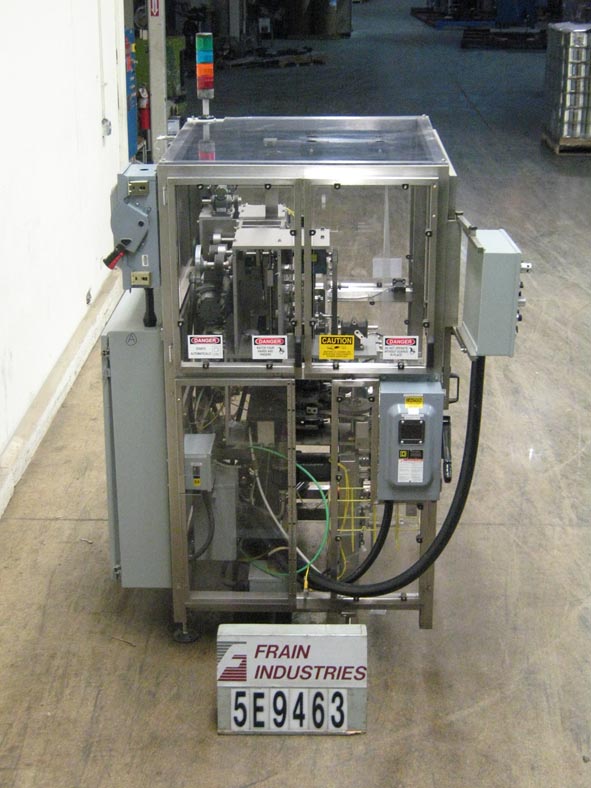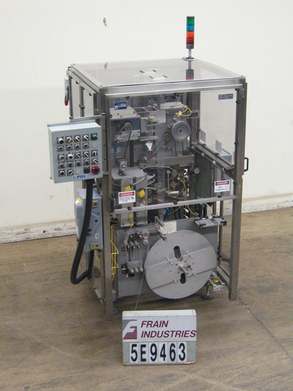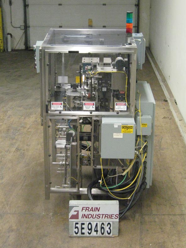 返回所有设备PDC 65ERL型,自动,明显的篡改,颈带/袖标签额定50至200个颈带,50至175个袖每分钟-取决于材料和应用。带/套筒尺寸范围:3/8"到3-1/4"直径;5/8英寸到7英寸的高度。设有立式穿孔轮、8工位回转式集装箱处理系统、贴膜装置、静电消除器、动力送膜驱动、出料传感器、低膜指示灯、张膜器、动力放膜器、PLC、联锁安全防护装置、不锈钢框架。安装在现有的输送机上。