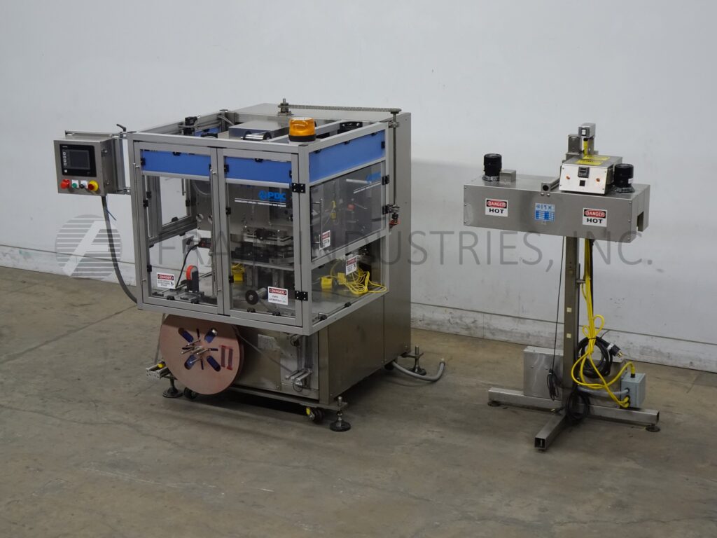 Back to All EquipmentPDC, Model 75-M-ID, automatic shrink sleeve labeler and tamper evident neck bander. Rated up to 400 containers per minute – depending upon materials, application and machine configuration. Band Diameter: 0.375" to 3.5", Band height: 0.625" to 9". Equipped with 12" long product in feed worm screw, star wheel container indexing, 22" OD band reel low material / no band sensors and 36" long hot air tunnel with a 5" wide x 4" high aperture. Control panel has an AB controller and touch screen HMI.