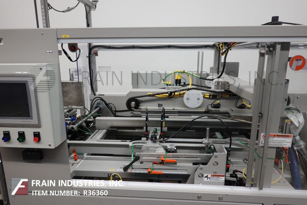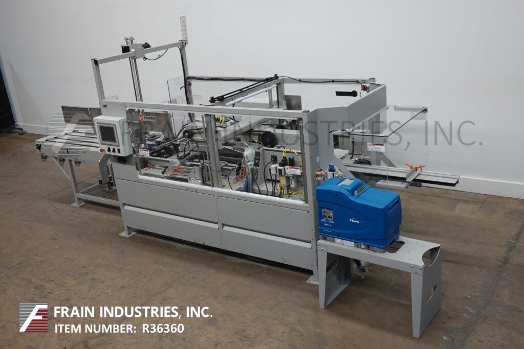 Back to All EquipmentPearson, Model CE35G, Automatic, inline, case erector and hot melt glue bottom sealer rated from 10 to 35 cases per minute – depending on materials, application and machine configuration. Mild steel construction with standard powder coat flint grey fine texture coating. Case size range: 6" to 23½" in Length; 5" to 16" in Width, 3½" to 18½" in Depth and capable of handling CSSC, FOL, HSC, RSC and RSC with integral divider cases with proper change parts. Equipped with extended (4) chain automatic blank case magazine, suction cup pic n place with case erecting squaring system and top hold down, hand crank height and width adjustable, has top flap lifters and rear flap closers with plow and Nordson hot melt glue system. Control panel has A/B controller with A/B PanelView touch screen HMI and statis light bar. Mounted on heavy duty frame with interlock safety guarding.