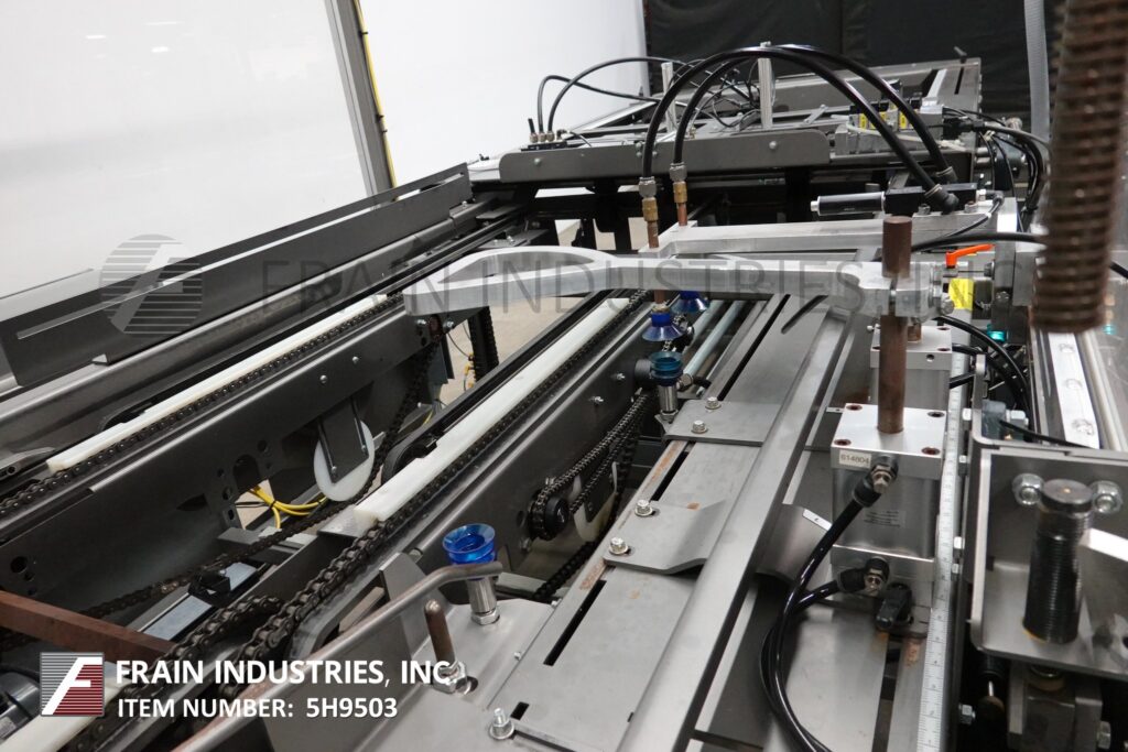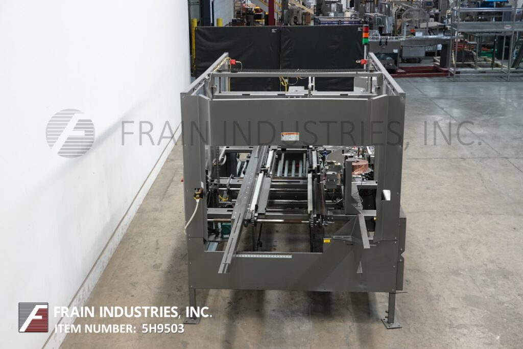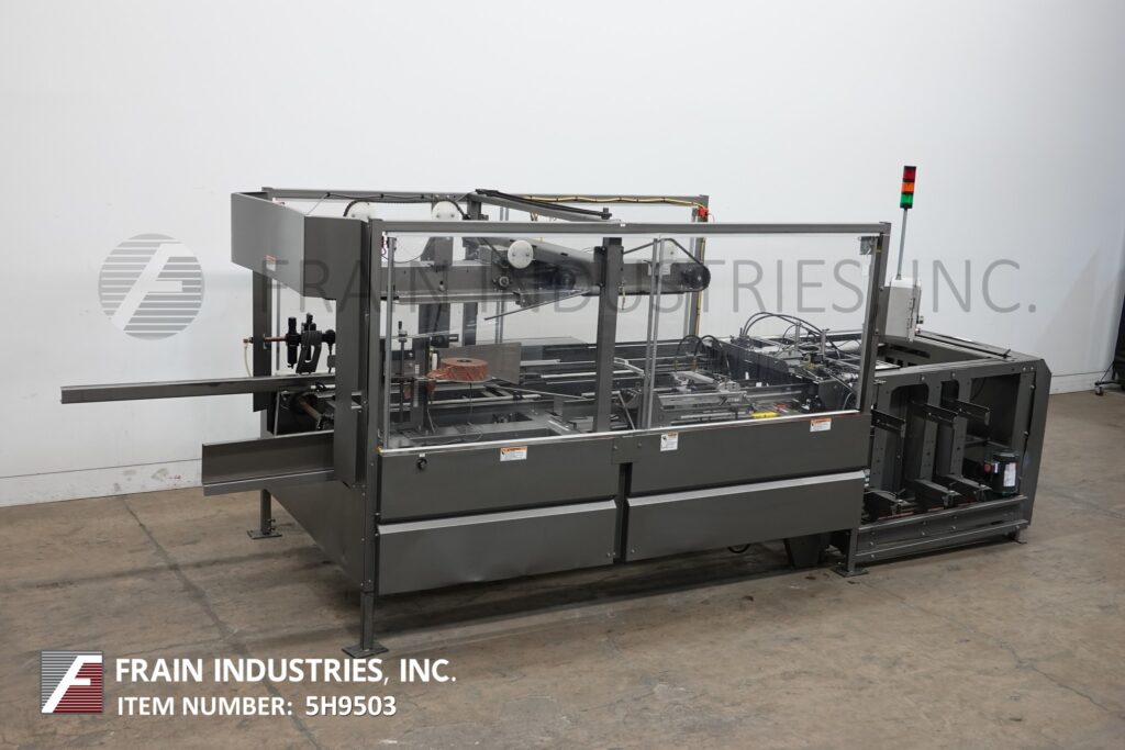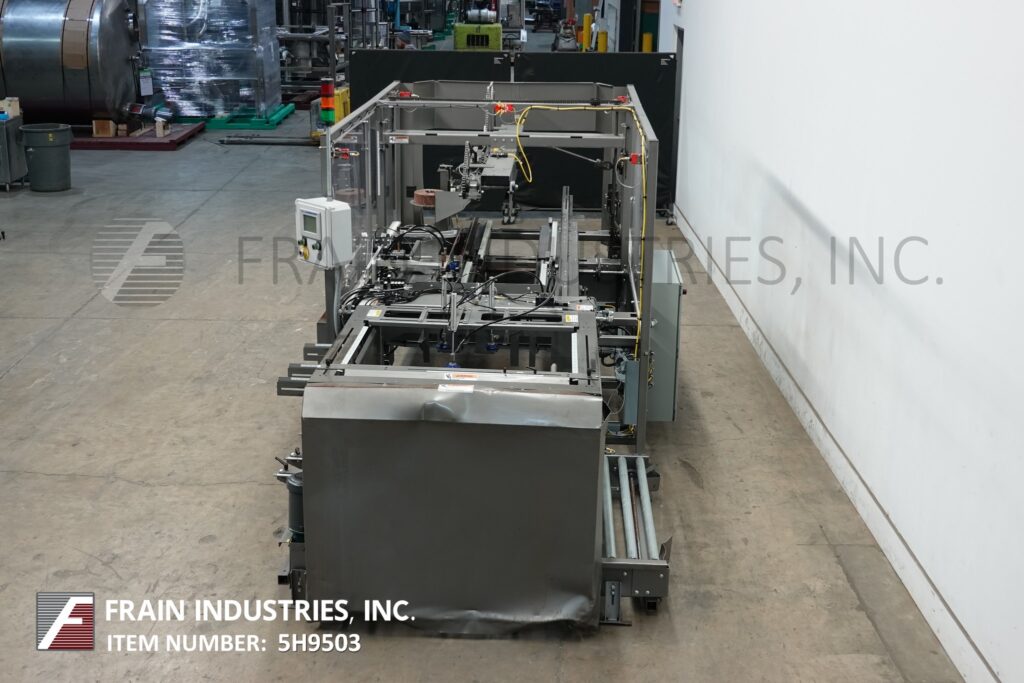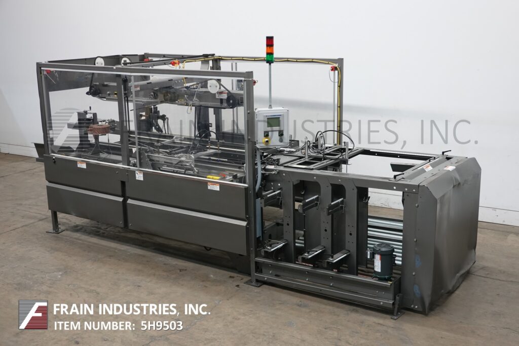 Back to All EquipmentPearson, Model CE35, Automatic, case erector and bottom tape sealer. Rated from 5 to 35 cases per minute – depending on materials and application. Case size range: 6" to 30" in Length; 5.5" to 24" in Width, 3.5 to 26" in Depth. Equipped with 25" high blank case magazine, suction cup pic n place and case erecting squaring system with top hold down, hand crank height and width adjustable, top flap lifters and rear flap closer plows with 3" wide bottom tape head. Control panel has AB controller with touch screen HMI. Mounted on heavy duty frame with interlock safety guarding.