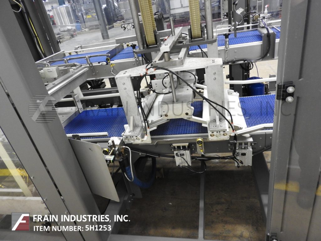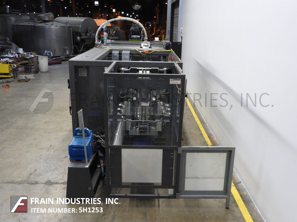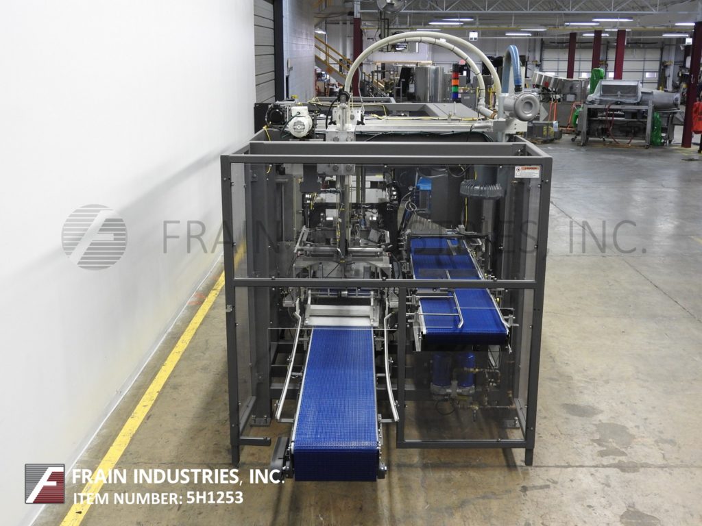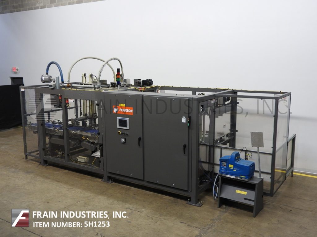 Back to All EquipmentPearson Model GTL-AN1, automatic, all in one, pick and place, case or tray erector, top load packer, hot melt glue sealing system rated from 25 to 150 packages and up to 10 cases or trays per minute – depending on materials, application and machine configuration. Erected case or tray size range: 8" to 20" in Length; 6" to 14" in Width; 1" to 8" in Depth with proper change parts. Equipped with 2 stack capacity blank case or tray magazine with lift and interlox conveyor thru the servo driven vacuum pick and place, to erecting, squaring and sealing section with Nordson ProBlue hot melt glue system to lugged transfer conveyor that position the cases or trays into interlox conveyor to the 2 axis servo driven pick and place loading section which picks the product from a side product conveyor to the case or tray, then moves to the sealing station were glue is applied to the ends and 2 flat plates push flaps down and inward to press closed and then to discharge conveyor. Control panel has A/B PLC controller with panel view, vari-speed controls with start and e-stop push buttons, interlock safety guarding and statis light bar. Mounted on heavy duty base frame. Capable of handling flexible, ridgid and semi-ridgid products into retail, club and convenience cases.