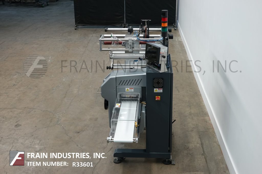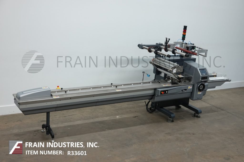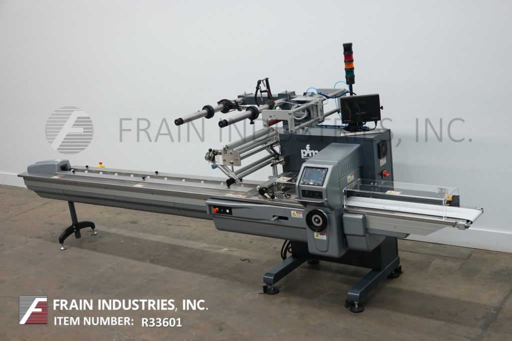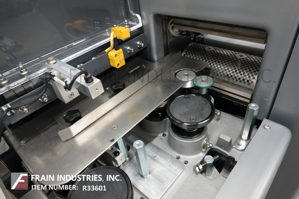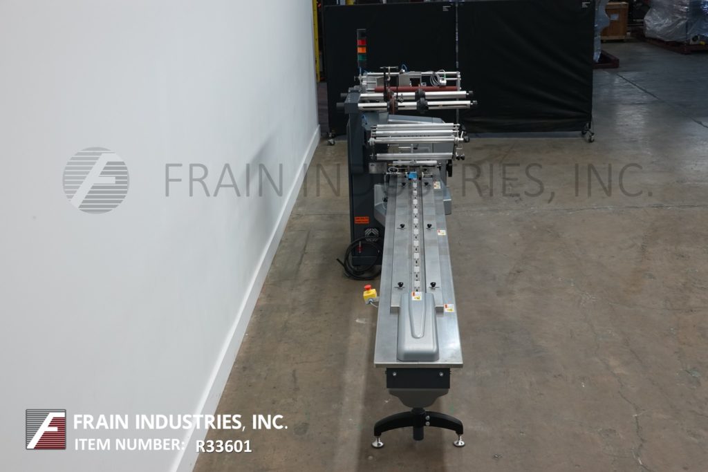 回到所有设备PFM模型珍珠,2-up,自动,3轴,伺服驱动,水平包装,每分钟30到150级产品 - 取决于材料,应用和机器配置。产品尺寸范围:1.6“至18”的长度;宽度3/8“至8.5”;高达3.9英寸高。配备60“长操作员装载区域,目前设有1-1 / 2”高速更换塑料凸耳,可在6英寸中心设置,可调节前,2°,8.6“宽x 1”厚锯齿密封钳口和翅片密封装配轮与互锁安全防护和42“长×8”宽新的新生产品放电输送机。Film spec’s up to 24" reel width; 14" OD reel, on 3" OD core. Control panel has PLC controls and touch pad controller with start, stop and e-stop push buttons. Mounted on base frame with (6) leveling legs.