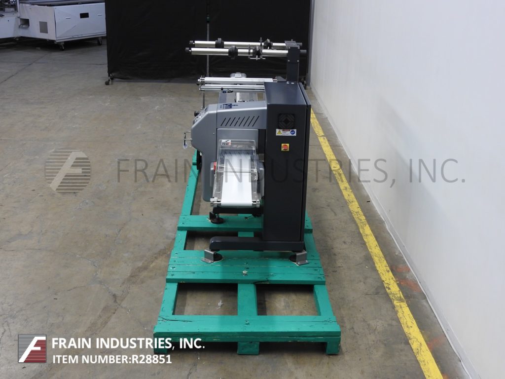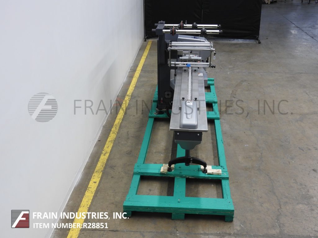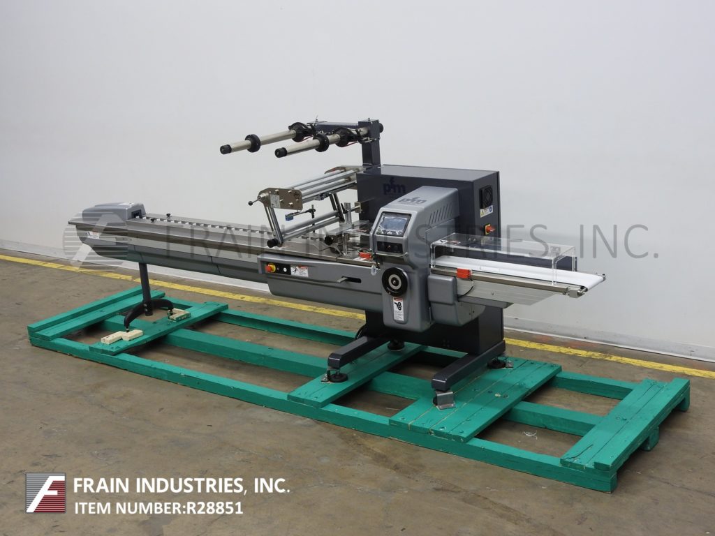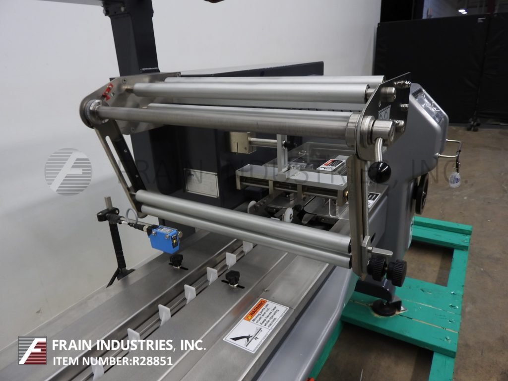 返回所有设备珍珠型,2-up,自动,3轴,伺服驱动,水平流包装额定从30至150个产品每分钟-根据材料,应用和机器配置。产品尺寸范围:1.6"至18"长度;宽度3/8"至8.8";高达4英寸的高度与适当的更换部件。配备96"长在饲料输送机1-1/2"高快速更换塑料耳和60"长负载区域,无产品/无袋,可调成型盒,2-up, 9"宽x 1-1/4"厚密封钳和鳍密封轮,联锁安全保护和41"长的新ophreme卸料输送机。胶片规格可达24”卷轴宽度;最高可达14”卷轴外径;1-1/2"外径芯。有(2)胶卷卷(1)用于额外的胶卷卷无拼接站。控制面板有PLC控制与触摸板控制器和读出,卷曲钳口和鳍片密封温度控制器,电源,加热器和运行,jog on / off开关启动,停止和e-stop按钮控制。 Mounted on base frame with (6) leveling legs.