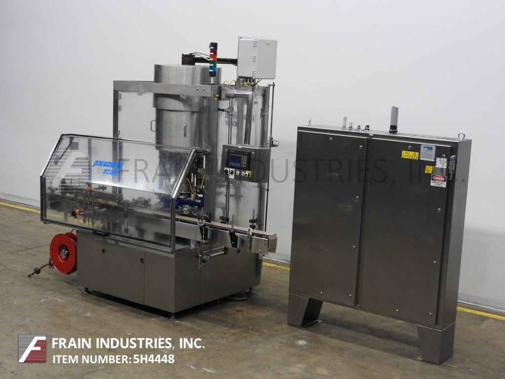 返回所有设备气压秤,型号TC450-8,自动,8头旋转卡盘压盖机额定从24至240个容器每分钟-取决于材料,应用和机器配置。瓶盖尺寸:高达100mm。容器尺寸:可达6.25"直径和4.81x 4.81方形与适当的更换部件。配备98”长x 3 - 1/2“宽容器输送机30“长蜗杆螺钉星形轮容器在饲料和虎印登山帽馈线36“x 32“x 20”盖料斗,100“长x 8“宽皮带有2个“高防滑钉上设置6”中心,帽进料槽,帽子摘掉,没有容器/没有上限,(8) 100mm摩擦卡盘盖设置在7-1/2"中心星形轮卸料和44"长x 3-1/2"宽卸料带式输送机。遥控器面板有A/B CPU控制器和A/B触摸板控制和面板视图与设置,运行开关与e-stop。安装在重型基础框架与联锁安全门保护和统计灯条。