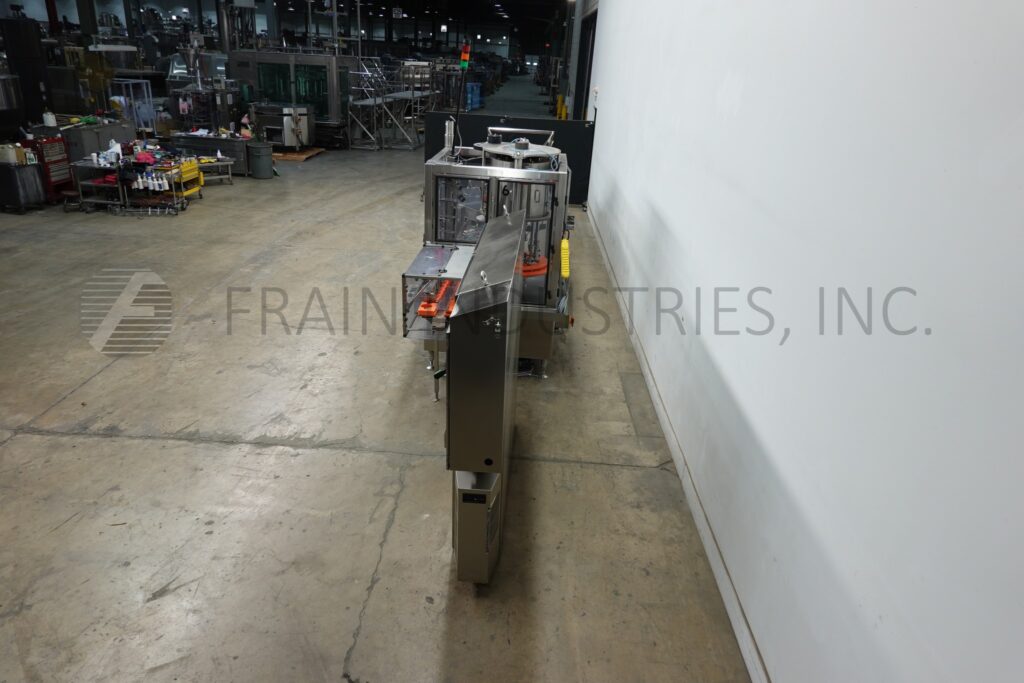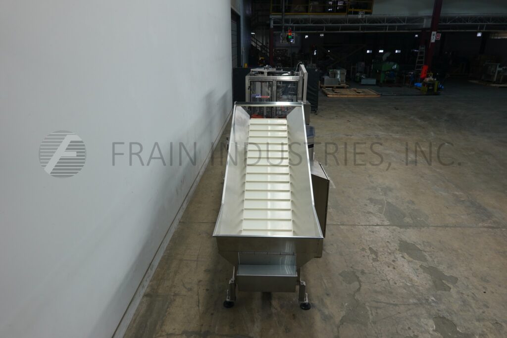 Hoosier Feeder Company Model FT50, 30 cu ft stainless steel, prefeeder and vibratory rigid disc centrifical feed system and inclined cleated conveyor with number of product per minute – depending on materials and application. Maximum plug size 89mm, Maximum container diameter 4.97" Maximum square container with turret pockets 3.93" x 3.93". Equipped with 26" long x 40" wide x 22" deep, stainless steel product hopper with 104" long x 23" wide incline product feed belt with 1" high cleats set on 6" centers and discharge chute with 51" discharge height. 48" diameter stainless steel vibratory feeder bowl with 2" wide x 1" high tracks with low product eye and control panel with feeder and bowl vari speed controls, start, stop, reset push buttons and statis light bar. Mounted on stainless steel base platform with height adjustable leveling legs.