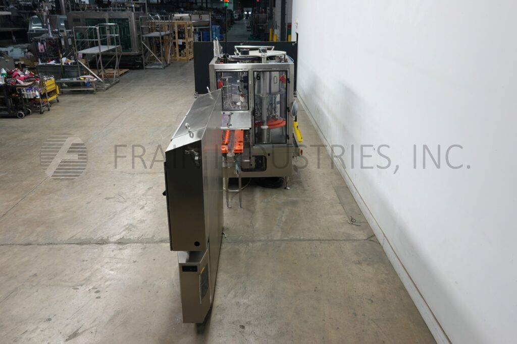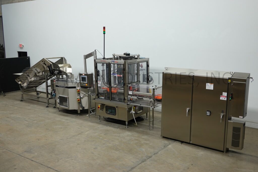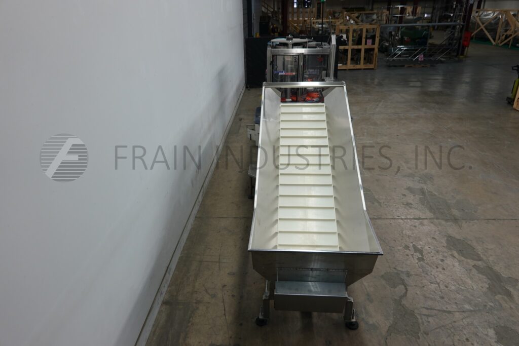 Hoosier Feeder Company Model FT50, 30 cu ft stainless steel, prefeeder and vibratory rigid disc centrifical feed system and inclined cleated conveyor with number of product per minute – depending on materials and application. Maximum container diameter 4.97" Maximum square container with turret pockets 3.93" x 3.93". Equipped with 26" long x 40" wide x 22" deep, stainless steel product hopper with 104" long x 23" wide incline product feed belt with 1" high cleats set on 6" centers and discharge chute with 51" discharge height. 48" diameter stainless steel vibratory feeder bowl with 2" wide x 1" high tracks with low product eye and control panel with feeder and bowl vari speed controls, start, stop, reset push buttons and statis light bar. Mounted on stainless steel base platform with height adjustable leveling legs.