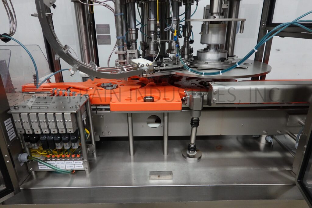 Pneumatic Scale, Model TC450-10C, plugger equipped with 52" long x 4½" wide container conveyor with 48" long worm screw to star wheel container handling, no container / no cap, (10) pluggers set on 5½" centers to star wheel discharge and (1) 28" long x 4½" wide discharge alongside of (1) 28" long x 4½" wide reject lane conveyor. Remote Control panel has A/B Panelview 1000 HMI touch screen controls and stop, start and e-stop buttons. Mounted on heavy duty base frame with interlock safety door guarding and statis light bar.