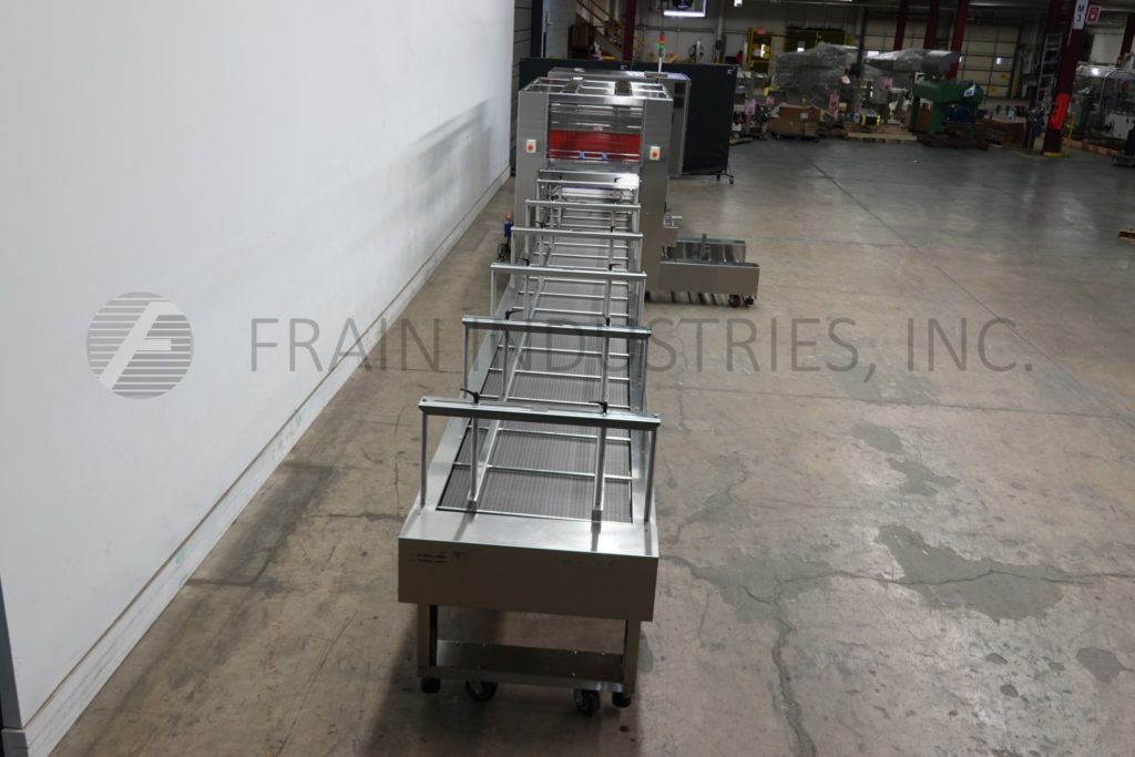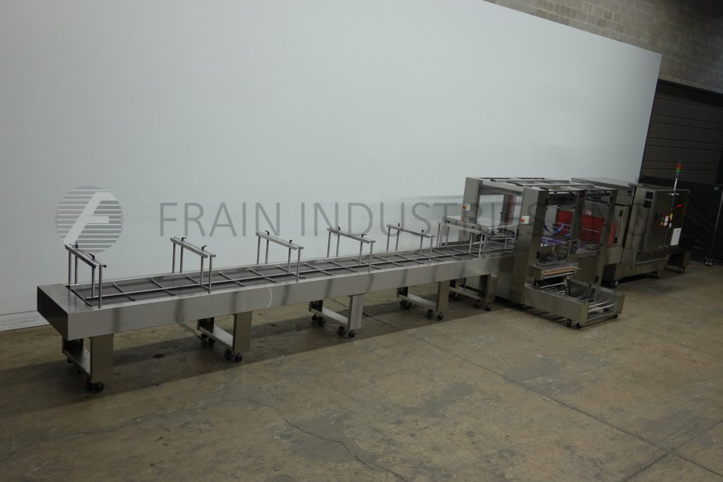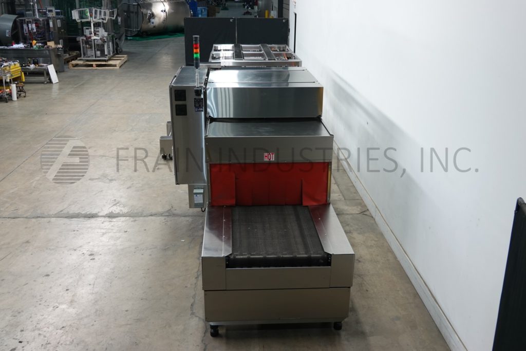Shrink tunnel has 16" high x 38" wide aperture x 100" long chamber with 30" wide x 160" long belt thru tunnel with (3) enclosed top mounted fans and (1) bottom discharge cooling fan. Control Panel has PLC controller with touch screen HMI has shrink wrap start and stop with tunnel start, reset, stop push buttons and infeed / outfeed zone controllers with e-stop, vari-speed controllers and statis light bar. Mounted on heavy duty frame and has interlock safety door guarding with safety switches.