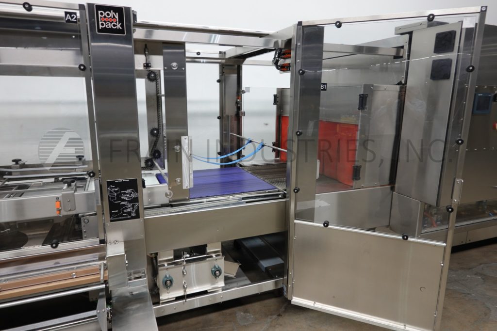 Back to All EquipmentPoly Pack, Model Clearprint 32L Series, Shrink wrapper with print registration, produces bullseye wraps using either clear, random printed or print registered film, with speeds up to 60 wraps per minute in single lane and 120 in wraps dual lane. Maximum bundle size: 21" Length; 28" Width; 14" in Height. Equipped with 28" wide x 220" long hand load lugged product in feed conveyor set on 16" centers. Side mounted carriage film roll with 30" width and 20" OD on 3" OD core.