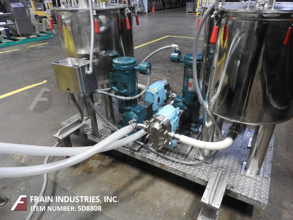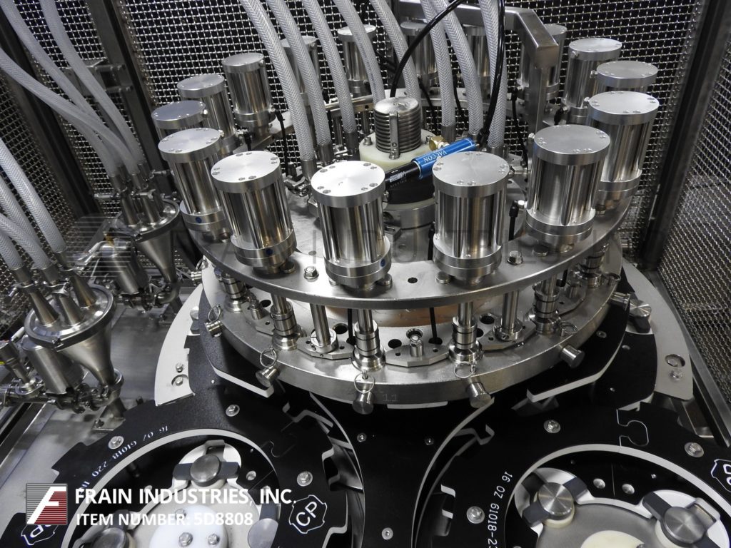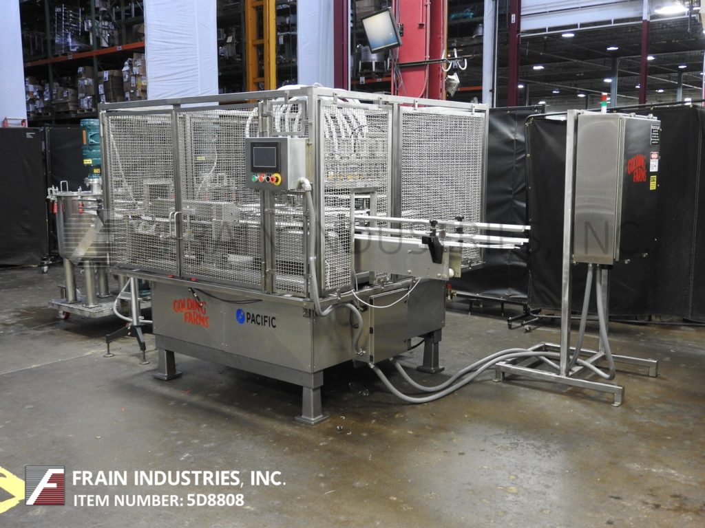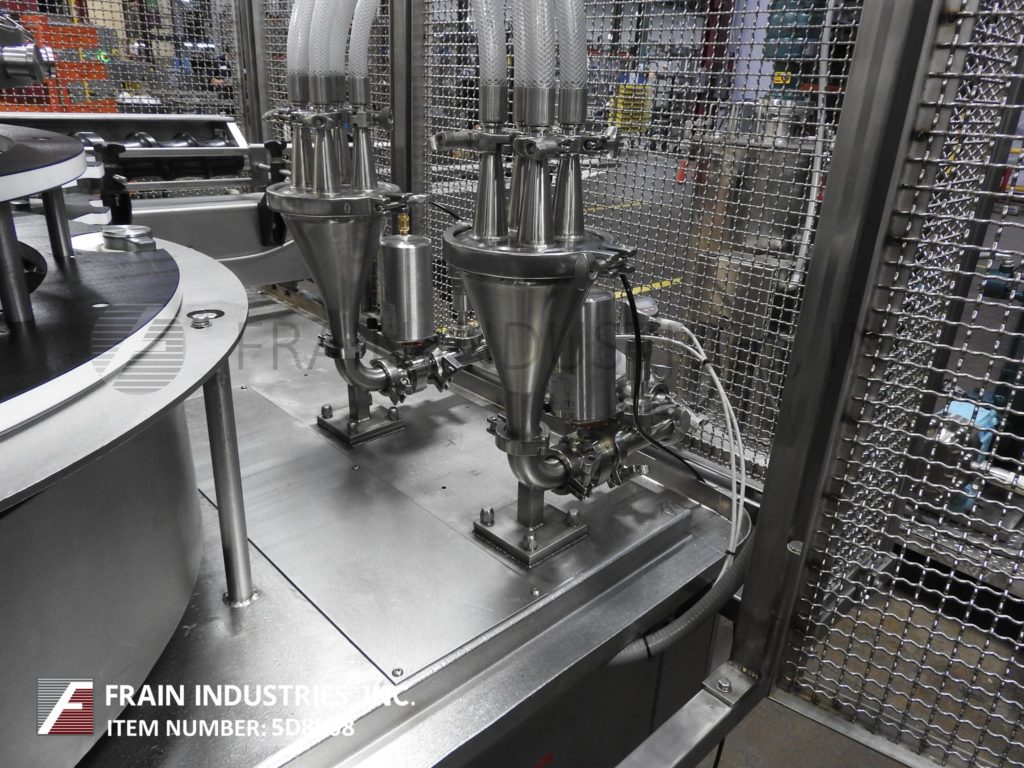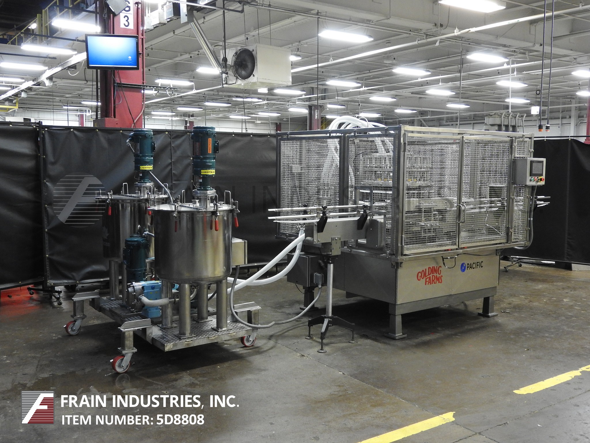 返回所有设备自动,不锈钢,双组分灌装,16头,旋转,积极置换灌装能力50至250瓶每分钟。瓶子:高达4"直径x (6" - 12") H.有6"节距,蜗杆,星轮在饲料/排放,105"长x 3 1/4"W输送机框架,18加仑产品储罐,Waukesha 30产品泵,积极关闭喷嘴。不锈钢接触部件。最后一瓶16盎司的沙拉酱。