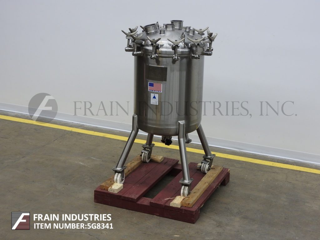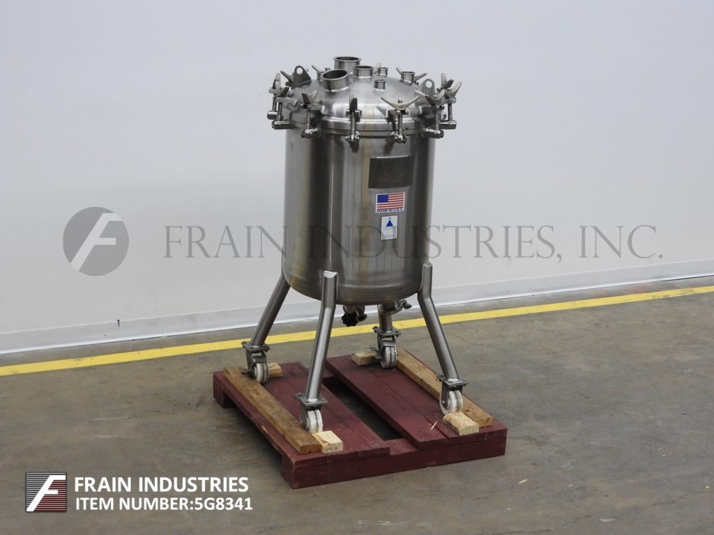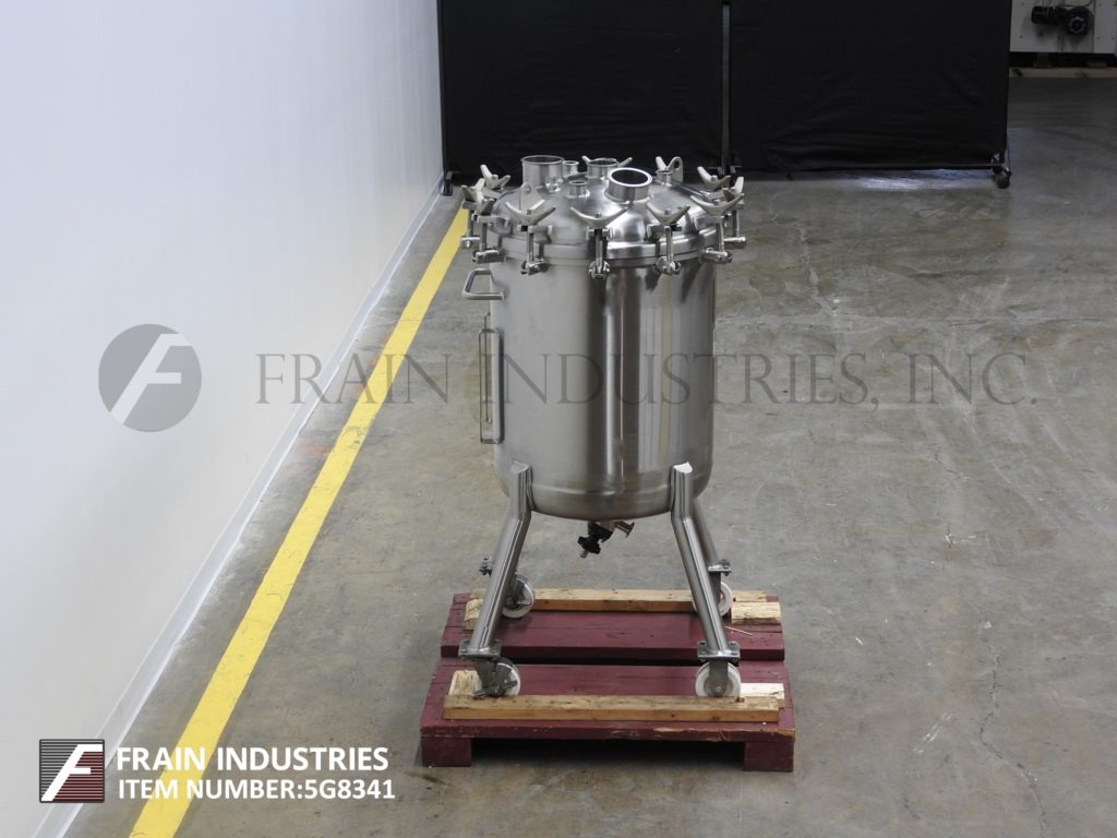 返回所有设备精密不锈钢,200升容量,316L不锈钢真空工艺罐。容器尺寸:25"直径x 30"直壁。配有螺栓下圆顶,碟底,底部磁性支柱搅拌和底部中心2"外径/ 1" ID三夹式放电与14"地间隙。安装在(4)带锁定脚轮的管状腿上。