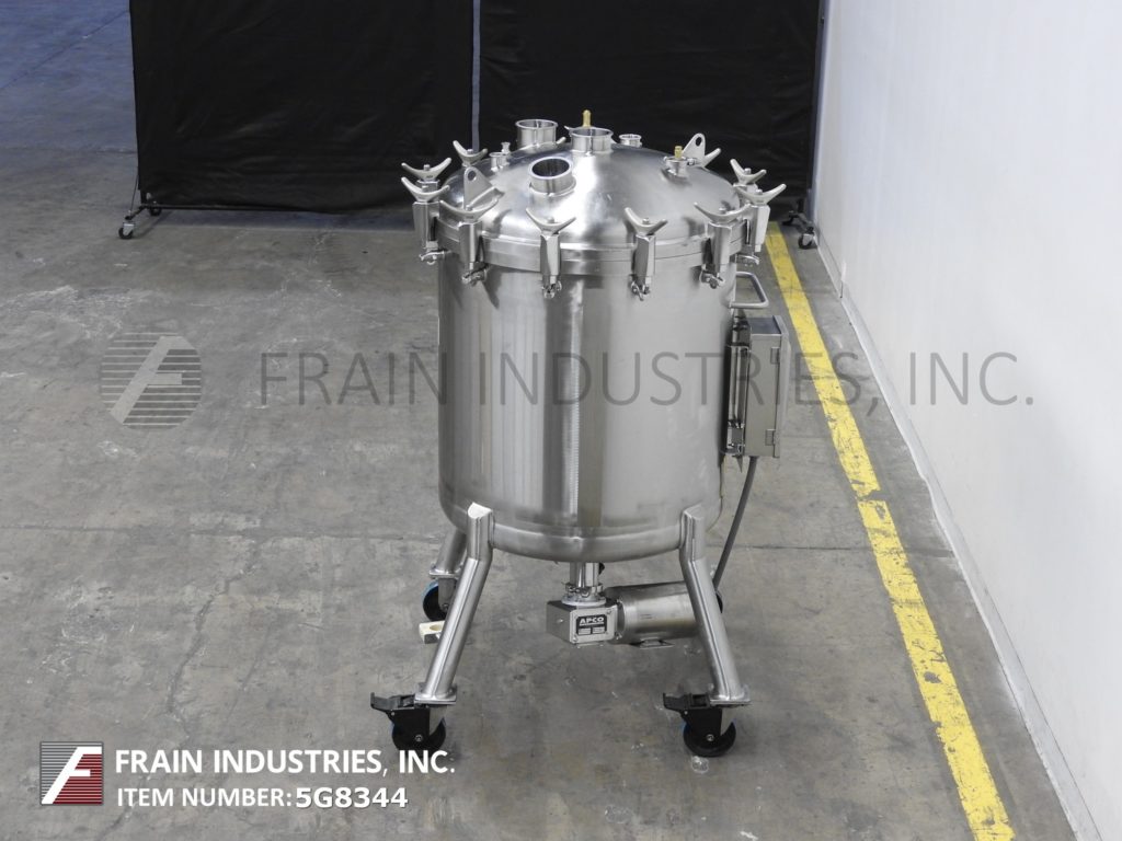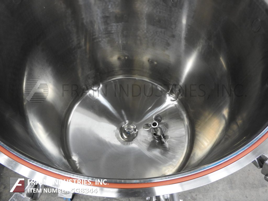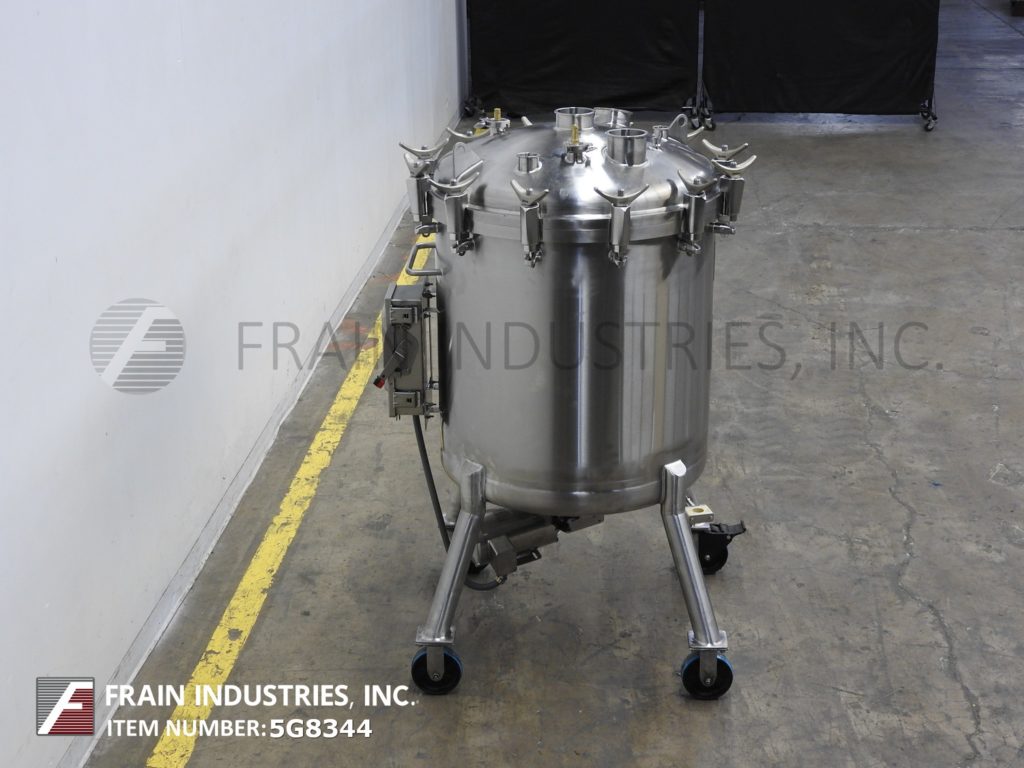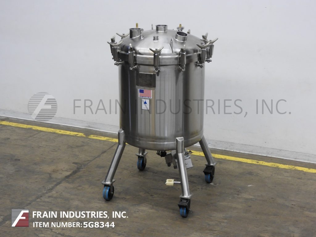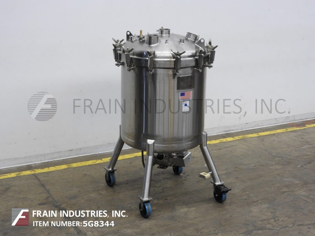 返回所有设备精密不锈钢,350升容量,316L不锈钢真空工艺罐。船舶尺寸:32“直径X 32”直壁。配有螺栓圆顶顶部,底部,底部磁性支架搅拌由¾HP驱动器和底部中心2“OD / 1”ID Tri-Clamp风格排放,带15“地间隙。安装在(4)管腿带锁定脚轮。