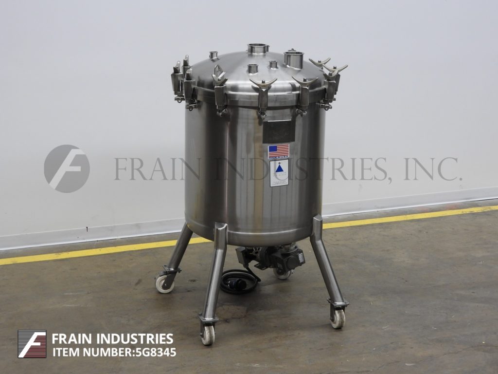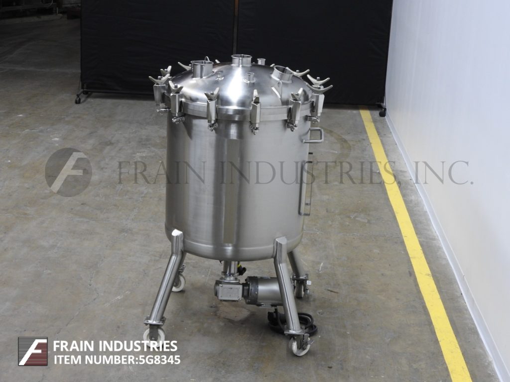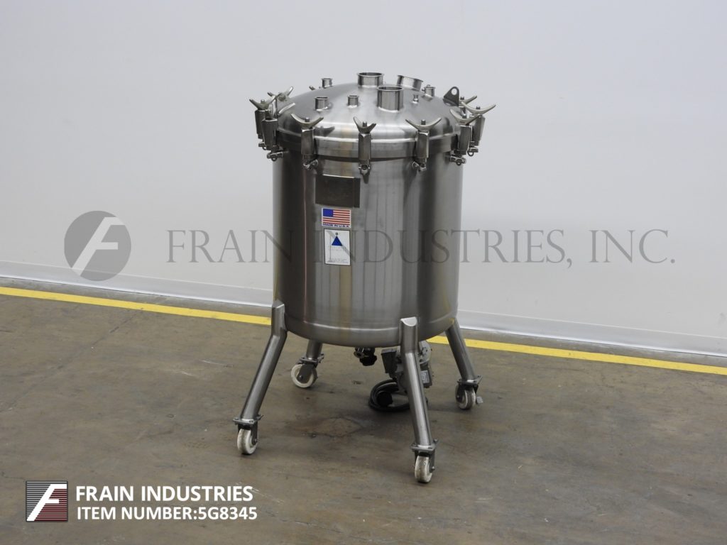 返回所有设备精密不锈钢,350升容量,316L不锈钢真空工艺罐。船舶尺寸:32“直径X 32”直壁。配有螺栓圆顶顶部,底部,底部磁性支架搅拌由¾HP驱动器和底部中心2“OD / 1”ID Tri-Clamp风格排放,带15“地间隙。安装在(4)管腿带锁定脚轮。
