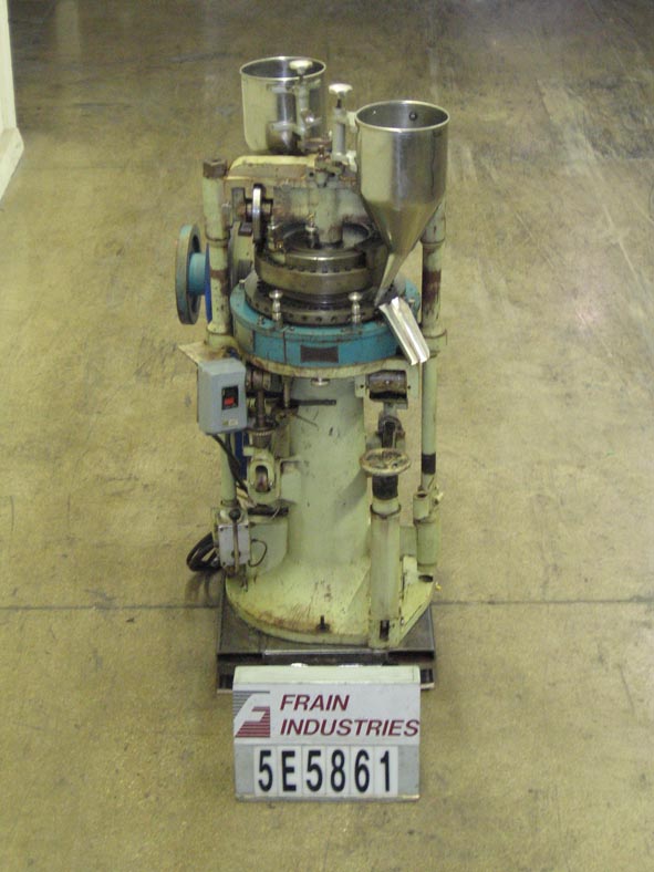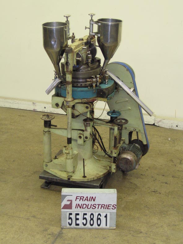 Back to All EquipmentAutomatic, 35 station rotary tablet press capable of speeds from 1325 to 2725 tpm depending on size, shape and depth of tablet. Has maximum operating pressure of 6.5 tons and maximum tablet diameter round of: 5/8", maximum tablet diameter capsule of: 3/4", and maximum fill depth of: 11/16". Currently set for a single layer tablet with 3/4" dia keyed upper diameter plate and 1-1/8" dia die on lower plate, dual stainless steel product feed hoppers and a vari-speed belt drive, with push button start / stop controls. Mounted on a forkable base stand. Customer to supply tooling.