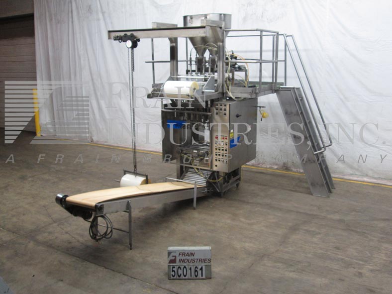 Back to All EquipmentProdo Pak Model 1000HFF2, Form, Fill & seal machine with number of pouches per minute – depending on materials and application. (4) sided seal bag up to 22-1/2" wide x 18" long. Equipped with dual auger feeders and webs, currently set for supported film and has (2) 8" diameter (192oz) pistons with manifold for single or multiple pouch filling, electric eye registration, bag deflator, 20" maximum roll diameter on 3" core. Control package has PLC controller. Mounted on a stainless steel platform with access ladder. Last filling 5 to 20 pound pasta sauce in an institutional size bag.